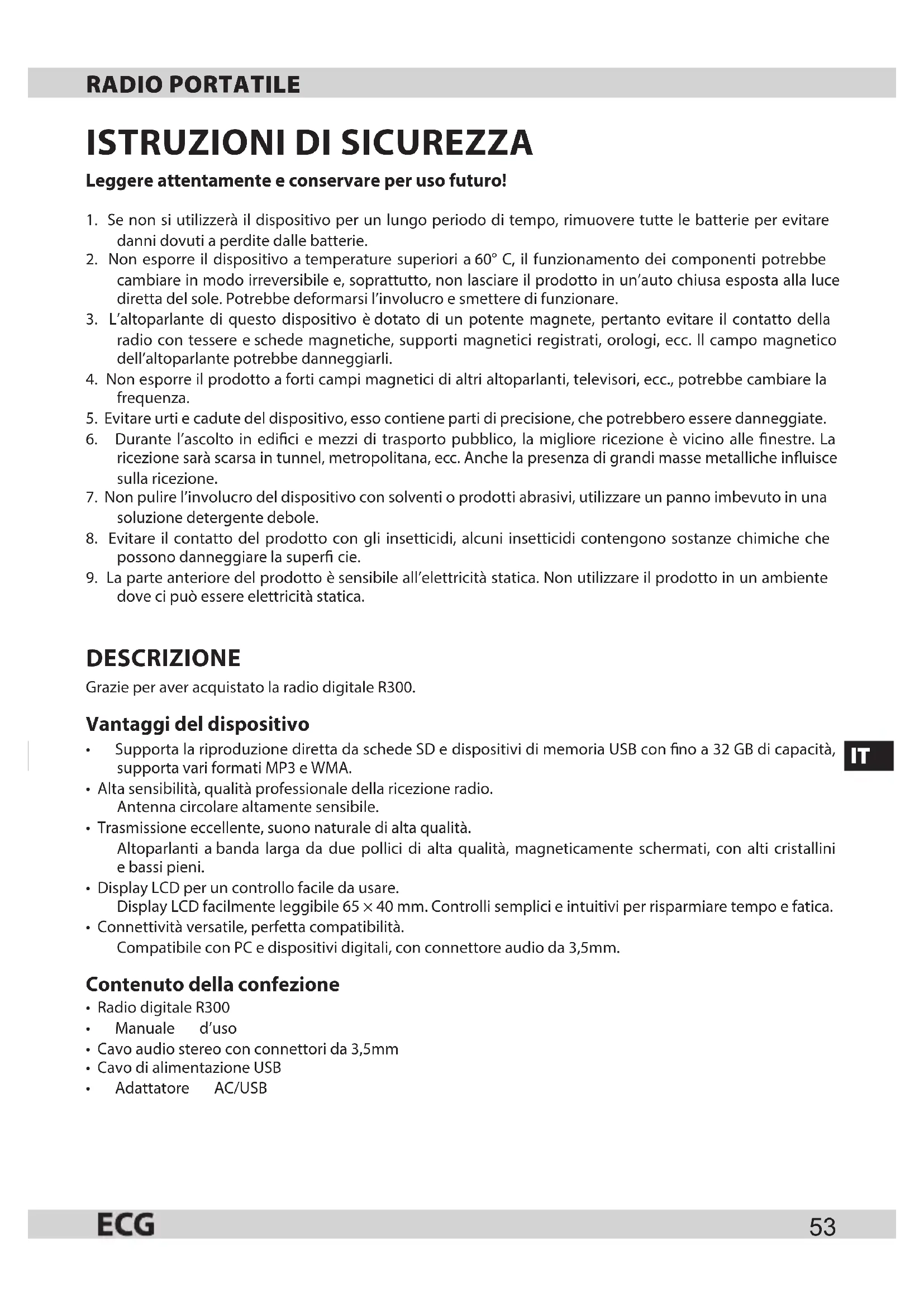 Scarica le istruzioni per il tuo Radio in formato PDF gratuitamente! Trova il tuo manuale R 300 U - ECG e riprendi in mano il tuo dispositivo elettronico. In questa pagina sono pubblicati tutti i documenti necessari per l'utilizzo del tuo dispositivo. R 300 U del marchio ECG.
