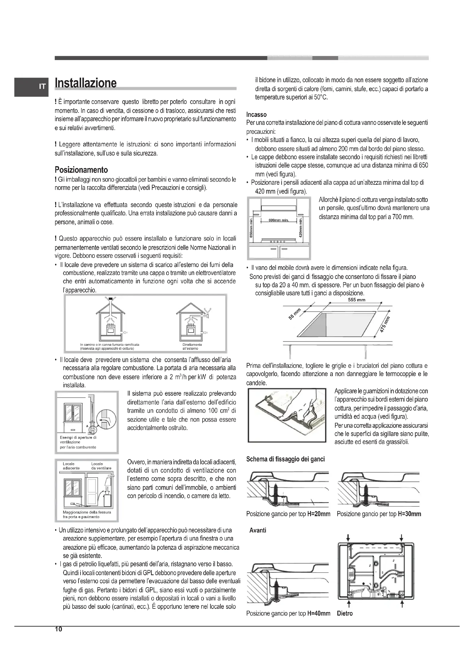 Installazione ! È importante conservare questo libretto per poterlo consultare in ogni momento. In caso di vendita, di cessione o di trasloco, assicurarsi che resti insieme all’apparecchio per informare il nuovo proprietario sul funzionamento e sui relativi avvertimenti. ! Leggere attentamente le istruzioni: ci sono importanti informazioni sull’installazione, sull’uso e sulla sicurezza. Posizionamento ! Gli imballaggi non sono giocattoli per bambini e vanno eliminati secondo le norme per la raccolta differenziata (vedi Precauzioni e consigli). ! L’installazione va effettuata secondo queste istruzioni e da personale professionalmente qualicato. Una errata installazione può causare danni a persone, animali o cose. ! Questo apparecchio può essere installato e funzionare solo in locali permanentemente ventilati secondo le prescrizioni delle Norme Nazionali in vigore. Debbono essere osservati i seguenti requisiti: