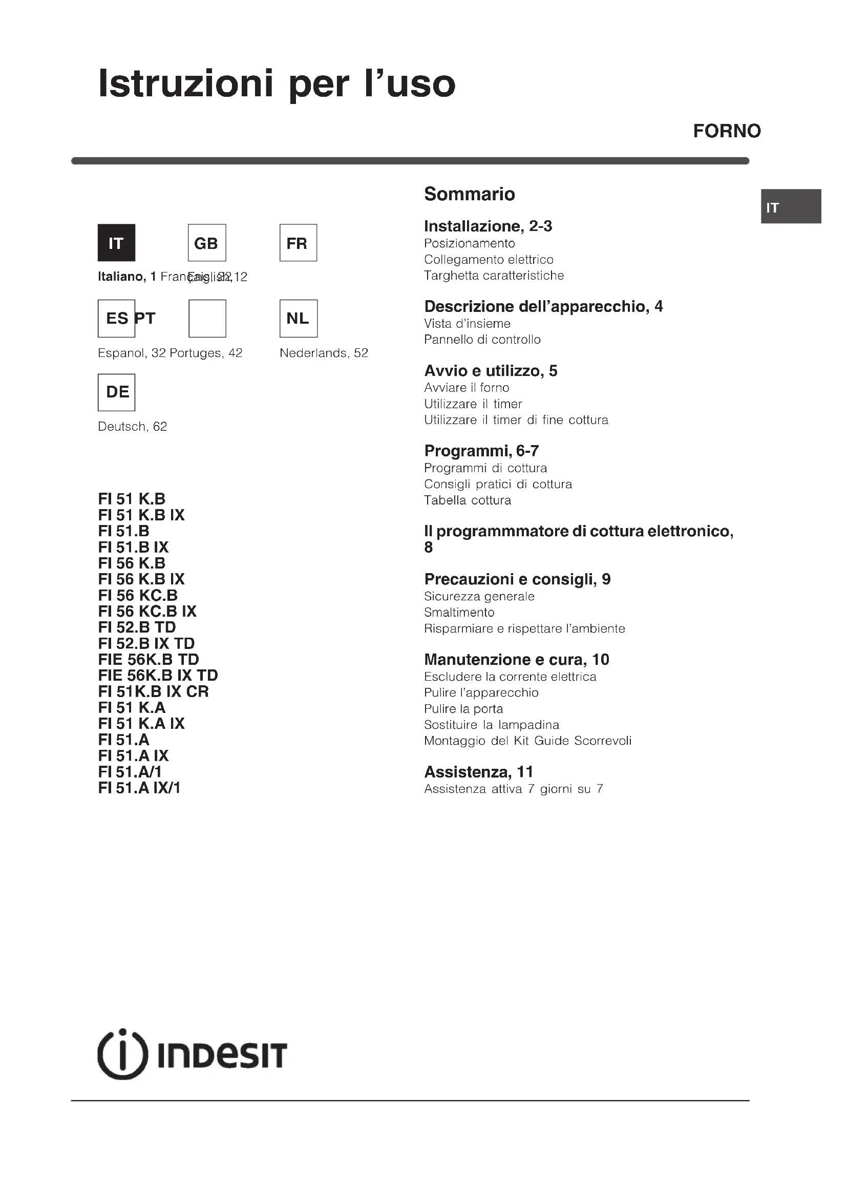 - Il numero di serie (S/N) Queste ultime informazioni si trovano sulla targhetta caratteristiche posta sull’apparecchio Assistenza attiva 7 giorni su 7 In caso di necessità d’intervento chiamare il Numero Unico Nazionale 199.199.199*. Un operatore sarà a completa disposizione per fissare un appuntamento con il Centro Assistenza Tecnico Autorizzato più vicino al luogo da cui si chiama. È attivo 7 giorni su 7, sabato e domenica compresi, e non lascia mai inascoltata una richiesta. *Al costo di 14,26 centesimi di Euro al minuto(iva inclusa) dal Lun. al Ven. dalle 08:00 alle 18:30, il Sab. dalle 08:00 alle 13:00 e di 5,58 centesimi di Euro al minuto (iva inclusa) dal Lun. al Ven. dalle 18:30 alle 08:00, il Sab. dalle 13:00 alle 08:00 e i giorni festivi, per chi chiama da telefono fisso. Per chi chiama da radiomobile le tariffe sono legate al piano tariffario dell’operatore telefonico utilizzato. Le suddette tariffe potrebbero essere soggette a variazione da parte dell’operatore telefonico; per maggiori informazioni consultare il sito www.indesit.com.FI 51 K.B FI 51 K.B IX FI 51.B FI 51.B IX FI 56 K.B FI 56 K.B IX FI 56 KC.B FI 56 KC.B IX FI 52.B TD FI 52.B IX TD