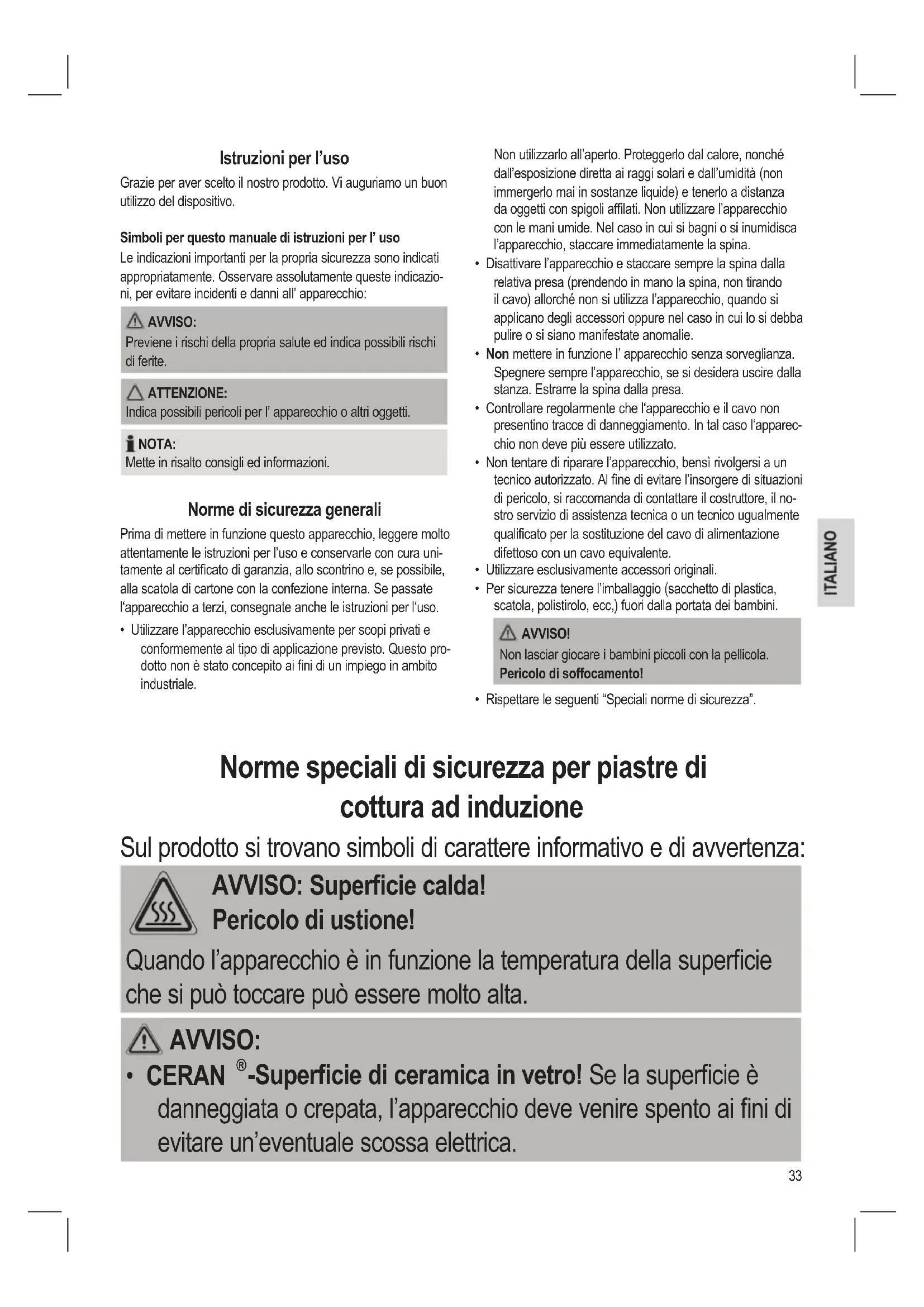 -Supercie di ceramica in vetro! Se la supercie è danneggiata o crepata, l’apparecchio deve venire spento ai ni di evitare un’eventuale scossa elettrica.34 AVVISO: