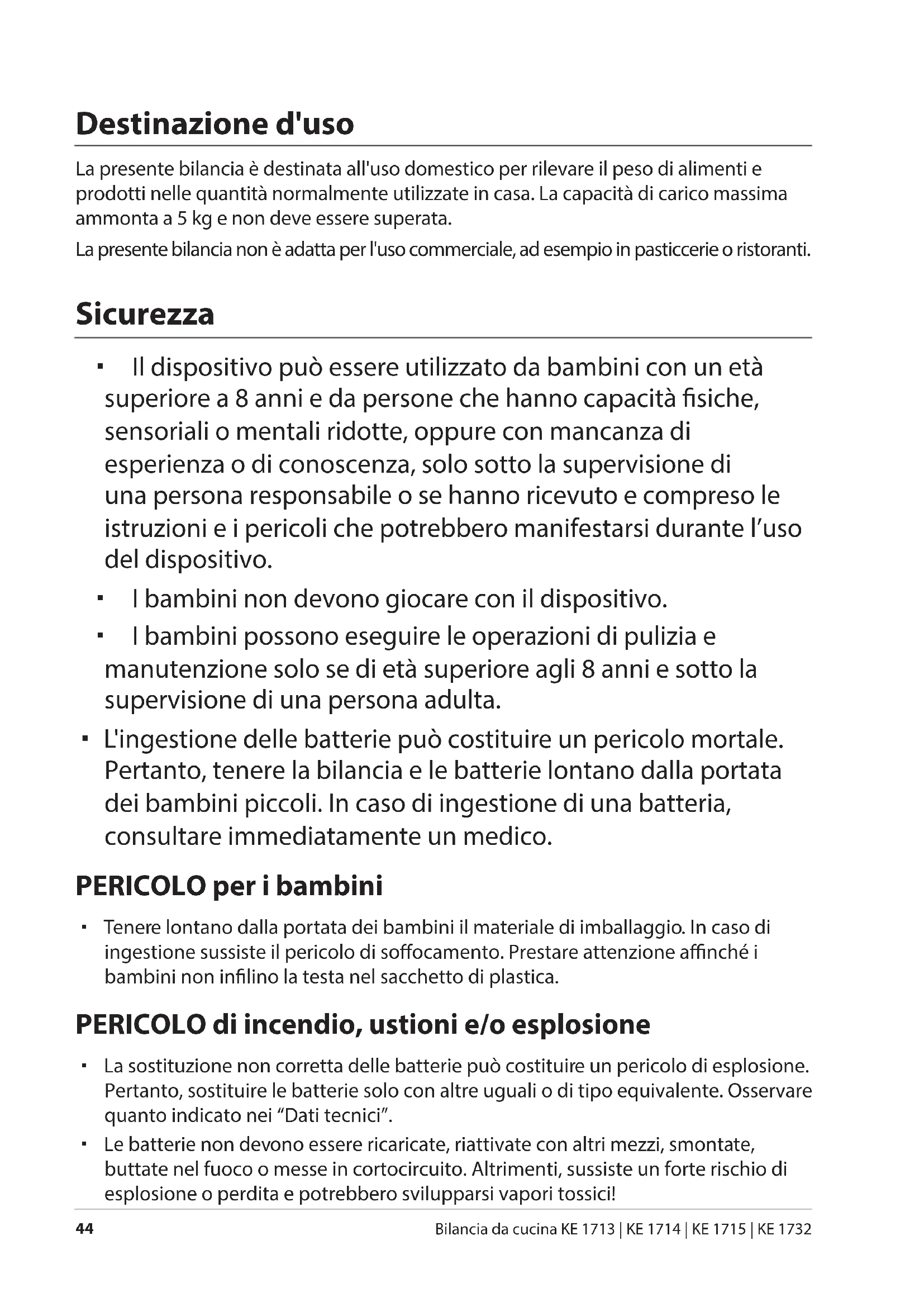 Bilancia da cucina KE 1713 | KE 1714 | KE 1715 | KE 1732 Destinazione d'uso La presente bilancia è destinata all'uso domestico per rilevare il peso di alimenti e prodotti nelle quantità normalmente utilizzate in casa. La capacità di carico massima ammonta a 5 kg e non deve essere superata. La presente bilancia non è adatta per l'uso commerciale, ad esempio in pasticcerie o ristoranti. Sicurezza Il dispositivo può essere utilizzato da bambini con un età superiore a 8 anni e da persone che hanno capacità siche, sensoriali o mentali ridotte, oppure con mancanza di esperienza o di conoscenza, solo sotto la supervisione di una persona responsabile o se hanno ricevuto e compreso le istruzioni e i pericoli che potrebbero manifestarsi durante l’uso del dispositivo. I bambini non devono giocare con il dispositivo. I bambini possono eseguire le operazioni di pulizia e manutenzione solo se di età superiore agli 8 anni e sotto la supervisione di una persona adulta. L'ingestione delle batterie può costituire un pericolo mortale. Pertanto, tenere la bilancia e le batterie lontano dalla portata dei bambini piccoli. In caso di ingestione di una batteria, consultare immediatamente un medico. PERICOLO per i bambini Tenere lontano dalla portata dei bambini il materiale di imballaggio. In caso di ingestione sussiste il pericolo di soocamento. Prestare attenzione anché i bambini non inlino la testa nel sacchetto di plastica. PERICOLO di incendio, ustioni e/o esplosione La sostituzione non corretta delle batterie può costituire un pericolo di esplosione. Pertanto, sostituire le batterie solo con altre uguali o di tipo equivalente. Osservare quanto indicato nei “Dati tecnici”. Le batterie non devono essere ricaricate, riattivate con altri mezzi, smontate, buttate nel fuoco o messe in cortocircuito. Altrimenti, sussiste un forte rischio di esplosione o perdita e potrebbero svilupparsi vapori tossici!Sicurezza