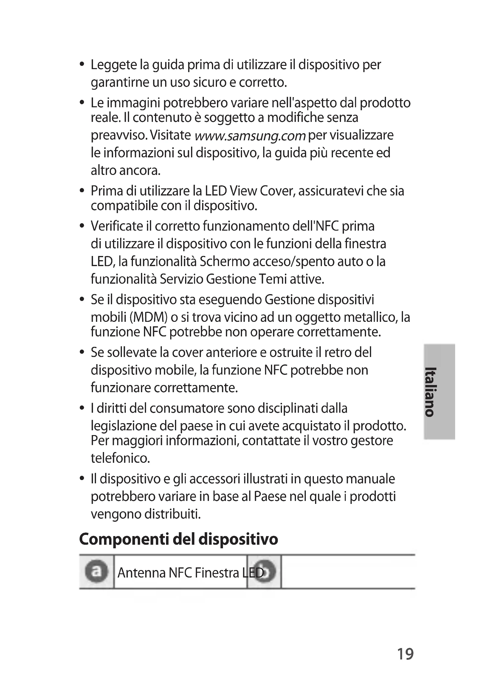 Accessori, quindi utilizzate la funzionalità di modifica dell'icona LED. Inoltre, potete utilizzare l'applicazione per la modifica dell'icona LED che compare quando applicate la LED View Cover al dispositivo mobile. Precauzioni di sicurezza Leggete tutte le informazioni sulla sicurezza prima di utilizzare il dispositivo per garantirne un uso sicuro e corretto. Per visualizzare le precauzioni sulla sicurezza complete, visitate il sito Web Samsung. Utilizzate batterie, caricabatteria, accessori e forniture approvate dal produttore Non toccate il dispositivo con mani bagnate Non lasciate cadere e non urtate il caricabatteria né il dispositivo Il dispositivo può essere utilizzato in luoghi ad una temperatura ambientale compresa tra 0 °C e 35 °C. Il dispositivo può essere conservato ad una temperatura ambientale compresa tra -20 °C e 50 °C. L'utilizzo o la conservazione del dispositivo al di fuori degli intervalli di temperatura raccomandati potrebbe danneggiare il dispositivo o ridurre la durata di vita della batteria Evitate che il connettore multifunzione e l'estremità del caricabatteria entrino a contatto con materiali conduttori, come liquidi, polvere, polveri di metallo e mine di matite22 Evitate il masticamento o l'ingestione del dispositivo da parte di bambini o animali Non smontate, modificate o riparate il dispositivo Smaltimento corretto Il marchio riportato sul prodotto, sugli accessori o sulla documentazione indica che il prodotto e i relativi accessori elettronici (quali caricabatteria, auricolare, cavo USB) non devono essere smaltiti con altri rifiuti domestici. Per informazioni relative all'impegno di Samsung verso l'ambiente e per gli adempimenti di legge specifici per il prodotto, ad esempio REACH, WEEE, Batterie, consultate il sito Web samsung.com/uk/aboutsamsung/samsungelectronics/ corporatecitizenship/data_corner.html Dichiarazione di Conformità Samsung Electronics dichiara che questo dispositivo è conforme ai requisiti essenziali ed alle disposizioni pertinenti della Direttiva 2014/53/EU. Visitate il sito www.samsung.com/mobile_doc per visualizzare la Dichiarazione di Conformità. Banda e modalità Banda e modalità Potenza in uscita NFC 13,56 MHz Campo H pari a 42 dBuA/m a 10 m23 Español