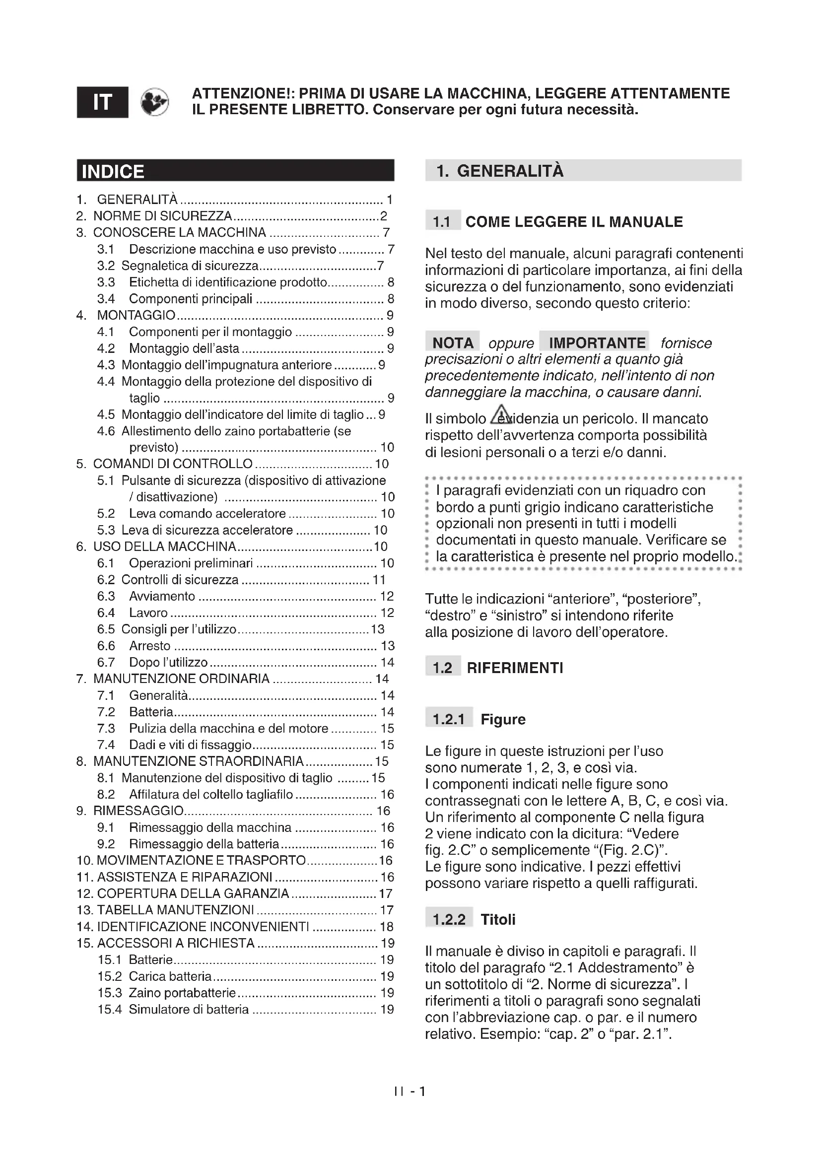 Questa macchina è una attrezzatura da giardinaggio e precisamente un tagliaerba/ tagliabordi portatile alimentato a batteria. La macchina si compone essenzialmente di un motore che tramite un albero di trasmissione aziona un dispositivo di taglio (testina porta lo). Il dispositivo di taglio opera su un piano approssimativamente parallelo al terreno (nel caso di utilizzo come tagliaerba) o approssimativamente perpendicolare al terreno (nel caso di utilizzo come tagliabordi). L’operatore può azionare i comandi principali mantenendosi sempre a distanza di sicurezza dal dispositivo di taglio.