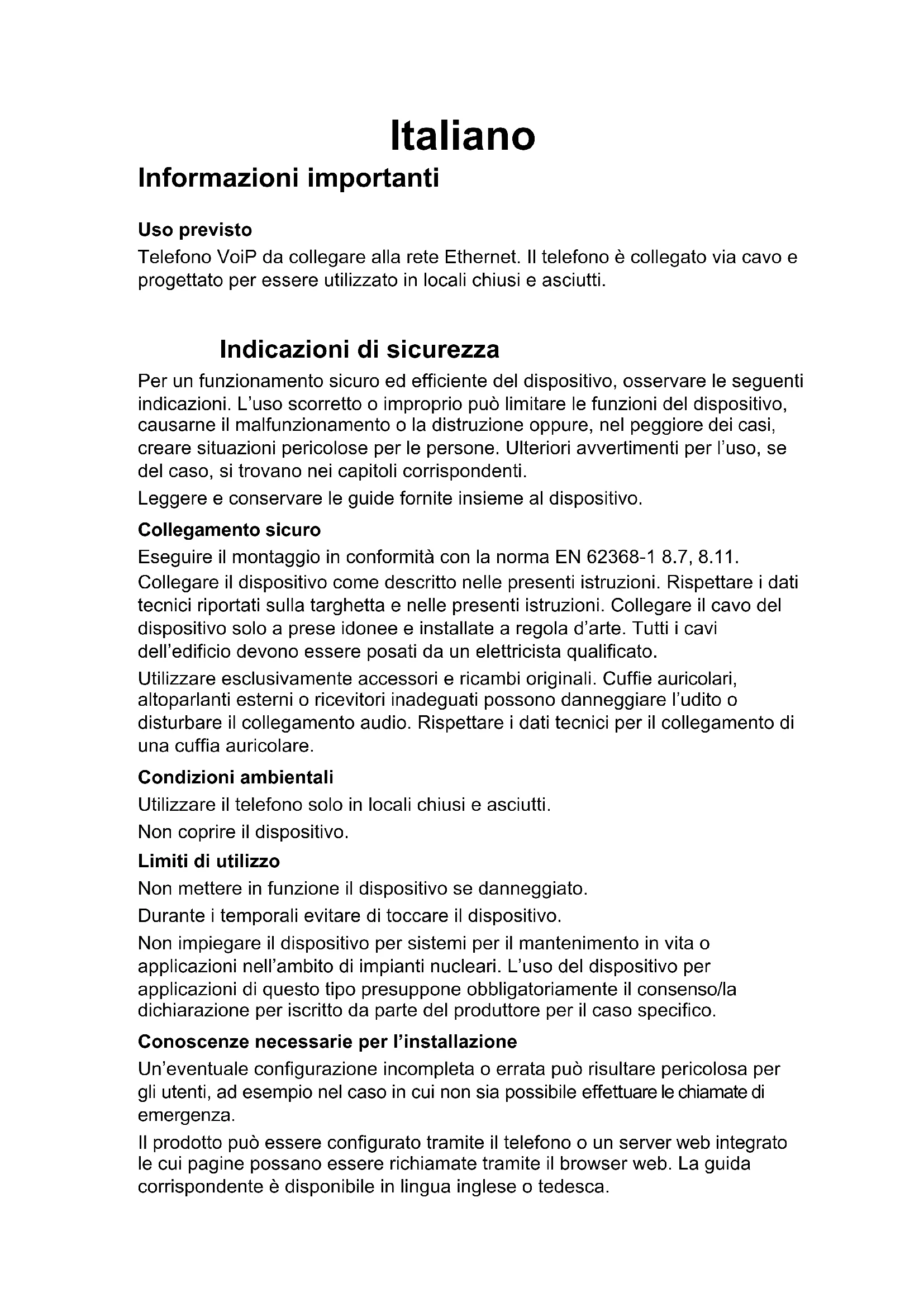 - Modifiez immédiatement le mot de passe sous Utilisateur. Remarque : vous trouverez de plus amples informations (notamment concernant la configuration d’une identité) dans l’Aide en ligne. Système de télécommunication Fournisseur VoIP Nom d’utilisateur SIP Les numéros de téléphone internes configurés pour l’appareil Exemple : 557 Le nom d’utilisateur configuré pour le compte Exemple : numero@fournisseur.fr Mot de passe Le mot de passe correspondant Le mot de passe correspondant Registre SIP L’adresse IP du système de télécommunication Exemple : 192.168.196.37 L’URL du fournisseur VoIP Exemple : NomFournisseur.frItaliano Informazioni importanti Uso previsto Telefono VoiP da collegare alla rete Ethernet. Il telefono è collegato via cavo e progettato per essere utilizzato in locali chiusi e asciutti. Indicazioni di sicurezza Per un funzionamento sicuro ed efficiente del dispositivo, osservare le seguenti indicazioni. L’uso scorretto o improprio può limitare le funzioni del dispositivo, causarne il malfunzionamento o la distruzione oppure, nel peggiore dei casi, creare situazioni pericolose per le persone. Ulteriori avvertimenti per l’uso, se del caso, si trovano nei capitoli corrispondenti. Leggere e conservare le guide fornite insieme al dispositivo. Collegamento sicuro Eseguire il montaggio in conformità con la norma EN 62368-1 8.7, 8.11. Collegare il dispositivo come descritto nelle presenti istruzioni. Rispettare i dati tecnici riportati sulla targhetta e nelle presenti istruzioni. Collegare il cavo del dispositivo solo a prese idonee e installate a regola d’arte. Tutti i cavi dell’edificio devono essere posati da un elettricista qualificato. Utilizzare esclusivamente accessori e ricambi originali. Cuffie auricolari, altoparlanti esterni o ricevitori inadeguati possono danneggiare l’udito o disturbare il collegamento audio. Rispettare i dati tecnici per il collegamento di una cuffia auricolare. Condizioni ambientali Utilizzare il telefono solo in locali chiusi e asciutti. Non coprire il dispositivo. Limiti di utilizzo Non mettere in funzione il dispositivo se danneggiato. Durante i temporali evitare di toccare il dispositivo. Non impiegare il dispositivo per sistemi per il mantenimento in vita o applicazioni nell’ambito di impianti nucleari. L’uso del dispositivo per applicazioni di questo tipo presuppone obbligatoriamente il consenso/la dichiarazione per iscritto da parte del produttore per il caso specifico. Conoscenze necessarie per l’installazione Un’eventuale configurazione incompleta o errata può risultare pericolosa per gli utenti, ad esempio nel caso in cui non sia possibile effettuare le chiamate di emergenza. Il prodotto può essere configurato tramite il telefono o un server web integrato le cui pagine possano essere richiamate tramite il browser web. La guida corrispondente è disponibile in lingua inglese o tedesca.In caso di scarsa padronanza di tali lingue e dei termini tecnici utilizzati, rivolgersi a un tecnico con conoscenze linguistiche adeguate. Riparazione Non aprire il dispositivo. Solo il produttore può aprire e riparare il dispositivo. Pulizia Attenzione: La penetrazione di liquidi nel dispositivo può danneggiarlo o distruggerlo.