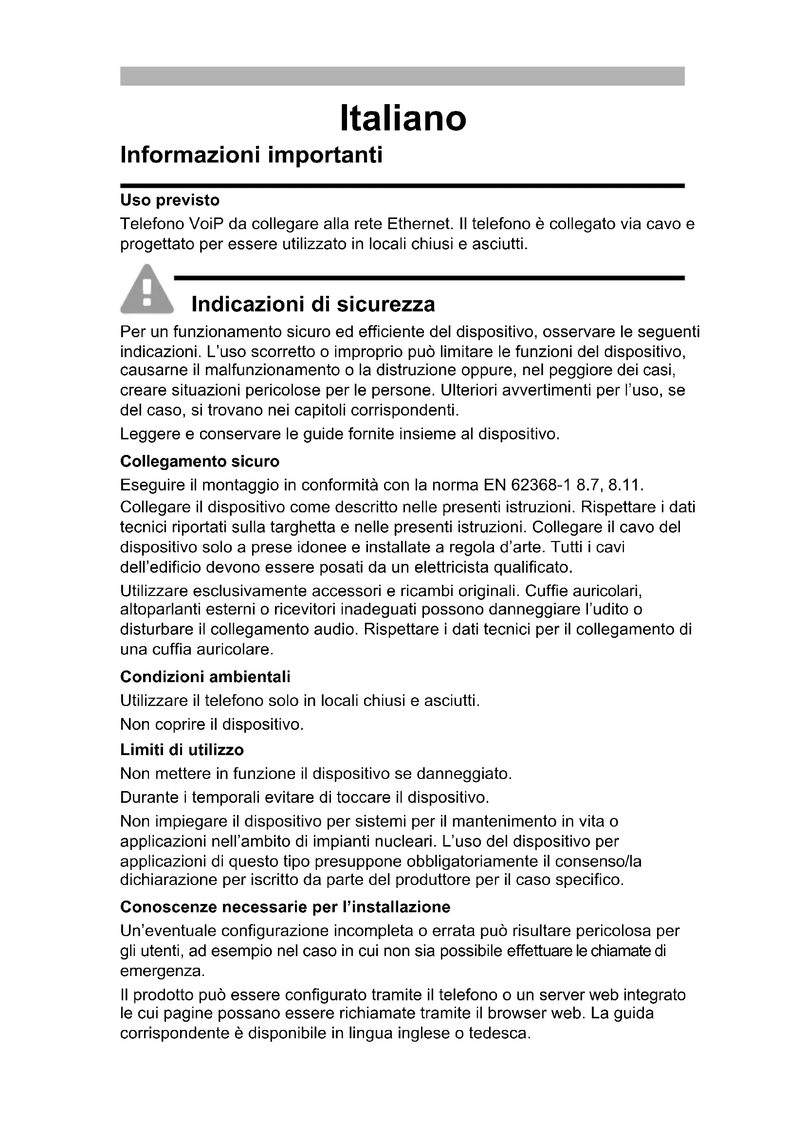 - Modifiez immédiatement le mot de passe sous Utilisateur. Remarque : vous trouverez de plus amples informations (notamment concernant la configuration d’une identité) dans l’Aide en ligne. Système de télécommunication Fournisseur VoIP Nom d’utilisateur SIP Les numéros de téléphone internes configurés pour l’appareil Exemple : 557 Le nom d’utilisateur configuré pour le compte Exemple : numero@fournisseur.fr Mot de passe Le mot de passe correspondant Le mot de passe correspondant Registre SIP L’adresse IP du système de télécommunication Exemple : 192.168.196.37 L’URL du fournisseur VoIP Exemple : NomFournisseur.frItaliano Informazioni importanti Uso previsto Telefono VoiP da collegare alla rete Ethernet. Il telefono è collegato via cavo e progettato per essere utilizzato in locali chiusi e asciutti. Indicazioni di sicurezza Per un funzionamento sicuro ed efficiente del dispositivo, osservare le seguenti indicazioni. L’uso scorretto o improprio può limitare le funzioni del dispositivo, causarne il malfunzionamento o la distruzione oppure, nel peggiore dei casi, creare situazioni pericolose per le persone. Ulteriori avvertimenti per l’uso, se del caso, si trovano nei capitoli corrispondenti. Leggere e conservare le guide fornite insieme al dispositivo. Collegamento sicuro Eseguire il montaggio in conformità con la norma EN 62368-1 8.7, 8.11. Collegare il dispositivo come descritto nelle presenti istruzioni. Rispettare i dati tecnici riportati sulla targhetta e nelle presenti istruzioni. Collegare il cavo del dispositivo solo a prese idonee e installate a regola d’arte. Tutti i cavi dell’edificio devono essere posati da un elettricista qualificato. Utilizzare esclusivamente accessori e ricambi originali. Cuffie auricolari, altoparlanti esterni o ricevitori inadeguati possono danneggiare l’udito o disturbare il collegamento audio. Rispettare i dati tecnici per il collegamento di una cuffia auricolare. Condizioni ambientali Utilizzare il telefono solo in locali chiusi e asciutti. Non coprire il dispositivo. Limiti di utilizzo Non mettere in funzione il dispositivo se danneggiato. Durante i temporali evitare di toccare il dispositivo. Non impiegare il dispositivo per sistemi per il mantenimento in vita o applicazioni nell’ambito di impianti nucleari. L’uso del dispositivo per applicazioni di questo tipo presuppone obbligatoriamente il consenso/la dichiarazione per iscritto da parte del produttore per il caso specifico. Conoscenze necessarie per l’installazione Un’eventuale configurazione incompleta o errata può risultare pericolosa per gli utenti, ad esempio nel caso in cui non sia possibile effettuare le chiamate di emergenza. Il prodotto può essere configurato tramite il telefono o un server web integrato le cui pagine possano essere richiamate tramite il browser web. La guida corrispondente è disponibile in lingua inglese o tedesca.In caso di scarsa padronanza di tali lingue e dei termini tecnici utilizzati, rivolgersi a un tecnico con conoscenze linguistiche adeguate. Riparazione Non aprire il dispositivo. Solo il produttore può aprire e riparare il dispositivo. Pulizia Attenzione: La penetrazione di liquidi nel dispositivo può danneggiarlo o distruggerlo.