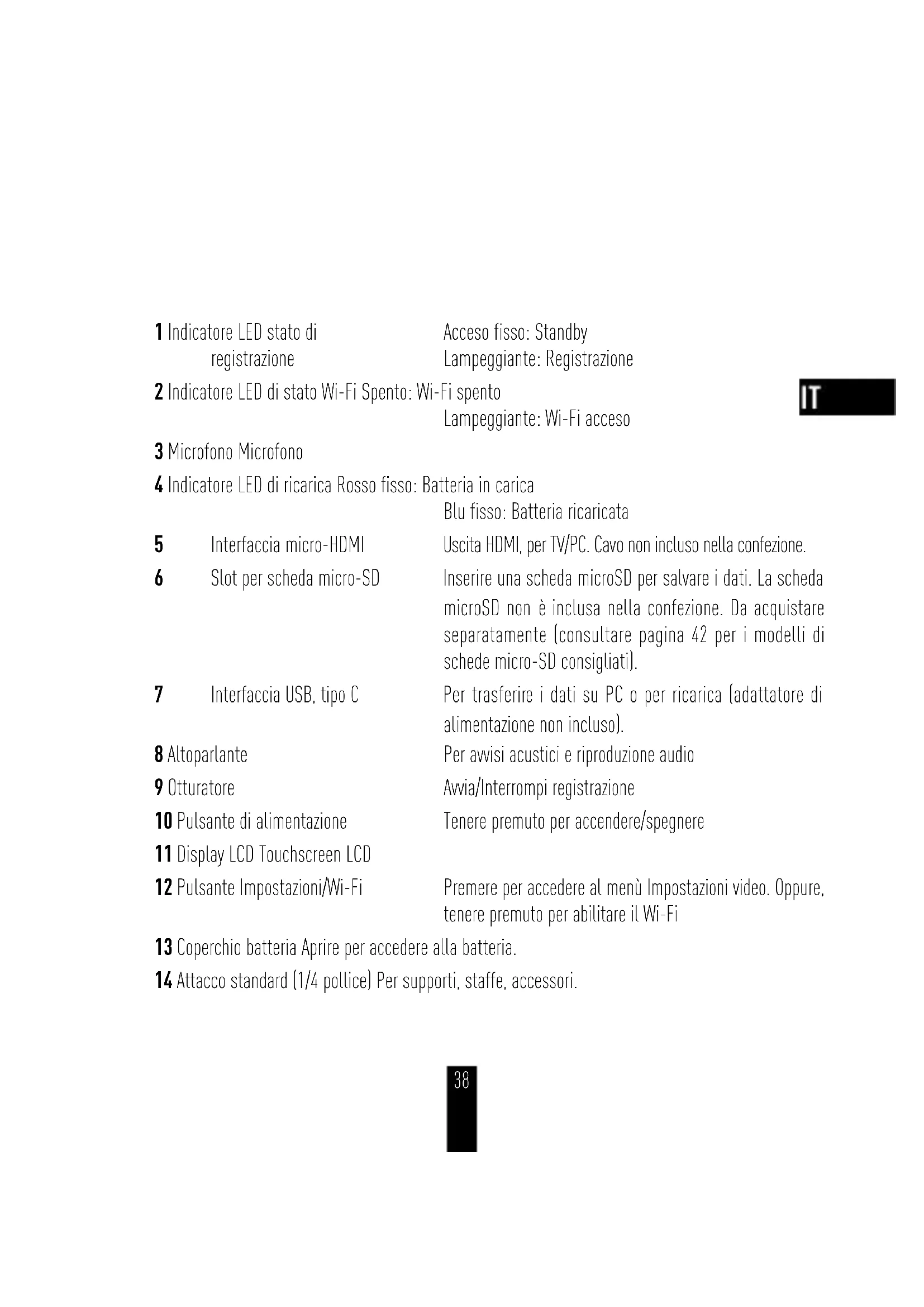371 Indicatore LED stato di registrazione Acceso fisso: Standby Lampeggiante: Registrazione 2 Indicatore LED di stato Wi-Fi Spento: Wi-Fi spento Lampeggiante: Wi-Fi acceso 3 Microfono Microfono 4 Indicatore LED di ricarica Rosso fisso: Batteria in carica Blu fisso: Batteria ricaricata 5 Interfaccia micro-HDMI Uscita HDMI, per TV/PC. Cavo non incluso nella confezione. 6 Slot per scheda micro-SD Inserire una scheda microSD per salvare i dati. La scheda microSD non è inclusa nella confezione. Da acquistare separatamente (consultare pagina 42 per i modelli di schede micro-SD consigliati). 7 Interfaccia USB, tipo C Per trasferire i dati su PC o per ricarica (adattatore di alimentazione non incluso). 8 Altoparlante Per avvisi acustici e riproduzione audio 9 Otturatore Avvia/Interrompi registrazione 10 Pulsante di alimentazione Tenere premuto per accendere/spegnere 11 Display LCD Touchscreen LCD 12 Pulsante Impostazioni/Wi-Fi Premere per accedere al menù Impostazioni video. Oppure, tenere premuto per abilitare il Wi-Fi 13 Coperchio batteria Aprire per accedere alla batteria. 14 Attacco standard (1/4 pollice) Per supporti, staffe, accessori. 38Introduzione al display 1 Stato della scheda micro-SD 6 Stato batteria 2 Visualizzazione live 7 Scorrere verso il basso per impostare i parametri 3 Toccare per selezione modalità (Video, Foto, Burst, Time Lapse) 8 Toccare per impostare altri parametri 4 Toccare per impostare la risoluzione 9 Toccare per impostare la frequenza fotogrammi 5 Stato Codec Video H.265 00:00:00 30FPS4K H.265