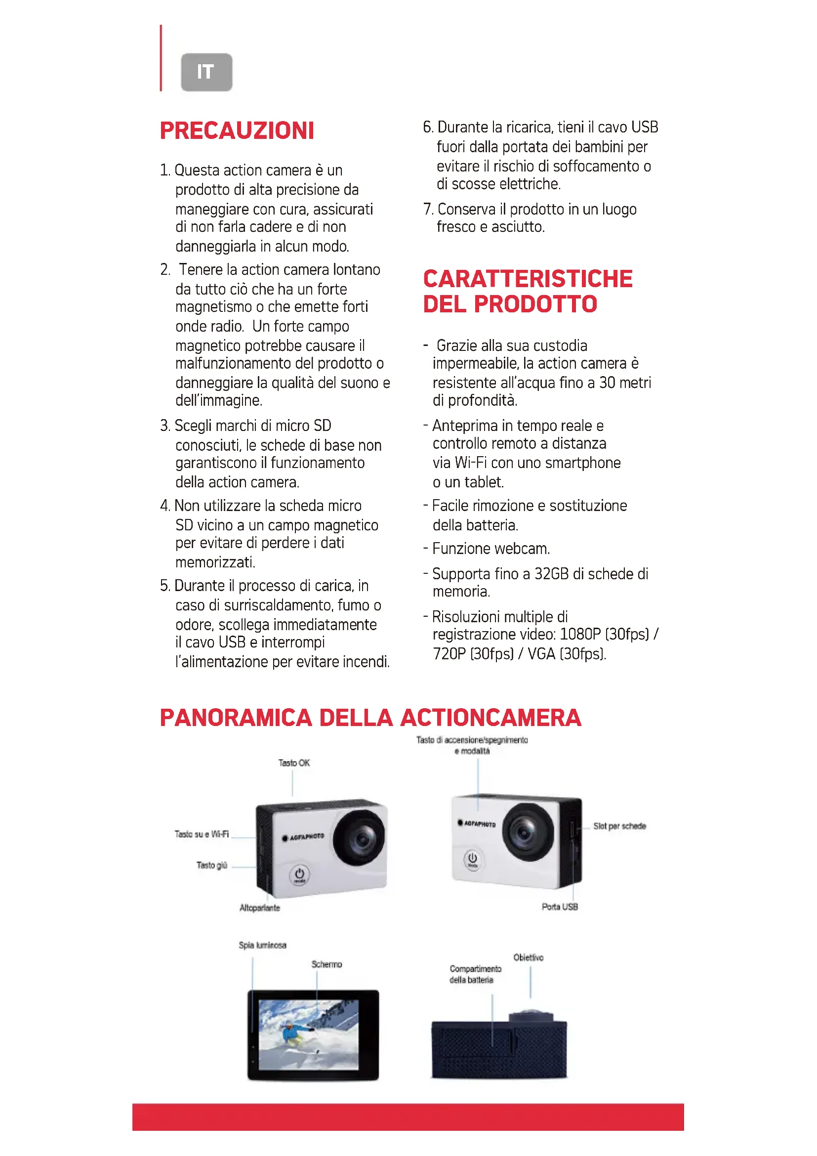 fresco e asciutto. CARATTERISTICHE DEL PRODOTTO - Grazie alla sua custodia impermeabile, la action camera è resistente all’acqua fino a 30 metri di profondità. - Anteprima in tempo reale e controllo remoto a distanza via Wi-Fi con uno smartphone o un tablet. - Facile rimozione e sostituzione della batteria. - Funzione webcam. - Supporta fino a 32GB di schede di memoria. - Risoluzioni multiple di registrazione video: 1080P (30fps) / 720P (30fps) / VGA (30fps).