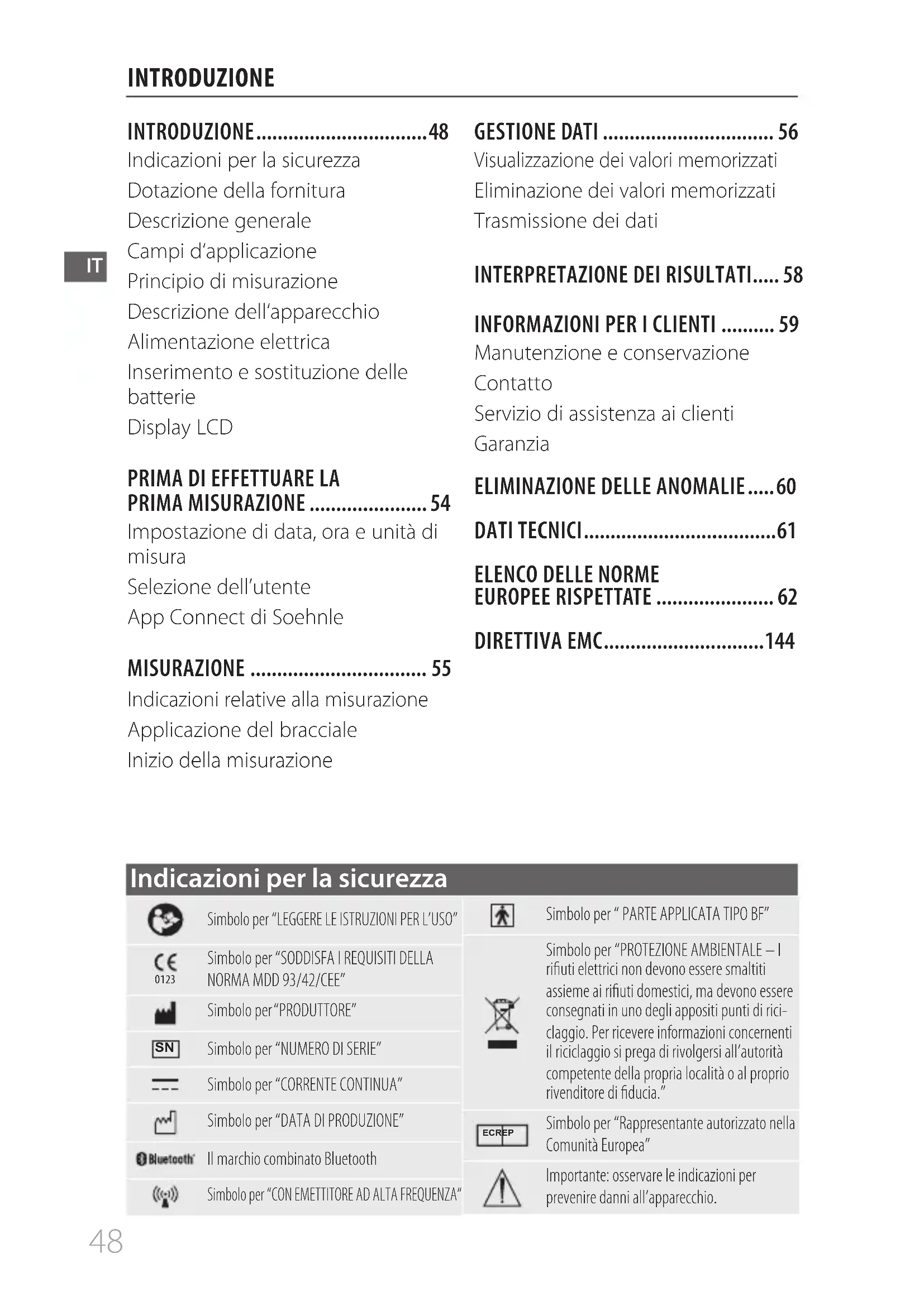 PRIMA MISURAZIONE ...................... 54 Impostazione di data, ora e unità di misura Selezione dell’utente App Connect di Soehnle MISURAZIONE ................................. 55 Indicazioni relative alla misurazione Applicazione del bracciale Inizio della misurazione GESTIONE DATI ................................ 56 Visualizzazione dei valori memorizzati Eliminazione dei valori memorizzati Trasmissione dei dati
