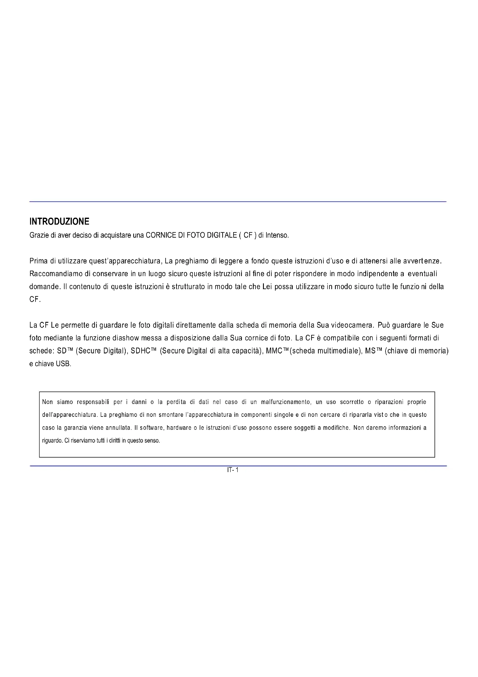 Avviso: Data e orario possono essere impostati esclusivamente nel menu Setup. Attivando il tasto [] sul retro della CF o il tasto OK sul telecomando si può cambiare tra la visualizzazione del calendario mensile, dell’orologio digitale e di quello analogico. Attivando i tasti [], [] sulla CF oppure i tasti , sul telecomando il calendario può procedere in avanti o indietro di rispettivamente un mese.IT- 21 DOMANDE FREQUENTI Per quale motivo la capacita reale di una scheda di memoria è inferiore a quella indicata sull„imballaggio ? L‟indicazione della capacità di memoria di un mezzo di memoria flash avviene in modo analogo rispetto all‟indicazione della capacità dei dischi fissi e sottosta alle direttive SI (International System of Units). Questo sistema non misura sulla base del sistema binario, in cui 1024 MB corrispondono ad un 1 GB. Lo standard SI misura in potenze da 1000, per cui ad esempio 1000 Megabyte danno 1 Gigabyte. Questo calcolo differente causa la differenza nell‟indicazione della capacità. Per quale motivo alcune immagini della mia scheda di memoria non vengono visualizzate dalla CF? Alcuni mezzi di memoria non molto diffuso non sono compatibili con la CF. La preghiamo di usare una scheda compatibile. La preghiamo di considerare che questa cornice d‟immagini può riprodurre esclusivamente foto con il formato del file“JPEG”. E„ inserita una scheda di memoria. La CF però non riesce a leggerla. Che cosa posso fare? Innanzitutto La preghiamo di controllare se questa scheda è compatibile con la CORNICE DI FOTO DIGITALE di Intenso. Verifichi dunque se la scheda è stata inserita in modo corretto nello slot della scheda. La preghiamo di voler anche considerare il fatto che l‟unico formato file supportato è “JPEG“. La preghiamo di voler considerare quanto segue: Alcune videocamere digitali non salvano le immagini nel formato standard JPEG. In questo caso La preghiamo di controllare nelle istruzioni d‟uso della Sua videocamera.IT- 22 Per quale motivo alcune immagini si caricano più rapidamente rispetto ad altre ? Immagini con una risoluzione superiore necessitano più tempo per essere visualizzate. Per aumentare la velocità di visualizzazione, La preghiamo di utilizzare immagini con una risoluzione ridotta. Avviso: La cornice di foto supporta una risoluzione fino a 8000*8000 Pixel. Per quale motivo il software non si avvia, anche se vi è l‟alimentazione della corrente e il tasto power è su “on”? Probabilmente si ha un errore di sistema. La preghiamo di riavviare il software, interrompendo l‟alimentazione della corrente per alcuni secondi. Per quale motivo sullo schermo non viene visualizzato il menu principale? La preghiamo di controllare se la CF è collegata correttamente con una presa e se l‟interruttore power è su “on”. Posso far ruotare immagini sullo schermo? Sì, per fare ciò utilizzi i tasti freccia [], [] sulla CF oppure i tasti , del telecomando. La preghiamo di voler considerare quanto segue: L‟immagine ruotante viene visualizzata nuovamente nella prospettiva normale nel caso di una nuova visualizzazione.IT- 23 Posso adeguare i colori delle immagini? No. Tutte le impostazioni cromatiche vengono eseguite durante la ripresa delle foto. Lei può però adeguare la luminosità e il contrasto dello schermo. In che risoluzione devono essere le immagini per poter essere riprodotte in modo ottimale sullo schermo ? La miglior risoluzione per questa CF è di 800*600 Pixel. Per quale motivo le funzioni Accensione automatica / Spegnimento automatico non funzionano, anche se le ho attivate? Si assicuri di aver impostato l‟orario esatto. Se l‟orario impostato si trova ne l passato, la funzione viene attivata per la prima volta appena nel corso del prossimo giorno del calendario . La preghiamo di non spostare l‟interruttore sul retro della CF nella posizione POWER OFF. Imposti la CF esclusivamente nel modo standby.IT- 24