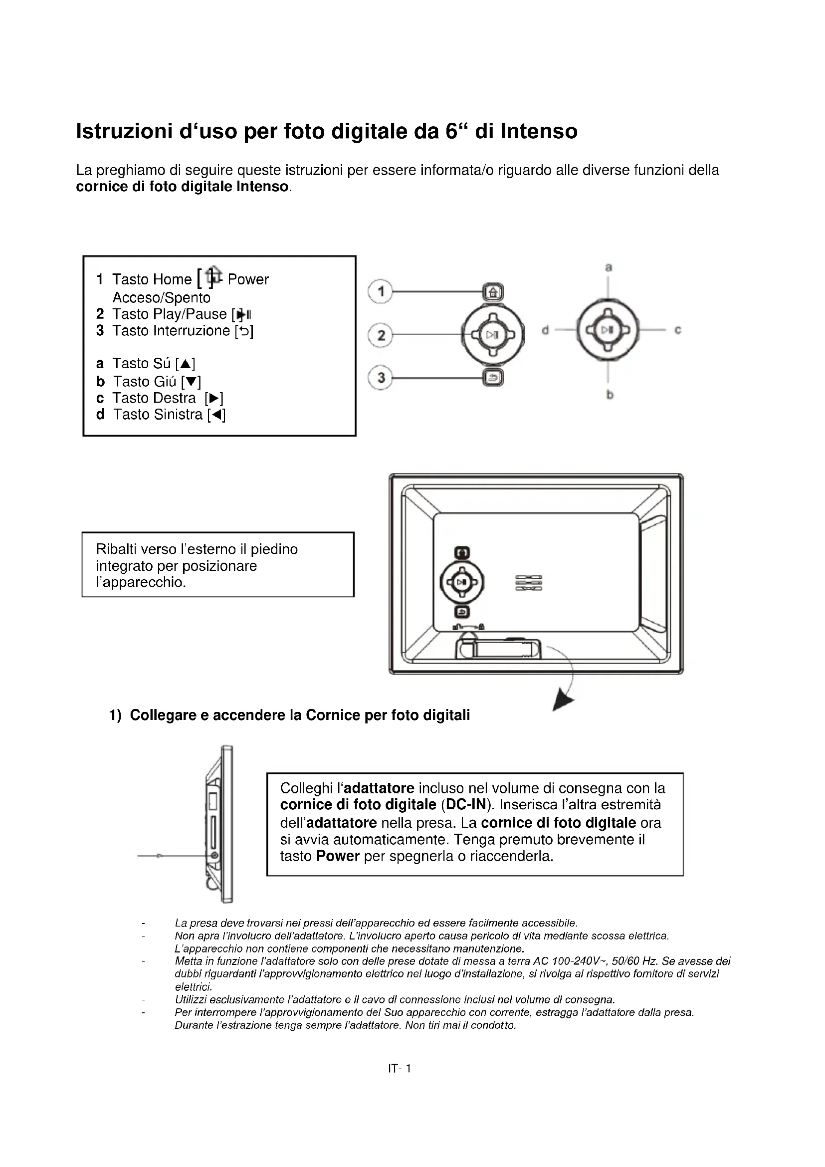 Ribalti verso l’esterno il piedino integrato per posizionare l’apparecchio. 1 Tasto Home [ ] - Power Acceso/Spento 2 Tasto Play/Pause [ ] 3 Tasto Interruzione [] a Tasto Sú [] b Tasto Giú [] c Tasto Destra [] d Tasto Sinistra [] Colleghi l‘adattatore incluso nel volume di consegna con la cornice di foto digitale (DC-IN). Inserisca l’altra estremità dell‘adattatore nella presa. La cornice di foto digitale ora si avvia automaticamente. Tenga premuto brevemente il tasto Power per spegnerla o riaccenderla.IT- 2