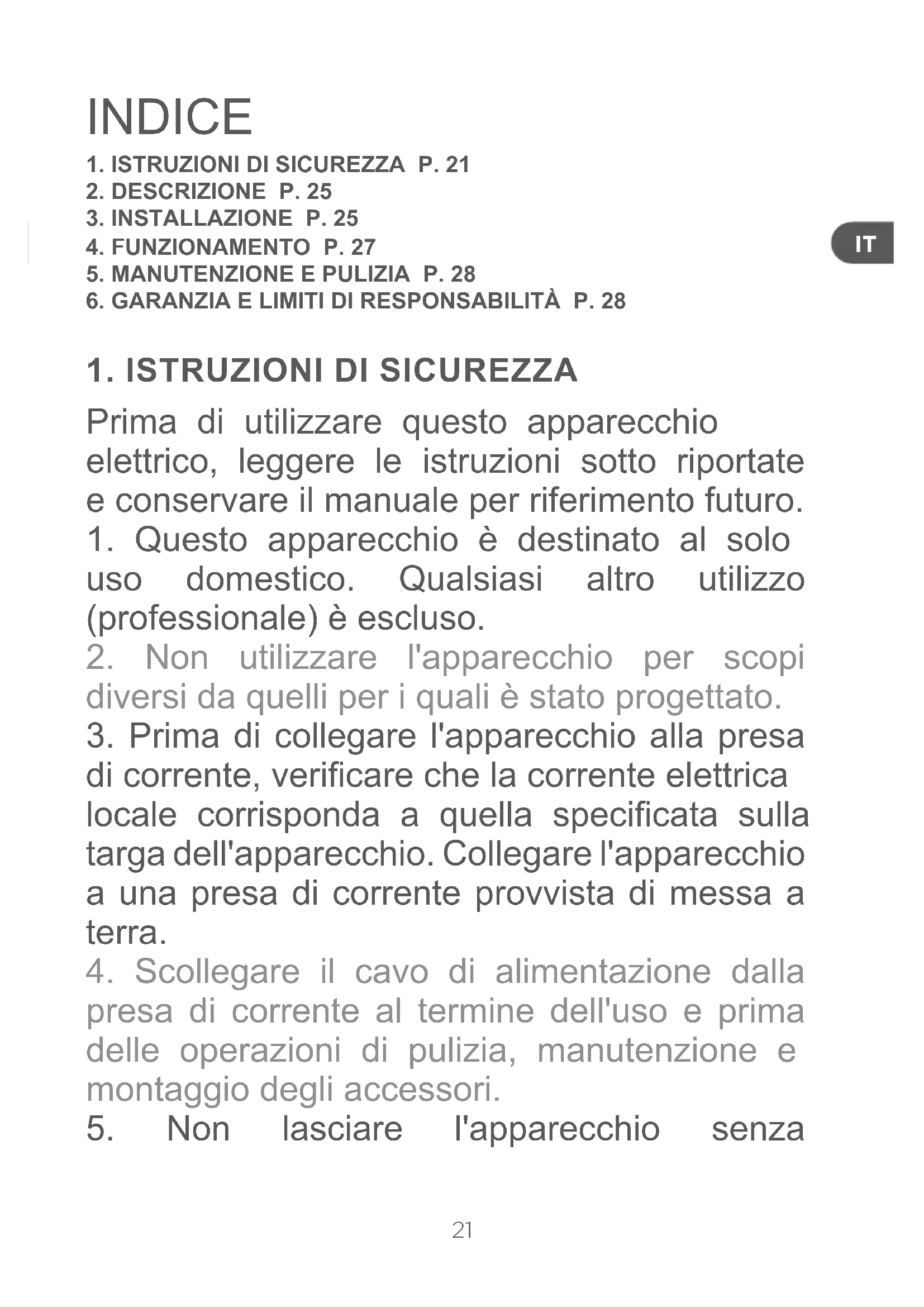Prima di utilizzare questo apparecchio elettrico, leggere le istruzioni sotto riportate e conservare il manuale per riferimento futuro.