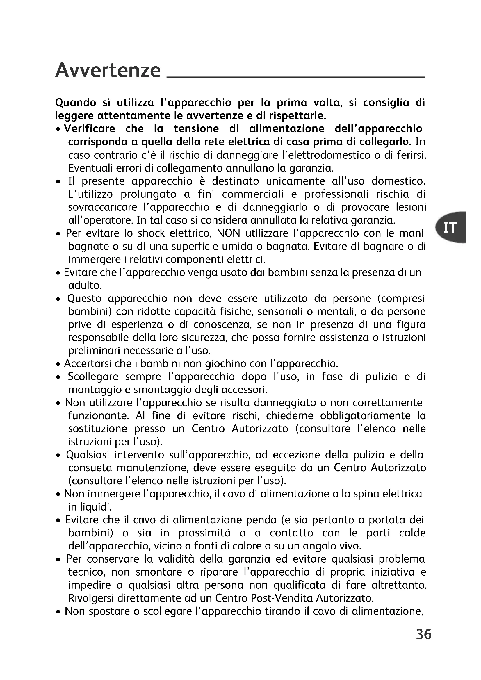 - Il presente apparecchio è destinato unicamente all’uso domestico. L’utilizzo prolungato a fini commerciali e professionali rischia di sovraccaricare l’apparecchio e di danneggiarlo o di provocare lesioni all’operatore. In tal caso si considera annullata la relativa garanzia.