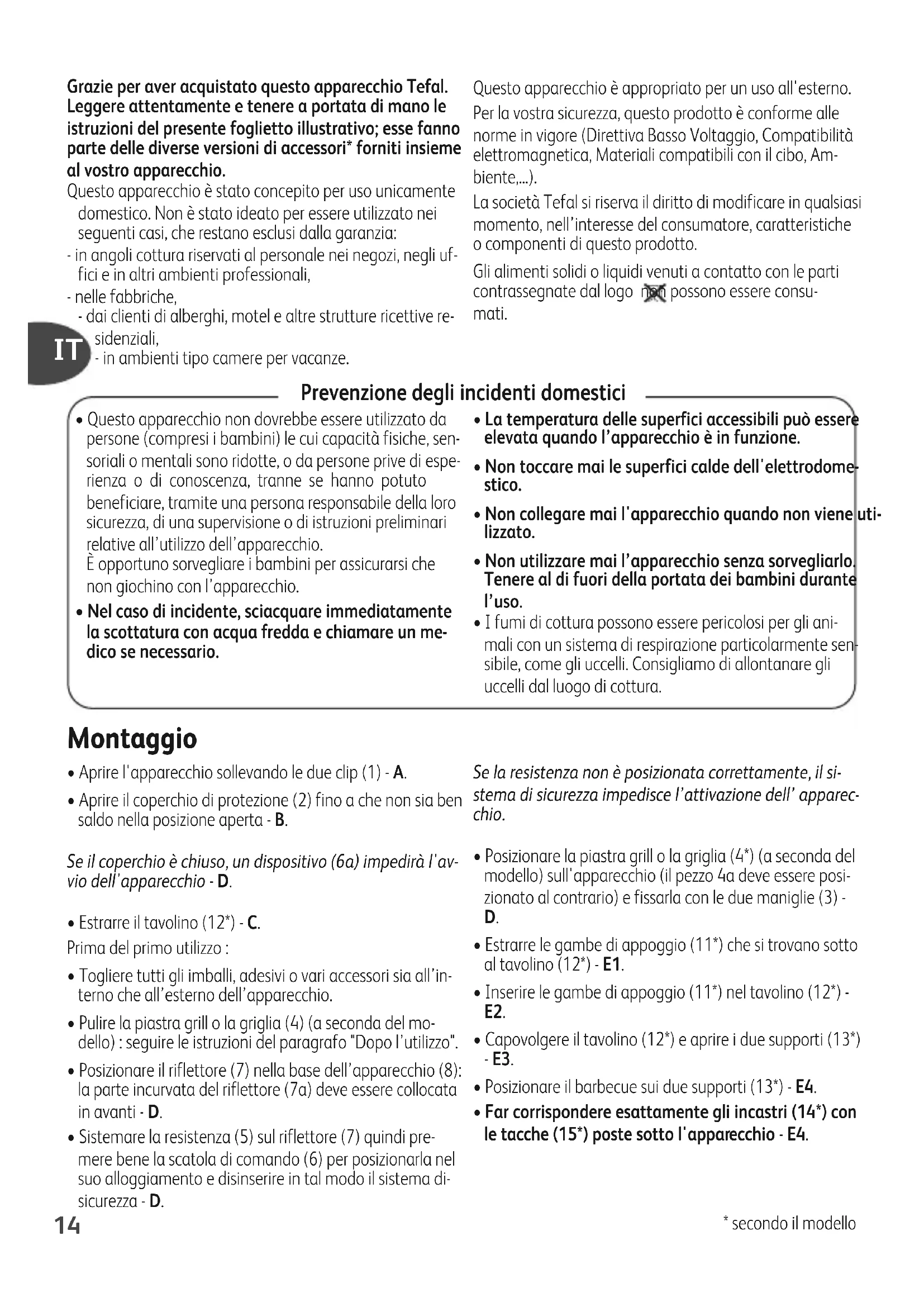 DEGrazie per aver acquistato questo apparecchio Tefal. Leggere attentamente e tenere a portata di mano le istruzioni del presente foglietto illustrativo; esse fanno parte delle diverse versioni di accessori* forniti insieme al vostro apparecchio. Questo apparecchio è stato concepito per uso unicamente domestico. Non è stato ideato per essere utilizzato nei seguenti casi, che restano esclusi dalla garanzia: - in angoli cottura riservati al personale nei negozi, negli uf- fici e in altri ambienti professionali, - nelle fabbriche, - dai clienti di alberghi, motel e altre strutture ricettive re- sidenziali, - in ambienti tipo camere per vacanze. Questo apparecchio è appropriato per un uso all'esterno. Per la vostra sicurezza, questo prodotto è conforme alle norme in vigore (Direttiva Basso Voltaggio, Compatibilità elettromagnetica, Materiali compatibili con il cibo, Am- biente,...). La società Tefal si riserva il diritto di modificare in qualsiasi momento, nell’interesse del consumatore, caratteristiche o componenti di questo prodotto. Gli alimenti solidi o liquidi venuti a contatto con le parti contrassegnate dal logo non possono essere consu- mati. Prevenzione degli incidenti domestici