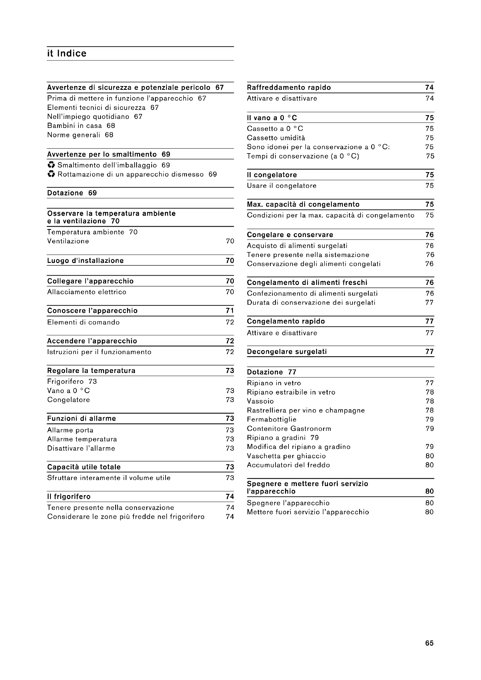 - Rottamazione di un apparecchio dismesso 69 Dotazione 69 Osservare la temperatura ambiente e la ventilazione 70 Temperatura ambiente 70 Ventilazione 70 Luogo d'installazione 70 Collegare l’apparecchio 70 Allacciamento elettrico 70 Conoscere l’apparecchio 71 Elementi di comando 72 Accendere l’apparecchio 72 Istruzioni per il funzionamento 72 Regolare la temperatura 73 Frigorifero 73 Vano a 0 °C 73 Congelatore 73 Funzioni di allarme 73 Allarme porta 73 Allarme temperatura 73 Disattivare l’allarme 73 Capacità utile totale 73 Sfruttare interamente il volume utile 73 Il frigorifero 74 Tenere presente nella conservazione 74 Considerare le zone più fredde nel frigorifero 74 Raffreddamento rapido 74 Attivare e disattivare 74 Il vano a 0 °C 75 Cassetto a 0 °C 75 Cassetto umidità 75 Sono idonei per la conservazione a 0 °C: 75 Tempi di conservazione (a 0 °C) 75 Il congelatore 75 Usare il congelatore 75 Max. capacità di congelamento 75 Condizioni per la max. capacità di congelamento 75 Congelare e conservare 76 Acquisto di alimenti surgelati 76 Tenere presente nella sistemazione 76 Conservazione degli alimenti congelati 76 Congelamento di alimenti freschi 76 Confezionamento di alimenti surgelati 76 Durata di conservazione dei surgelati 77 Congelamento rapido 77 Attivare e disattivare 77 Decongelare surgelati 77 Dotazione 77 Ripiano in vetro 77 Ripiano estraibile in vetro 78 Vassoio 78 Rastrelliera per vino e champagne 78 Fermabottiglie 79 Contenitore Gastronorm 79 Ripiano a gradini 79 Modifica del ripiano a gradino 79 Vaschetta per ghiaccio 80 Accumulatori del freddo 80 Spegnere e mettere fuori servizio l'apparecchio 80 Spegnere l’apparecchio 80 Mettere fuori servizio l’apparecchio 8066 Scongelamento 80 Frigorifero e vano a 0 °C 80 Congelatore 81 Pulire l’apparecchio 81 Dotazione 81 Odori 83 Illuminazione (LED) 84 Risparmiare energia 84 Rumori di funzionamento 84 Rumori normali 84 Evitare i rumori 84 Eliminare piccoli guasti 85 Servizio di assistenza clienti 86 Ordine di riparazione e consulenza in caso di guasti 8667 m Avvertenze di sicurezza e potenziale pericolo Prima di mettere in funzione l'apparecchio Leggere attentamente tutte le istruzioni per l'uso ed il montaggio. Esse contengono importanti informazioni per l'installazione, l'uso e la manutenzione dell'apparecchio. Il produttore non è responsabile se voi trascurate le indicazioni ed avvertenze del libretto d’istruzioni per l’uso. Conservare tutta la documentazione per l'uso futuro oppure per eventuali successivi proprietari. Elementi tecnici di sicurezza Questo apparecchio contiene una piccola quantità di gas refrigerante (R600a), un gas Eco-Compatibile, ma infiammabile. Prevenire danneggiamenti ai raccordi del circuito refrigerante durante il trasporto o l’installazione dell’apparecchio. Il gas fuoriuscendo per effetto della pressione, può provocare irritazioni agli occhi. In caso di danni: ▯ tenere lontano dall'apparecchio fiamme o fonti di accensione, ▯ ventilare l'ambiente per alcuni minuti, ▯ spegnere l’apparecchio ed estrarre la spina di alimentazione elettrica, ▯ informare il Servizio Assistenza Clienti autorizzato. La quantità di gas refrigerante contenuta nel vostro apparecchio, circa 8 gr. è indicata nella targhetta d'identificazione posta all'interno dell'apparecchio. Nel caso in cui il cavo di collegamento elettrico dovesse subire danni, è necessario sostituirlo, coinvolgere il servizio assistenza clienti autorizzato o un elettricista qualificato ad eseguire questa operazione. Installazioni o riparazioni eseguite da personale non autorizzato, possono potenzialmente creare pericolo per l’utente e danni all’apparecchio. Le riparazioni vanno eseguite dal servizio assistenza clienti autorizzato Le riparazioni vanno eseguite dal servizio assistenza clienti autorizzato o da personale qualificato ad eseguire questa operazione. È consentito usare solo parti di ricambio originali del costruttore. Solo con l’impiego di detti componenti il costruttore garantisce che i requisiti di sicurezza del prodotto siano rispettati. Il prolungamento del cavo elettrico di alimentazione deve essere eseguito dal servizio assistenza clienti autorizzato. Nell’impiego quotidiano ▯ Non introdurre mai apparecchi elettrici nell’interno di questo elettrodomestico (es. apparecchi di riscaldamento, produttori di ghiaccio elettrici ecc.). Pericolo di esplosione! ▯ Non sbrinare o pulire mai l’apparecchio con una pulitrice a vapore. Il vapore può raggiungere parti elettriche e provocare un cortocircuito. Pericolo di scarica elettrica! ▯ Non utilizzare oggetti appuntiti o affilati per rimuovere la brina o il ghiaccio. E’ possibile danneggiare i raccordi del circuito refrigerante, che rende inservibile l’apparecchio. Il gas fuoriuscendo per effetto della pressione, può provocare irritazioni agli occhi. ▯ Non conservare nell’apparecchio prodotti contenenti propellenti gassosi combustibili (per es. bombolette spray) e sostanze infiammabili. Pericolo di esplosione! ▯ Non usare impropriamente lo zoccolo, i cassetti estraibili, le porte ecc. quale punto di appoggio o come sostegno. ▯ Per lo sbrinamento e la pulizia estrarre la spina d’alimentazione o disinserire l’interruttore di sicurezza. Evitare di esercitare trazioni sul cordone elettrico, ma impugnare correttamente la spina. ▯ Conservare alcool ad alta gradazione in un contenitore ermeticamente chiuso, e posto in posizione verticale.68 ▯ Evitare che olii o grassi imbrattino parti plastiche o le guarnizioni delle porte. I grassi aggrediscono il materiale plastico e la guarnizione della porta diventano fragili e porose. ▯ Non ostruire le aperture di passaggio dell’aria di aereazione dell’apparercchio. ▯ Evitare pericoli a bambini e persone a rischio: Sono esposti a pericolo i bambini e le persone con limiti fisici, psichici o percettivi ed altresì persone, sprovviste di sufficiente conoscenza del sicuro funzionamento del