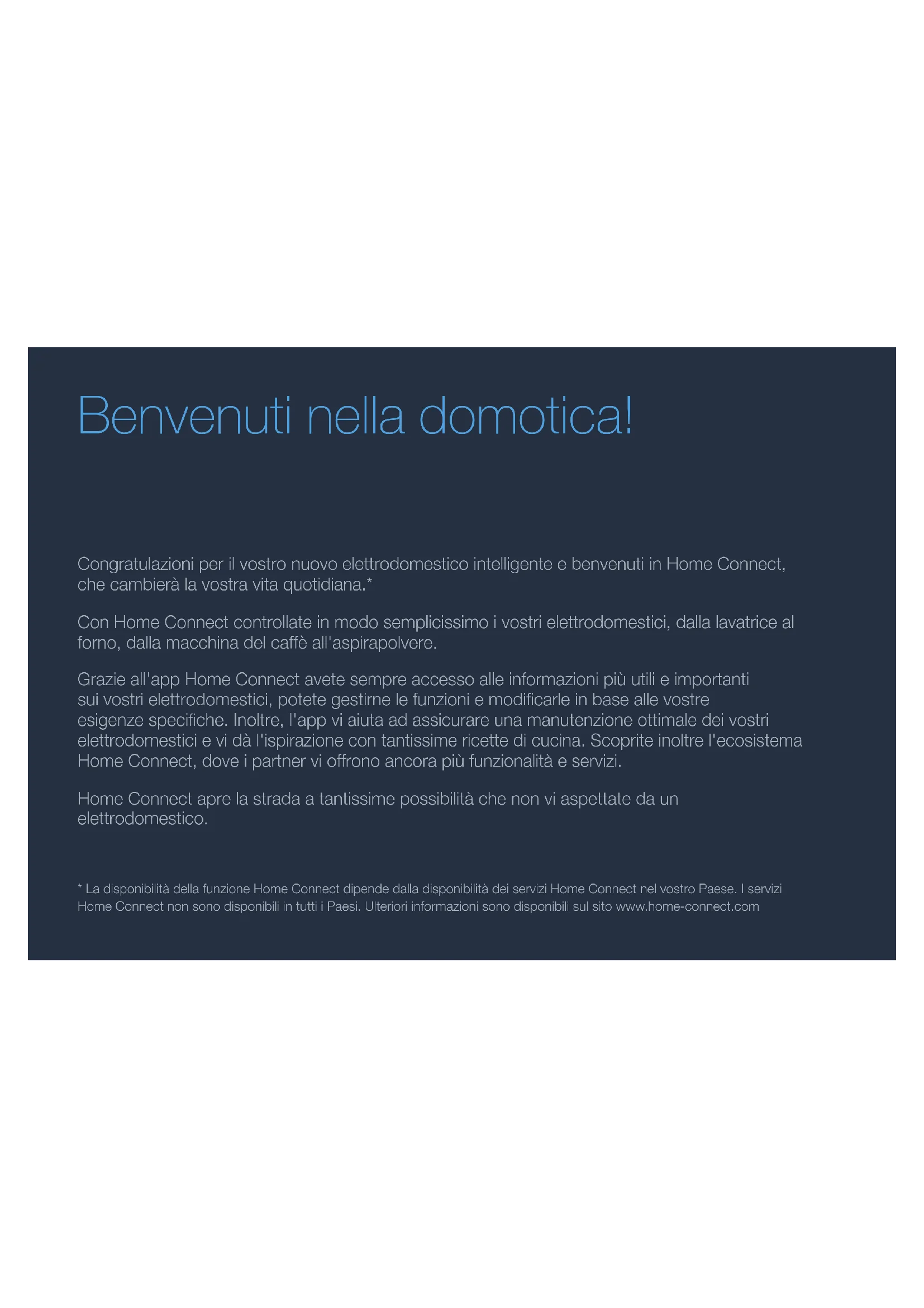 319 FR Étape 3 : connecter le réfrigérateur à l’appliHomeConnect Suivez les instructions gurant à l’étape 3 uniquement lorsque l’appli vous y invite. Les étapes suivantes décrivent la commande au niveau de l’appareil électroménager. 1 | Ouvrez le menu Réseau domestique sur le réfrigérateur. 2 | Avec la touche ,faitesdélerjusqu’aupointdemenu Connecter à l’appli . 3 | Appuyezsurlatouche pourouvrirlepointdemenu. Connecter à l’appli 4 | Lebandeaudecommandedevotreréfrigérateurindique Connecter à l’appareil mobile. 5 | Appuyezsurlatouche pourconrmer. L’applitentedeseconnecterauréfrigérateur.Lebandeaude commandedevotreréfrigérateurindiqueSynchronisation en cours. Synchronisation en cours 6 | Suivezlesinstructionsdel’applipouracheverlaprocédure. Silaconnexionaréussi,Connexion à l’appli réussieapparaîtsurlebandeaudecommandedevotre réfrigérateur. Connexion à l’appli réussie 7 | Conrmezavec . Labarred’étatdubandeaudecommandefaitapparaître . 8 | Veuillezsuivrelesinstructionsdel’appli. Remarque: Silaconnexionnepeutêtreétablieavecsuccès, assurez-vousquevotresmartphone/tabletteest bienàportéedevotreréseaudomestique. 320 DE CongratulazioniperilvostronuovoelettrodomesticointelligenteebenvenutiinHomeConnect, checambieràlavostravitaquotidiana.* ConHomeConnectcontrollateinmodosemplicissimoivostrielettrodomestici,dallalavatriceal forno,dallamacchinadelcaffèall'aspirapolvere. Grazieall'appHomeConnectavetesempreaccessoalleinformazionipiùutilieimportanti suivostrielettrodomestici,potetegestirnelefunzioniemodicarleinbaseallevostre esigenzespeciche.Inoltre,l'appviaiutaadassicurareunamanutenzioneottimaledeivostri elettrodomesticievidàl'ispirazionecontantissimericettedicucina.Scopriteinoltrel'ecosistema HomeConnect,doveipartnervioffronoancorapiùfunzionalitàeservizi. HomeConnectaprelastradaatantissimepossibilitàchenonviaspettatedaun elettrodomestico. *LadisponibilitàdellafunzioneHomeConnectdipendedalladisponibilitàdeiserviziHomeConnectnelvostroPaese.Iservizi HomeConnectnonsonodisponibiliintuttiiPaesi.Ulterioriinformazionisonodisponibilisulsitowww.home-connect.com Benvenuti nella domotica!21 IT Scopritelepossibilitàofferteda HomeConnect Gestite i vostri elettrodomestici Nellapanoramicatrovatetuttiglielettrodomesticicollegati eaveteaccessoainformazioniimportantieutili.Potetead esempiogestirnelefunzioniemodicarleinbaseallevostre esigenzespeciche. Lasciatevi ispirare Lasezionedellericetteoffresvariatericette,consiglievideo cherenderannoancorapiùbellocucinare. Aiuto e supporto Lasezionediassistenzaoffreinformazioniutilisul corretto uso e sulla corretta manutenzione del vostro elettrodomestico. Ancora più vantaggi Lanostraretedipartnerèincostantecrescita.Trovateun elencodituttiipartnerall'indirizzo www.home-connect.com. Iniziamo subito! Eccocosaviserve: 1 | Frigorifero collegato alla corrente e acceso. 2 | UnosmartphoneotabletconsistemaoperativoiOSo Androidaggiornatoall'ultimaversione. 3 | FrigoriferonelraggiodalsegnaleWi-Fidellavostrarete domestica. 4 | Ilnome(SSID)elapassword(Key)dellavostrareteWi-Fi. 5 | Questeistruzioniperl'installazione. Informazioneimportante: Sicurezza dei dati:lasicurezzadeidatirappresenta lamassimaprioritàperHomeConnect.Lo scambiodidatiavvienesempreinmodocriptato. HomeConnectadottamisuredisicurezzache vengonovericateeaggiornateaintervalliregolari. Permaggioriinformazioni: www.home-connect.com. Sicurezza dell'apparecchio:perutilizzare in modo sicuro il vostro elettrodomestico con HomeConnect,attenetevialleavvertenzedi sicurezzacontenutenellecorrispondentiistruzioni perl'uso.22 IT Fase 2: collegamento del frigorifero alla rete domestica 1 | Ilfrigoriferoègiàcollegatoallacorrenteedèacceso. 2 | Apritel'appHomeConnectperaggiungereilvostrofrigorifero. 3 | Seguiteleistruzioninell'appefateriferimentoaqueste istruzionisoltantoserichiestodall'app Nota: Lavoriamocostantementepermigliorarel'app HomeConnect.Perquestomotivo,vipotrebbero esserediscrepanzetralefasidaeseguireperil collegamento. Attenetevi alle istruzioni della versione piùrecentedellavostraappHomeConnect,chevi guideràattraversoilprocessodicollegamento. Fase 1:downloaddell'app HomeConnectecreazionediunaccount utente 1 | Apritel'AppStore(dispositiviApple)oGooglePlayStore (dispositiviAndroid)dalvostrosmartphoneotablet. 2 | Cercate"HomeConnect"nellostoreeinstallate l'app. AppHomeConnect: 3 | Apritel'apperegistratevipercreareunaccountutente HomeConnect. 4 | PrendetenotadeidatidiaccessoaHomeConnect(account utenteepassword):neavretebisognoinunsecondo momento. L'appviguidaattraversolefasinecessariepercollegareil vostroelettrodomesticoaHomeConnect.L'apprimandaa questeistruzionisenecessario.23 IT Passaggio 2.1: collegamento del frigoriferoallaretedomesticaconWPS Seguite le istruzioni della fase 2.1 soltanto se l'app lo richiede. Le fasi seguenti descrivono le operazioni sull'elettrodomestico. 1 | PremeteiltastoSperaprireilmenuprincipale. 2 | Con il tasto sfogliatenoallavocedimenuImpostazioni di base . 3 | Peraprirelavocedimenupremeteiltasto