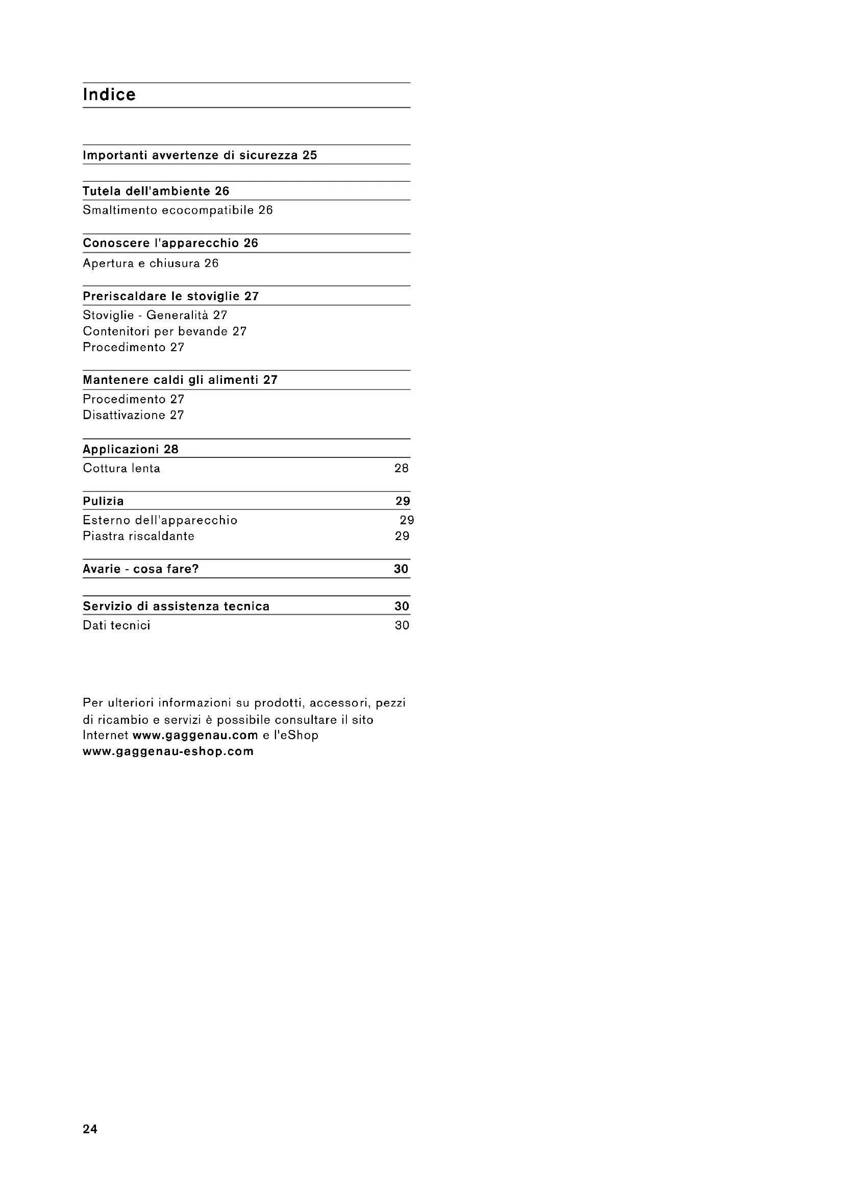 4XDQGRVLDFFHQGHODSSDUHFFKLR ODODPSDGDVSLDODPSHJJLD4XDQGRVL FKLXGHLOFDVVHWWRODODPSDGDVSLD UHVWDDFFHVD 6HOHWWRUHIXQ]LRQL 2)) ODVFLDUULSRVDUHOLPSDVWRVFRQJHODUH WHQHUFDOGRLOSDQHVFRQJHODUHSUHULVFDOGDUHLFRQWHQLWRULSHUEHYDQGH WHQHUFDOGHOHSLHWDQ]H SUHULVFDOGDUHOHVWRYLJOLH27 Preriscaldare le stoviglie Preriscaldando le stoviglie, gli alimenti ivi contenuti non si raffredderanno troppo rapidamente. Le bevande restano calde più a lungo. Stoviglie - Generalità Il cassetto scaldavivande può contenere fino a un massimo di 25 kg. Per esempio, è possibile preriscaldare posate per 6 - 12 persone. Disposizione delle stoviglie Disporre le stoviglie in modo uniforme sull'intera superficie. I piatti disposti l'uno sull'altro si scaldano più lentamente rispetto alle stoviglie disposte singolarmente, per esempio 2 ciotole. Contenitori per bevande Per riscaldare i contenitori per bevande, quali le tazze per caffè espresso, usare il livello 2. ã Pericolo di ustioni! Impostando il livello 3 oppure 4, i contenitori per bevande diventano molto caldi. Procedimento 1 Riporre le stoviglie nel cassetto. 2 Impostare il selettore funzioni sul grado 4. Per i contenitori per bevande selezionare sempre il livello 2. La spia luminosa di esercizio lampeggia. 3 Chiudere il cassetto scaldavivande. La spia luminosa di esercizio si accende. L'apparecchio riscalda. Durata della fase di preriscaldamento La durata della fase di preriscaldamento dipende dal tipo di materiale e dallo spessore delle stoviglie, dalla quantità, dall'altezza e dalla disposizione delle stoviglie stesse. Disporre le stoviglie in modo uniforme sull'intera superficie. Qualora si facciano riscaldare stoviglie per 6 persone, il preriscaldamento dura circa 15-25 minuti. Disattivazione Aprire il cassetto. Disattivare il selettore funzioni. Estrazione delle stoviglie Estrarre le stoviglie dal cassetto utilizzando un panno o appositi guanti. ã Pericolo di ustioni! La superficie della piastra di cottura è calda. Le parti inferiori delle stoviglie si riscaldano più di quelle superiori. Mantenere caldi gli alimenti Le stoviglie calde non devono essere mai trasferite direttamente dal piano di cottura caldo alla base in vetro del cassetto termico. Il fondo in vetro può danneggiarsi. Non riempire eccessivamente le stoviglie, in modo da evitare che il cibo trabocchi. Coprire gli alimenti con un coperchio termico o con una pellicola di alluminio. Si consiglia di non far riscaldare il cibo per intervalli di tempo superiori a un'ora. Alimenti appropriati: carne, pollo, pesce, salse, verdura, contorni e minestre. Procedimento 1 Posizionare le stoviglie nel cassetto. 2 Impostare il selettore funzioni sul grado 3 e preriscaldare l'apparecchio per 10 minuti. 3 Mettere il cibo nelle stoviglie preriscaldate. 4 Chiudere nuovamente il cassetto. La spia luminosa del display di esercizio si accende. L'apparecchio riscalda. Disattivazione Disattivare il selettore funzioni. Estrarre le pentole dal cassetto utilizzando un panno o appositi guanti. cassetto inferiore (altezza: 14 cm) cassetto superiore (altezza: 29 cm) 6 piatti Ø 24 cm 12 piatti Ø 24 cm 6 scodelle per minestra Ø 10 cm 12 scodelle per minestra Ø 10 cm 1 ciotola Ø 19 cm 1 ciotola Ø 22 cm 1 ciotola Ø 17 cm 1 ciotola Ø 19 cm 1 piatto per carne 32 cm 1 ciotola Ø 17 cm 2 piatti per carne 32 cm28 Applicazioni Le tabelle indicano diversi tipi di applicazioni per il cassetto scaldavivande. Impostare il selettore funzioni sul livello desiderato. Preriscaldare le stoviglie qualora questo sia richiesto dalle indicazioni riportate nella tabella. Cottura lenta La funzione di cottura lenta è ideale per la carne tenera che deve risultare al sangue o cotta al dente. La carne resta in questo modo particolarmente succulenta e tenera. Il vantaggio: poiché con la cottura lenta i tempi si prolungano, si ha la possibilità di pianificare il menu a proprio piacere. La carne preparata a cottura lenta può essere tenuta calda facilmente. Stoviglie adatte: Utilizzare stoviglie in vetro, porcellana o ceramica con coperchio, per esempio una teglia in vetro. Procedimento 1 Preriscaldare il cassetto scaldavivande con la stoviglia al livello 4. 2 Far scaldare del burro o dell'olio in un tegame. Far rosolare ben bene la carne e disporla quindi immediatamente nella pentola preriscaldata. Mettere il coperchio. 3 Riporre quindi la pentola con la carne nel cassetto scaldavivande e proseguire la cottura. Impostare il selettore funzioni sul grado 3. Avvertenze per la cottura lenta Utilizzare solo carne fresca e in perfette condizioni. Eliminare con cura i tendini e i bordi di grasso. Durante la cottura il grasso produce infatti un forte sapore particolare. Anche le fette di carne più grosse non devono essere necessariamente voltate. Una volta terminata la cottura lenta, è possibile tagliare immediatamente la carne. Non è indispensabile lasciarla riposare. Grazie a questo metodo di cottura, la carne risulta internamente sempre rosa. Questo non significa tuttavia che la carne sia cruda o poco cotta. Attraverso la cottura lenta la carne non risulta così calda come la carne preparata arrosto nel modo consueto. Servire le salse molto calde. Negli ultimi 20- 30 minuti riporre i piatti nel cassetto scaldavivande. Se si desidera mantenere calda la carne preparata a fuoco lento, impostare nuovamente il livello 2 una volta terminata la cottura lenta. Le fette di carne piccole possono essere mantenute calde per 45 minuti, quelle di maggiori dimensioni per due ore. Livello Alimenti / stoviglie Avvertenza 1 Prodotti surgelati delicati per esempio torte con panna, burro, salsicciotti, formaggio scongelare 1 Far lievitare la pasta coprire 2 Prodotti surgelati per esempio carne, dolci, pane scongelare 2 Mantenere calde le uova per esempio uova cotte, uova stra- pazzate Preriscaldare le stoviglie, coprire gli alimenti 2 Mantenere caldo il pane per esempio pane per toast, pagnotte Preriscaldare le stoviglie, coprire gli alimenti 2 Preriscaldare i conte