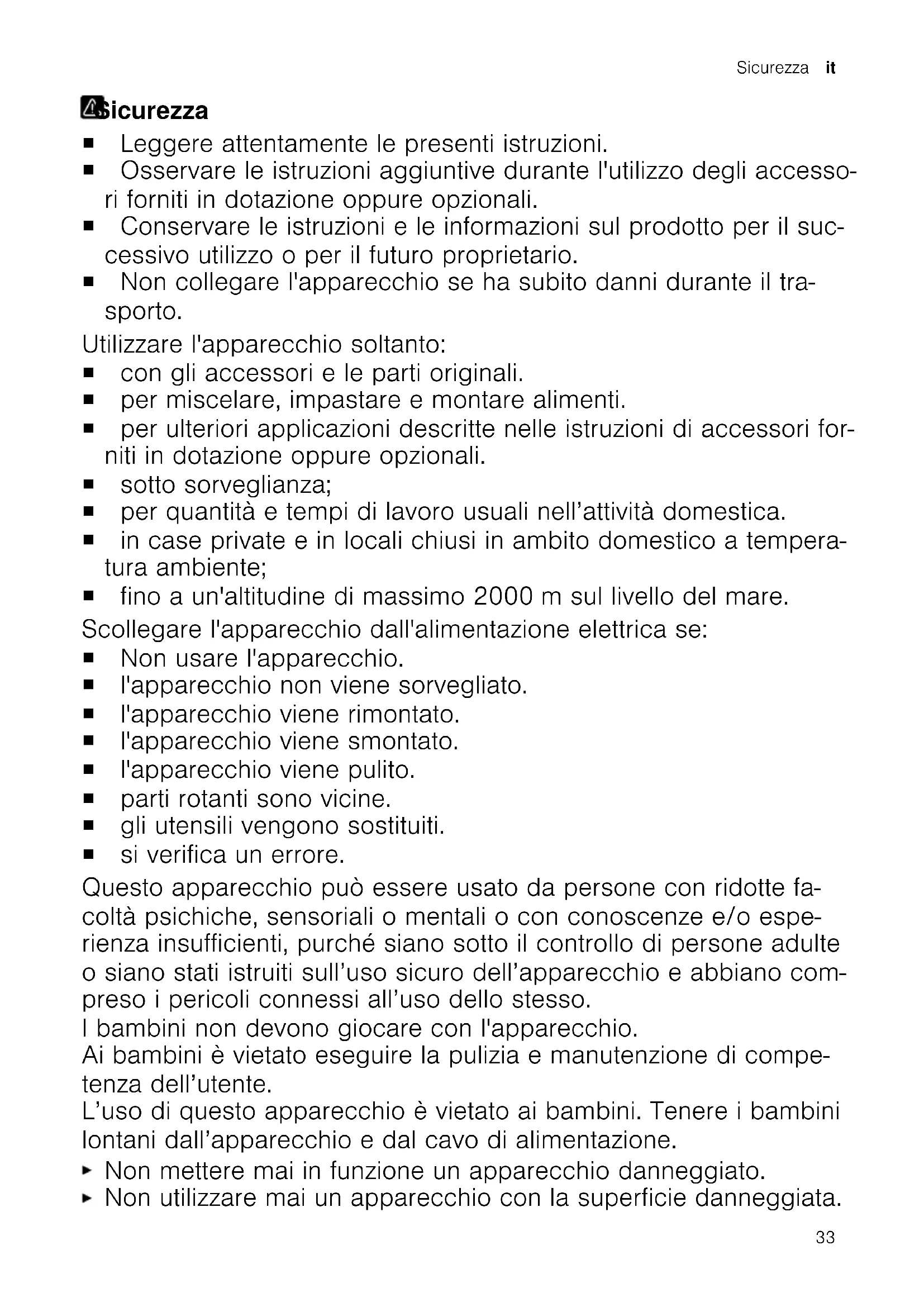 "Sistemazione guasti", Pagina39 Sistemi di sicurezza Sicurezza d’accensione Il blocco di accensione previene che l'appa- recchio venga acceso inavvertitamente. L’apparecchio può essere acceso ed azio- nato solo se il braccio oscillante è inserito correttamente nella posizione di lavoro. In alcuni modelli: L’apparecchio può essere acceso ed azio- nato solo se è soddisfatto uno dei requisiti seguenti: Il braccio oscillante è fissato in posizione orizzontale e viene utilizzata la ciotola o la gelatiera. Il braccio oscillante è inserito in posizio- ne verticale e il coperchio di sicurezza dell'ingranaggio o un accessorio monta- to sono fissati correttamente. Stampato su carta riciclata al 100% Blocco di riaccensione Il blocco di riaccensione previene che l'ap- parecchio avvii autonomamente la lavora- zione dopo un'interruzione dell'alimentazio- ne. In caso d’interruzione dell’alimentazione elettrica l’apparecchio viene reinserito. La lavorazione può essere riavviata solo dopo aver impostato la manopola su . Stampato su carta riciclata al 100% Sicurezza di sovraccarico La sicurezza di sovraccarico previene che il motore ed altri componenti vengano dan- neggiati da un sovraccarico eccessivo. Stampato su carta riciclata al 100% FunzionamentoFunzionamento Installazione dell'apparecchio