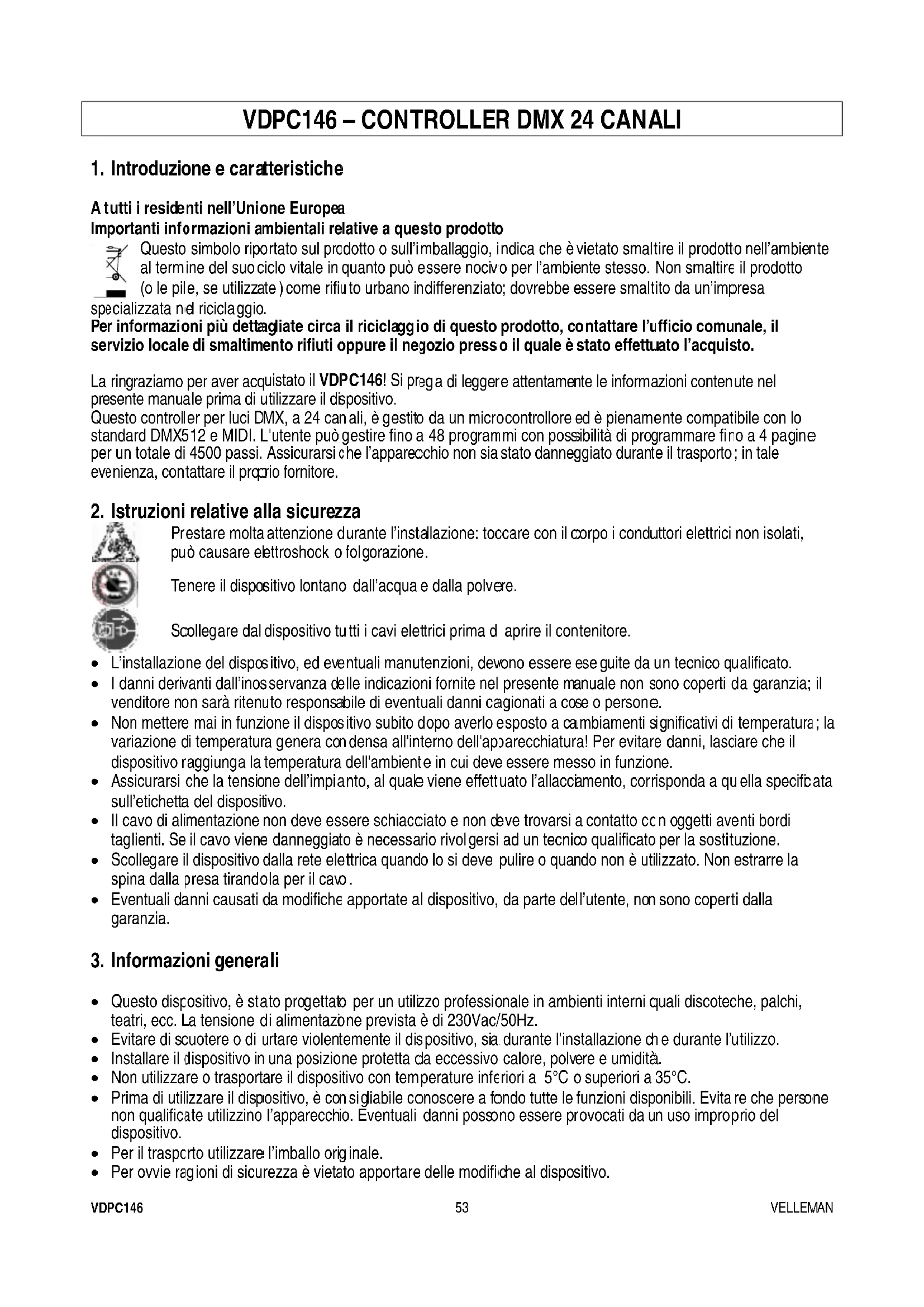 - Cualquier gesto com ercial no disminuye estos derechos. La lista previam ente m encionada puede ser adaptada según el tipo de artículo ( véase el manual del usuario del artículo en cuestión) Servizio di Garanzia e Qualità Vellem an® Velleman ® ha oltre 35 anni di esperienza nel mondo dell'elettronica e distribuisce i suoi prodotti in oltre 85 paesi. Tutti i nostri prodotti soddisfano rigorosi requisiti di qualità e rispettano le disposizioni giuridiche dell'Unione europea. Al fine di garantire la massima qualità, i nostri prodotti vengono regolarmente sottoposti ad ulteriori controlli, effettuati sia da un reparto interno di qualità che da organizzazioni esterne specializzate. Se, nonostante tutti questi accorgim enti, dovessero sorgere dei problemi, si prega di fare appello alla nostra garanzia (vedi condizioni generali di garanzia). Condizioni generali di garanzia per i prodotti di consum o ( per l’EU) :