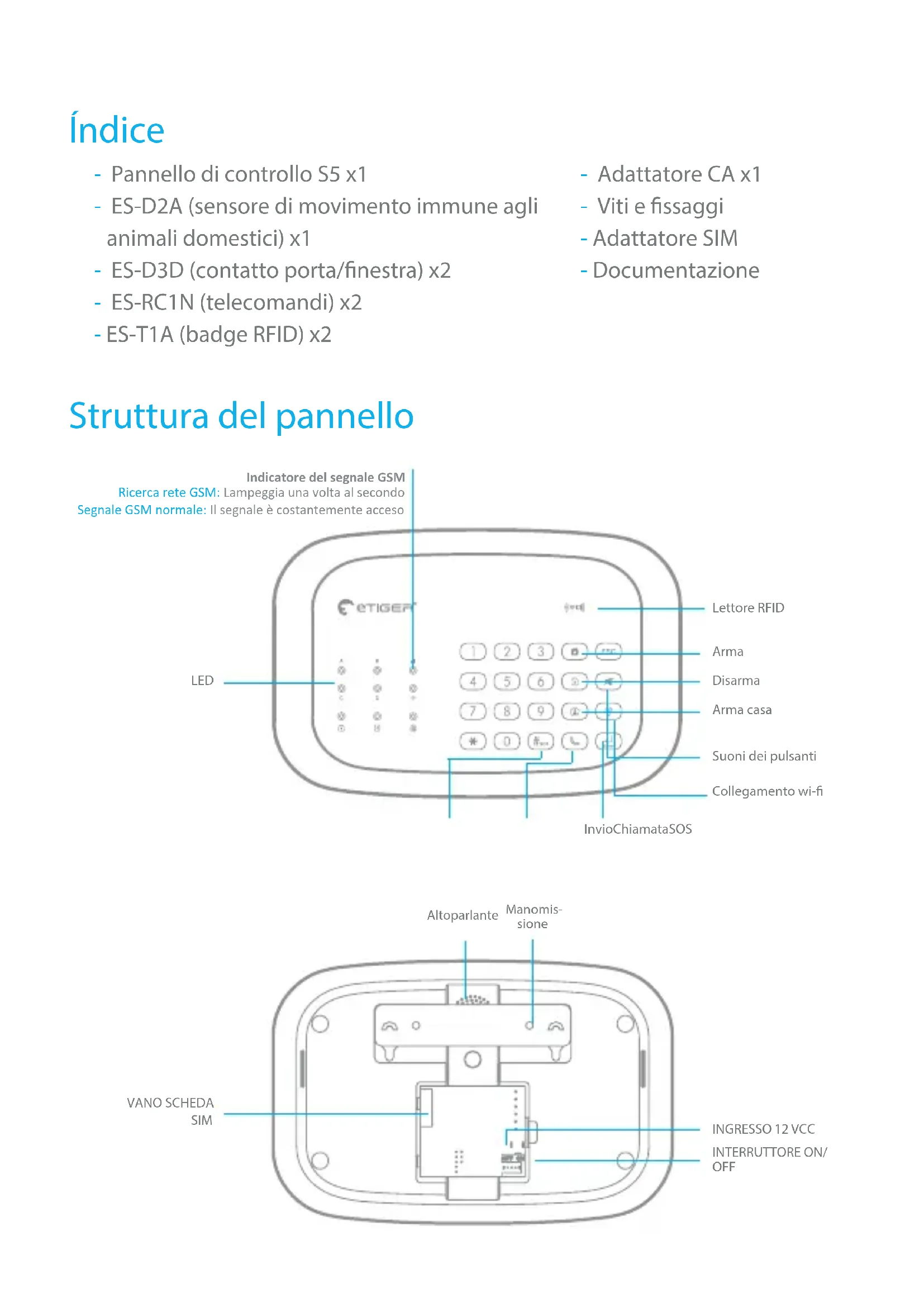 vocale fornirà una serie di opzioni (spegnere la sirena, disarmare il sistema, avviare la sorveglianza audio, ecc.). ARMA DISARMA ARMA CASA Impostazioni Accessori RegistratiAccessori Rilevatore di movimento Si consiglia di montare il rilevatore a un’al- tezza di 2,2 m e angolo di 90°. Il rilevatore non rileva animali di peso inferiore a 25 kg. Evitare di montare i rilevatori in aree con una grande quantità di metallo o dispositivi elettrici. 2.2m <25kg 90° Comprensione della modalità standby Se il rilevatore viene attivato più di due volte in 3 minuti, passa alla modalità standby per risparmiare energia. Durante la modalità standby, è inattivo. Se entro i 3 minuti successivi viene rilevato un nuovo movimento, la modalità standby si prolunga di 3 minuti. Se non viene rilevato alcun movimento nei 3 minuti successivi, il sensore si riattiva. Sensori porta Montare la calamita con nastro biadesivo rispettivamente sulla porta e sul telaio della porta. ITImpostazioni avanzate Per l’installazione degli accessori, consultare il manuale completo su www.etiger. com. Collegamento di altri accessori Dal pannello di controllo, digitare il codice di amministrazione (codice prede- nito: 123456*), seguito dal tasto : il pannello di controllo è in modalità Connes- sione.Nei successivi 15 secondi, attivare l’accessorio che si desidera collegare (nel caso del tag RFID, farlo scorrere sulla parte frontale del lettore RFID sul pannello di controllo). Viene emesso un segnale acustico: l’accessorio è salvato. Suggerimento Tutti gli accessori eTIGER presenti nella confezione sono già precongurati sul pannello di controllo. Non è necessario aggiungerli di nuovo. Modicare il codice di accesso Non dimenticare di modicare il codice di accesso. Per farlo, inviare il numero “13”, via SMS, al pannello di controllo o modica il codice tramite l’app nel menu delle impostazioni del tuo dispositivo. Manuale completo Per maggiori impostazioni, fare riferimento al manuale d’uso del pannello di controllo, scaricabile dal sitowww.etiger.comPer un uso più sicuro del prodotto e per ottimizzarne la durata, si raccomanda di seguire le precauzioni illustrate qui di seguito. - Gli accessori wireless devono essere collegati al pannello di controllo. - Una bassa tensione di alimentazione può condizionare la distanza di trasmissione. - Non premere il tasto SOS sul telecomando se non è necessario, per evitare di disturbare il vicinato. - Controllare regolarmente il sistema per assicurarsi che funzioni correttamente. - Il pannello di controllo non è né impermeabile né a prova di umidità: installarlo in un luogo ombreggiato, fresco e asciutto. - L’involucro del pannello di controllo è fabbricato in plastica ABS. Tenere il dispositivo lontano da luce intensa per garantirne una durata di vita più estesa. - Il pannello di controllo non è a prova di esplosione. Tenere lontano da fuochi e amme. - Installare il pannello di controllo lontano da oggetti che generano calore o campi elettromagnetici, come radiatori, aria condizionata, forni a microonde, ecc. - Smaltire le batterie nel rispetto delle normative locali. - Lo smontaggio del dispositivo deve essere eettuato esclusivamente da personale specializzato. Immagini, illustrazioni e testi non sono contrattualmente vincolanti. eTIGER e il logo eTIGER sono marchi registrati e di proprietà di eTIGER. Copyright © 2019 eTIGER. Tutti i diritti riservati. Precauzioni ITNorme Questo prodotto è contrassegnato dal simbolo per la cernita selettiva per i riuti di apparecchiature elettriche ed elettroniche (RAEE). Ciò signica che deve essere gestito in conformità alla direttiva europea 2012/19/EU per un riciclo e uno smantellamento che abbiano il minimo impatto possibile sull’ambiente. Per ul- teriori informazioni, contattare le autorità locali o regionali. I prodotti elettronici non inclusi nel processo di cernita selettiva sono potenzialmente pericolosi per l’ambiente e per la salute umana a causa della presenza di sostanze nocive. In conformità alle leggi europee. Questo prodotto è conforme ai requisiti es- senziali ed alle altre disposizioni applicabili stabilite dalla direttiva 2014/53/ EU. Questo prodotto è stato progettato e fabbricato in conformità alla direttiva 2011/65/EU del Parlamento europeo e del Consiglio sulla restrizione all’uso di determinate sostanze pericolose nelle apparecchiature elettriche ed elettroniche (direttiva RoHS) ed è sono considerato conforme ai valori di concentrazione massimi stabiliti dal comitato europeo per l’adeguamento tecnico (TAC). Fabbricato in Cina. Immagini, illustrazioni e testi non contrattuali. eTIGER e il logo eTIGER sono marchi registrati di proprietà di eTIGER. Copyright © 2019 eTIGER. Tutti i diritti riservati.PTDesign do painel Índice - Painel de controlo S5 x1 - ES-D2A (Sensor de movimento imune a animais de estimação) x1 - ES-D3D (Contacto para porta/janela) x2 - ES-RC1N (Controlos remotos) x2 - ES-T1A (Cartão RFID) x2 - Adaptador CA x1 - Parafusos e ancoragens - Adaptador SIM - Documentação Leitor de RFID Armar LED RANHURA PARA