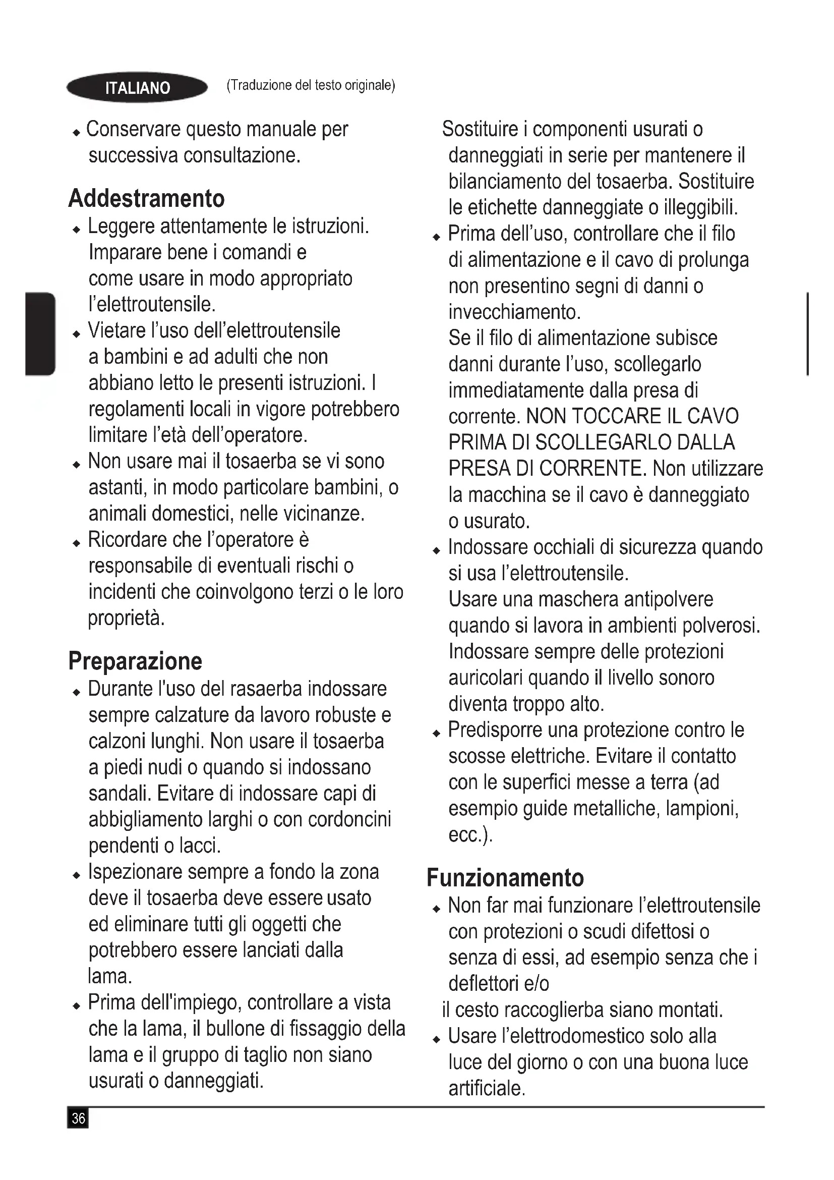 PRESA DI CORRENTE. Non utilizzare la macchina se il cavo è danneggiato o usurato. u Indossare occhiali di sicurezza quando si usa l’elettroutensile. Usare una maschera antipolvere quando si lavora in ambienti polverosi. Indossare sempre delle protezioni auricolari quando il livello sonoro diventa troppo alto. u Predisporre una protezione contro le scosse elettriche. Evitare il contatto con le superci messe a terra (ad esempio guide metalliche, lampioni, ecc.). Funzionamento u Non far mai funzionare l’elettroutensile con protezioni o scudi difettosi o senza di essi, ad esempio senza che i deettori e/o il cesto raccoglierba siano montati. u Usare l’elettrodomestico solo alla luce del giorno o con una buona luce articiale.37 (Traduzione del testo originale) ITALIANO u Non esporre l’elettroutensile alla pioggia. Non usare l’elettroutensile in ambienti umidi o bagnati. È preferibile non usare l’elettroutensile quando l’erba è bagnata. u Mantenere un buon equilibrio, in modo particolare sui pendii. Si tenga in considerazione che l’erba appena tagliata è umida e sdrucciolevole. Non lavorare su pendii ripidi. u Lavorare trasversalmente su un pendio e mai procedendo verticalmente in su e in giù. Prestare la massima attenzione quando si cambia direzione su di un pendio. u Non tagliare l’erba su pendii molto ripidi. u Camminare e non correre mai mentre si utilizza l’elettroutensile. Non tirare l’elettroutensile verso di sé e non camminare all’indietro durante l’uso. U Accendere l’elettroutensile seguendo le istruzioni e tenendo i piedi sempre ben lontani dalla lama. u Non far funzionare il tosaerba posizionandosi direttamente davanti all'apertura di scarico. u Non inclinare l’elettroutensile quando lo si accende, ad eccezione di quando deve essere inclinato per l’avviamento. In tali casi, non inclinare l’elettroutensile più di quanto sia assolutamente necessario e sollevare solo la parte lontana dall’operatore. Accertarsi sempre che entrambe le mani siano nella posizione operativa prima di riportare a terra l’elettroutensile. u Spegnere l’elettroutensile e lasciare che la lama si fermi se è necessario inclinare l’elettroutensile per trasportarlo quando si attraversano superci non erbose e quando lo si sposta da una zona da tagliare all’altra. u Non sollevare né trasportare l’elettroutensile no a quando la lama non si è arrestata completamente. u Tenere sempre piedi e mani ben lontani dalla lama. u Non inlare mani o piedi vicino o sotto alle parti in movimento. u Tenersi sempre lontani dalle aperture di scarico. u Spegnere l’elettroutensile, scollegare la spina dalla presa di corrente e accertarsi che le parti in movimento siano ferme prima di lasciarlo incustodito e prima di cambiare, pulire o ispezionare qualsiasi parte o di eliminare un’ostruzione. Dopo aver colpito un oggetto estraneo. Vericare che il tosaerba non sia danneggiato ed effettuare le riparazioni richieste prima di riaccenderlo e di usarlo; u Se l’elettroutensile comincia a vibrare in modo anomalo o se si colpisce un oggetto estraneo, spegnerlo e scollegare la spina dalla presa di corrente. Controllare se l'elettroutensile presenta danni, sostituire o riparare le parti danneggiate, vericare che non vi siano parti allentate ed eventualmente serrarle.38 (Traduzione del testo originale) ITALIANO u Prestare attenzione a tenere sempre lontano il cavo di alimentazione dalla lama. Essere sempre consapevoli di dove si trova il cavo di alimentazione. u Il motore continua a funzionare per alcuni secondi dopo lo spegnimento dell’elettroutensile. Non tentare mai di fermare a forza la lama. Manutenzione e conservazione u Prima dell'uso, vericare che l'elettroutensile non sia danneggiato e non presenti parti difettose. Controllare l’eventuale disallineamento e il blocco delle parti mobili, se sono presenti pezzi rotti, danni alle protezioni o agli interruttori e qualsiasi altra condizione che possa inuenzare il funzionamento dell'apparato. Accertarsi che l’elettroutensile funzioni correttamente ed esegua il proprio lavoro. Non usare mai l’elettroutensile se le protezioni o la scocca sono danneggiate o non sono montate. Non usare l’elettroutensile se alcune parti sono danneggiate o difettose. Non usare l’elettroutensile se l’interruttore di accensione non funziona correttamente. Far riparare o sostituire le parti danneggiate o difettose da un tecnico autorizzato. u Controllare di frequente che il cavo non sia danneggiato. Se il cavo è danneggiato, farlo sostituire da un tecnico autorizzato per evitare pericoli. Ispezionare periodicamente le prolunghe. Sostituire immediatamente le prolunghe danneggiate. u Vericare che dadi, bulloni e viti dell’elettroutensile siano sempre ben saldi per garantire delle condizioni di lavoro sicure. u Controllare che il cesto raccoglierba non sia usurato o danneggiato e sostituirlo se necessario. Non usare mai l’elettroutensile senza il cesto raccoglierba montato. u Prestare attenzione durante la regolazione del tosaerba per evitare di schiacciarsi le dita tra le lame in movimento e le parti sse del tosaerba. u Quando si esegue la manutenzione delle lame tenere presente che, anche con l'alimentazione elettrica scollegata, le lame potrebbero comunque ruotare. u Quando non viene usato, l'apparecchio deve essere conservato in un luogo asciutto. L’elettroutensile non deve essere riposto alla portata dei bambini. u Lasciare che il tosaerba si raffreddi prima di riporlo. u Usare solo lame di ricambio di tipo corretto. u Usare solo ricambi e accessori raccomandati da BLACK+DECKER. Precauzioni di sicurezza aggiuntive per i tosaerba u Usare sempre un cavo di prolunga di tipo omologato, idoneo all'assorbimento di corrente di questo elettroutensile (vedere i Dati tecnici).39 (Traduzione del testo originale) ITALIANO Il cavo di prolunga deve essere idoneo per l'impiego all'esterno e deve essere opportunamente contrassegnato. È possibile usare un ca