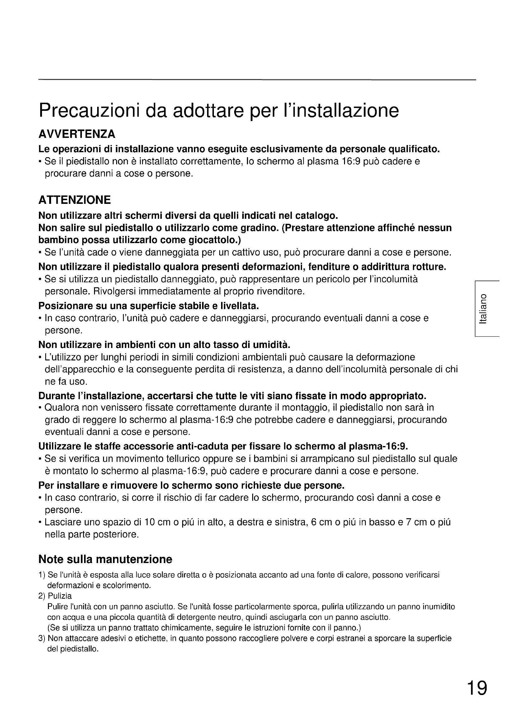 - Se il piedistallo non è installato correttamente, Io schermo al plasma 16:9 può cadere e procurare danni a cose o persone. ATTENZIONE Non utilizzare altri schermi diversi da quelli indicati nel catalogo. Non salire sul piedistallo o utilizzarlo come gradino. (Prestare attenzione affinché nessun bambino possa utilizzarlo come giocattolo.)
