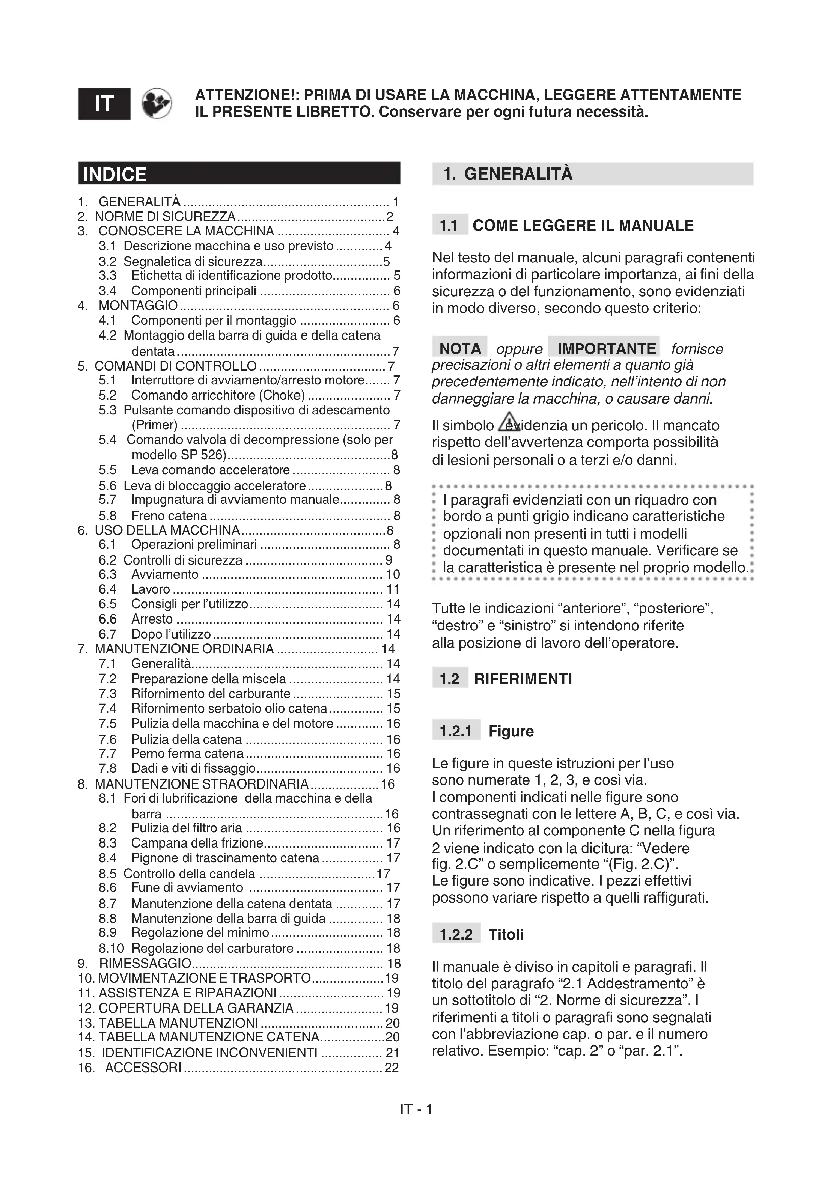 Il manuale è diviso in capitoli e paragra. Il titolo del paragrafo “2.1 Addestramento” è un sottotitolo di “2. Norme di sicurezza”. I riferimenti a titoli o paragra sono segnalati con l’abbreviazione cap. o par. e il numero relativo. Esempio: “cap. 2” o “par. 2.1”. ATTENZIONE!: PRIMA DI USARE LA MACCHINA, LEGGERE ATTENTAMENTE IL PRESENTE LIBRETTO. Conservare per ogni futura necessità.