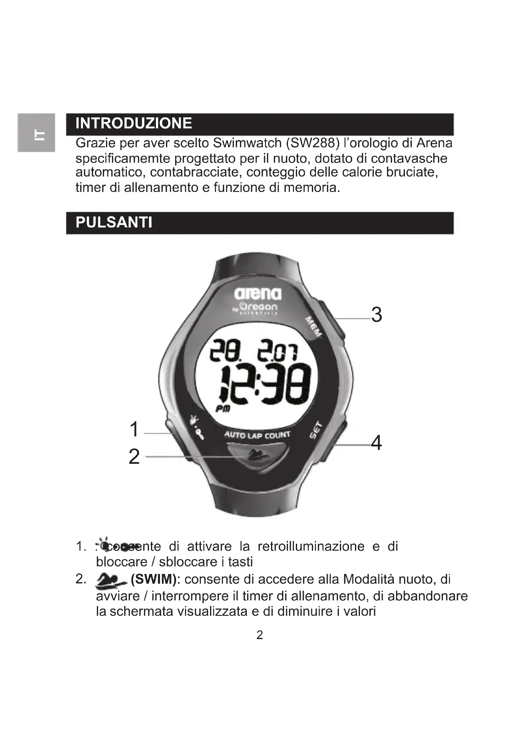 INTRODUZIONE Grazie per aver scelto Swimwatch (SW288) l’orologio di Arena specificamemte progettato per il nuoto, dotato di contavasche automatico, contabracciate, conteggio delle calorie bruciate, timer di allenamento e funzione di memoria. PULSANTI