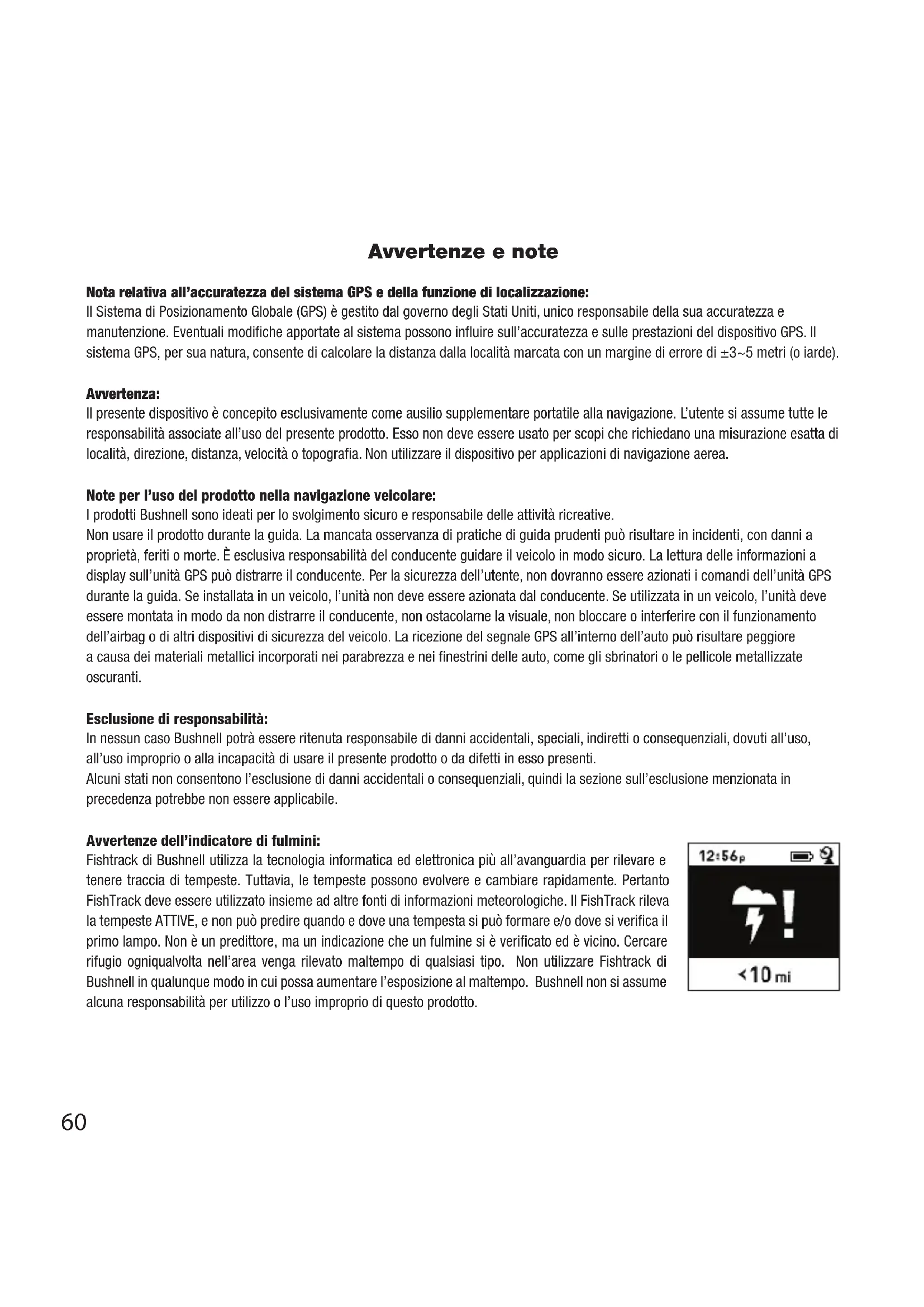 Il Fishtrack di Bushnell include una funzione rilevatore di fulmini. Quando nell’area locale viene rilevato un fulmine, sullo schermo verrà visualizzato un allarme ottico (Fig. 10). Si deve spingere fisicamente uno qualsiasi dei 4 pulsanti per cancellare questo avviso dallo schermo. Il rilevatore informerà di lampi entro un raggio di 15 miglia dalla posizione dell’utente. L’indicatore di fulmini non ha bisogno di ottenere un blocco del segnale GPS per avvisare di un lampo; tuttavia, non è possibile alcun avviso, e non apparirà nessuna avvertenza, se l’unità viene disattivata.