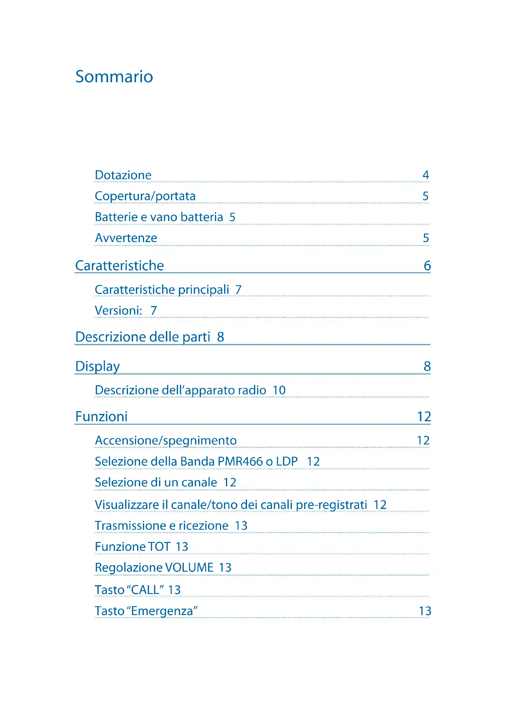 Midland G9/G9E PlusSommario Dotazione 4 Copertura/portata 5 Batterie e vano batteria 5 Avvertenze 5 Caratteristiche 6 Caratteristiche principali 7 Versioni: 7 Descrizione delle parti 8 Display 8 Descrizione dell’apparato radio 10 Funzioni 12 Accensione/spegnimento 12 Selezione della Banda PMR466 o LDP 12 Selezione di un canale 12 Visualizzare il canale/tono dei canali pre-registrati 12 Trasmissione e ricezione 13 Funzione TOT 13 Regolazione VOLUME 13 Tasto “CALL” 13 Tasto “Emergenza” 13Manuale d’uso Midland G9/G9E Plus | 3 Blocco tastiera 14 Funzione MON (Monitor)/Squelch 14 Scansione di tutti i canali 14 Selezione di un canale 15 Impostazione toni CTCSS/DCS 15 Funzione Alta - Bassa potenza 17 Funzione Vibra-CALL 18 Funzione CALL 18 Funzione ROGER BEEP 19 Beep Tastiera 19 Funzione chiamata Emergenza 19 Cambio canale di emergenza 20 Funzione DUAL WATCH 21 Illuminazione del display 22 Risparmio energia 22 Ricarica delle batterie 23 Specifiche tecniche 244 | Manuale d’uso Midland G9/G9E Plus Grazie per aver scelto i prodotti Midland! L’apparato Midland G9 Plus è un ricetrasmettitore che può essere utilizzato senza licenza, in quasi tutta Europa. Come previsto da dl 259 del 01/08/2003, successive integrazioni e da nota 101C del PNF, gli apparati PMR446 sono soggetti ad una dichiarazione d’utilizzo e ad un contributo annuo. Per ottenere la modulistica e le modalità di ottenimento dell’autorizzazione generale contattate l’Ispettorato Territoriale nel vostro capo- luogo di regione o visitate il sito web del Ministero delle Comunicazioni (www. urpcomunicazioni.it oppure www.urpcomunicazioni.it/ispettorati). L’utilizzo dell’apparato è consentito solamente dopo aver inviato la pratica all’Ispettorato Territoriale. Raccomandiamo di conservare una copia di tale pratica. L’apparato Midland G9 Plus grazie all’utilizzo delle tecnologie più avan- zate nel campo della radiocomunicazione ed alla sua robusta struttura meccanica è decisamente la soluzione più affidabile ed ideale per la gestione professionale di team di lavoro, per la comunicazione con più persone all’interno di cantieri, di edifici e nelle manifestazioni sportive. Midland G9 Plus è disponibile in due modelli: