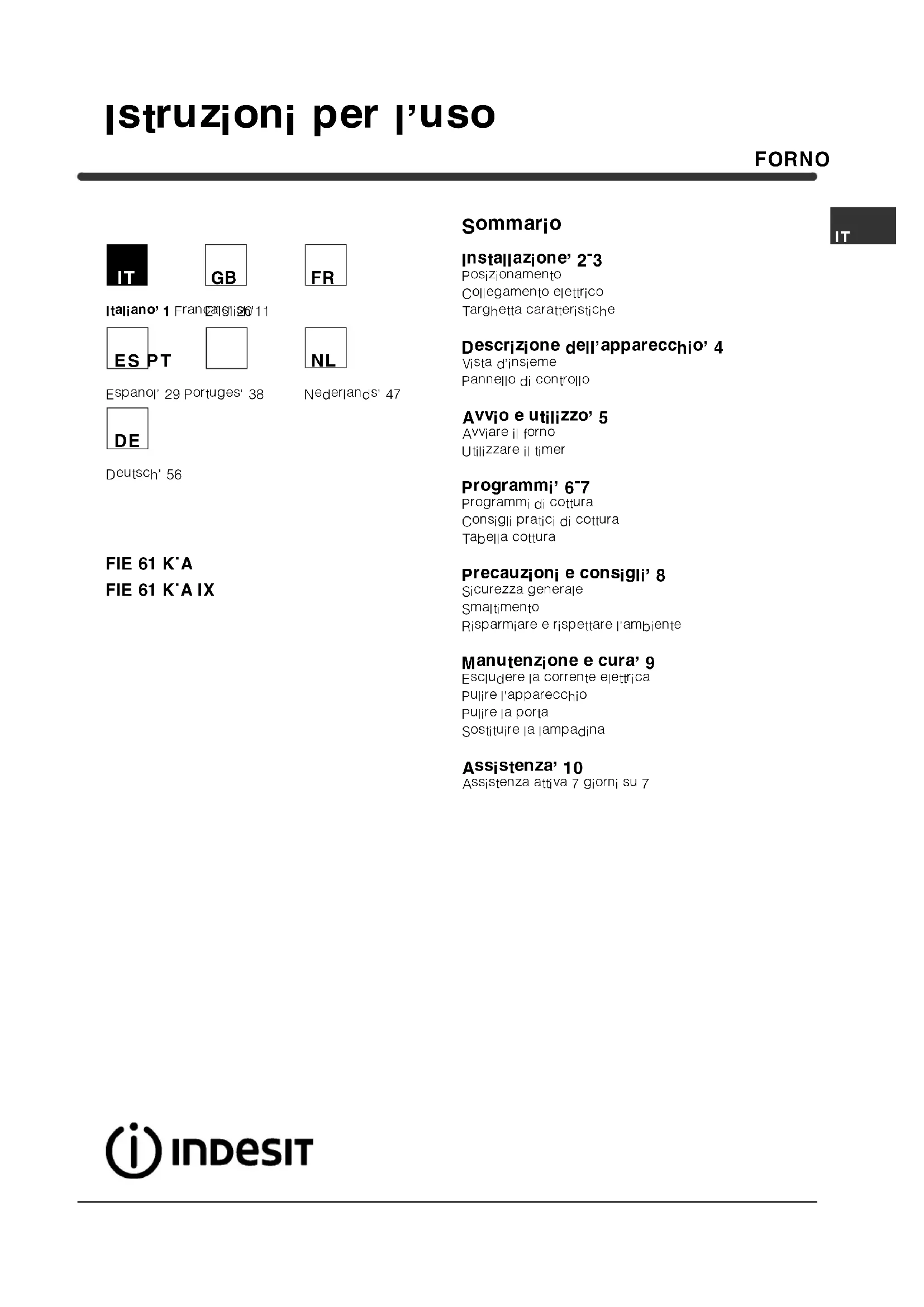 FIE 61 K.A IX - Forno INDESIT - Manuale utente e istruzioni gratuiti