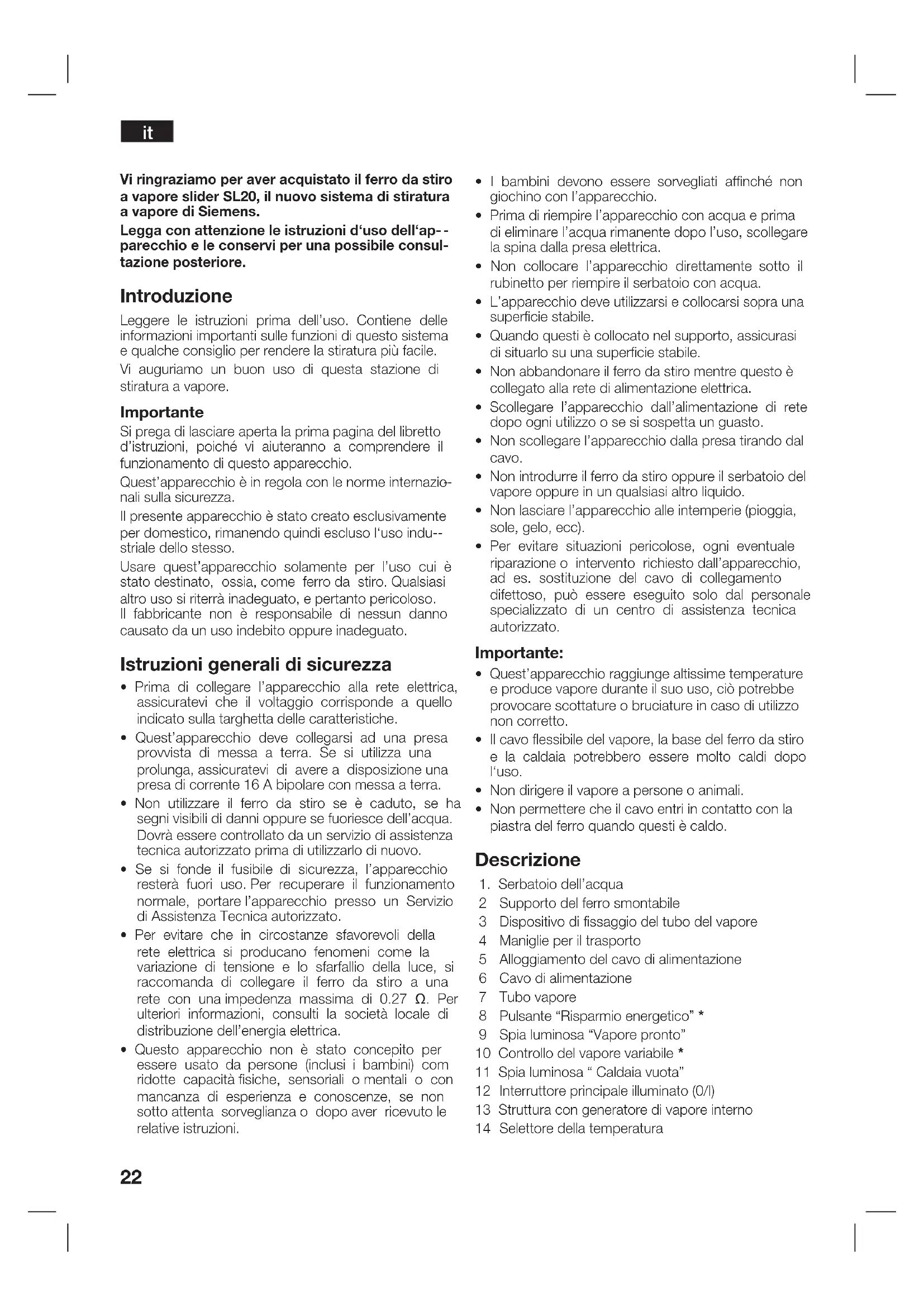 Vi ringraziamo per aver acquistato il ferro da stiro a vapore slider SL20, il nuovo sistema di stiratura a vapore di Siemens. Legga con attenzione le istruzioni d‘uso dell‘ap-