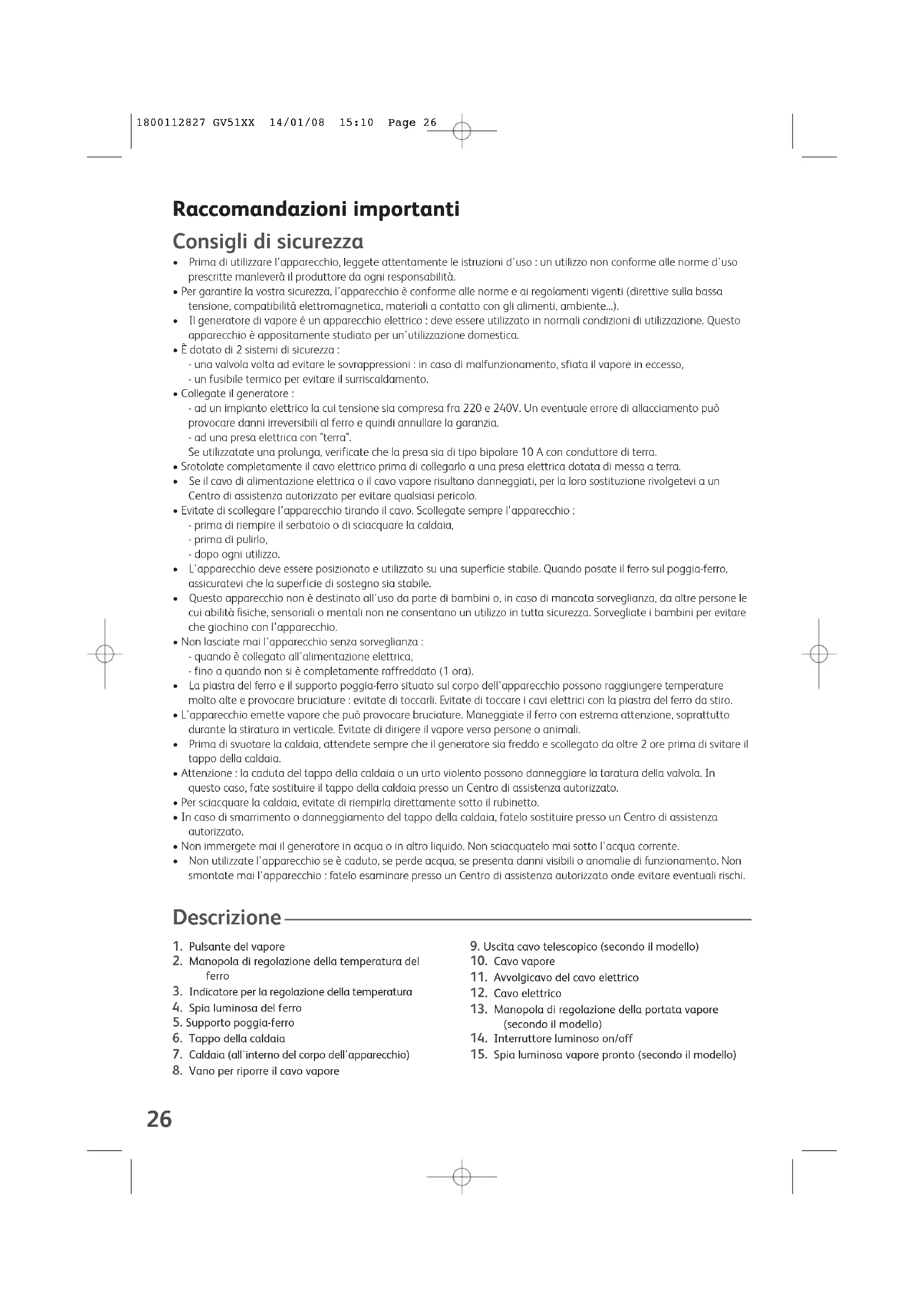 - Attenzione : Per prolungare il funzionamento della caldaia ed evitare le fuoriu-scite di cal-care, dovete obbligatoriamente sciacquare la caldaia ogni 10 utilizzi (H) (circa una volta almese).• Verificate che il generatore sia freddo e scollegato da più di 2 ore.• Servendovi di una caraffa, riempite per 3/4 la caldaia con acqua del rubinetto.• Agitate il corpo dell'apparecchio per alcuni secondi e svuotatelo completamente nellavello (I).• Per risultati ottimali, si consiglia di ripetere l'operazione una seconda volta. Risoluzione dei problemi del generatore Se non è possibile determinare la causa di un guasto, rivolgetevi a un Centro di assistenza autorizzato.Se l'acqua che utilizzateè calcarea, aumentate lafrequenza di risciacquo. Per sciacquare la caldaianon utilizzateassolutamente prodottidi decalcificazione :potrebbero danneggiarla. Problemi Possibili cause Soluzioni L'acqua cola attraverso i fori della piastra. Nella caldaia c'è troppa acqua.Il termostato non è regolato correttamente : latemperatura è troppo bassa.Utilizzate il vapore quando il ferro non èsufficientemente caldo.L'acqua si è condensata nei tubi poiché è laprima volta che utilizzate il vapore o non loutilizzate da un po' di tempo.Non riempite la caldaia fino all'orlo.Contattate un Centro di assistenzaautorizzato.Verificate la regolazione del termostato e dellaportata vapore (secondo il modello).Premete il pulsante del vapore lontanodall'asse da stiro fino a quando il ferroemette vapore.Dai fori della piastra escono colaturebianche.Dalla caldaia fuoriesce il calcare poiché nonè sciacquata regolarmente.Sciacquate la caldaia ogni 10 utilizzi(vedere § Sciacquate la caldaia). Se l'acquache utilizzate è calcarea, aumentate lafrequenza di risciacquo.Dai fori della piastra escono colature scureche macchiano i tessuti.Utilizzate acqua contenente prodotti didecalcificazione chimici o additivi.Non aggiungete alcun prodotto all'acquadella caldaia (vedere § Che tipo di acquaoccorre utilizzare ?).La piastra è sporca o scura e può macchiarei tessuti.Avete regolato il termostato su unatemperatura troppo elevata.I capi non sono stati sufficientementesciacquati oppure avete stirato unindumento nuovo senza averlo lavato.Utilizzate amido.Seguite i consigli del produttore sullaregolazione della temperatura.Assicuratevi che i capi siano sciacquati asufficienza per rimuovere eventuali residuidi sapone o prodotti chimici dagliindumenti nuovi.Spruzzate sempre l'amido sul rovescio dellato da stirare.L'apparecchio produce poco o non produceaffatto vapore.La caldaia è vuota.La caldaia non è ancora pronta.Riempite la caldaia.Dopo la messa in funzionedell'apparecchio, attendete 8 minutioppure che la spia luminosa vapore prontosi accenda (secondo il modello).Fuoriesce vapore dal tappo. Il tappo non è ben chiuso.La guarnizione del tappo è danneggiata.L'apparecchio è difettoso.Avvitate bene il tappo.Contattate un Centro di assistenzaautorizzato.Non utilizzate più il generatore e contattate unCentro di assistenza autorizzato.Vapore o acqua fuoriescono da sottol'apparecchio.L'apparecchio è difettoso. Non utilizzate più il generatore e contattate unCentro di assistenza autorizzato. Partecipiamo alla protezione dell’ambiente ! Il vostro apparecchio è composto da diversi materiali che possono essere riciclati. Lasciatelo in un punto di raccolta o presso un Centro Assistenza Autorizzato. 1800112827 GV51XX 14/01/08 15:10 Page 2930