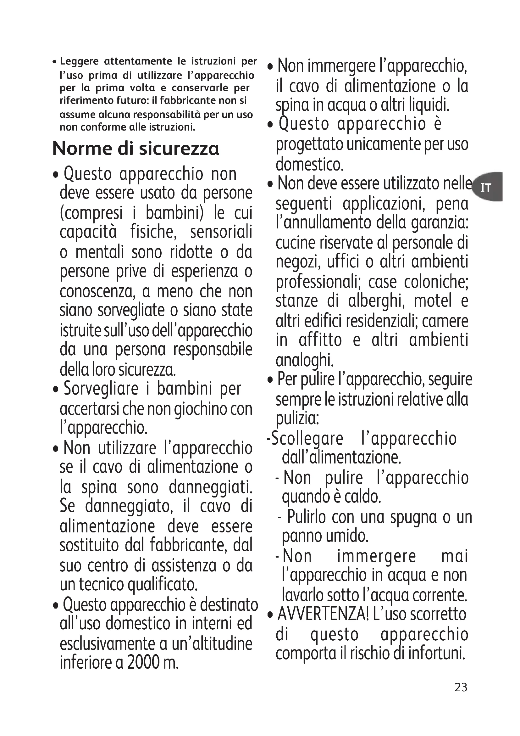 - Leggere attentamente le istruzioni per l’uso prima di utilizzare l’apparecchio per la prima volta e conservarle per riferimento futuro: il fabbricante non si assume alcuna responsabilità per un uso non conforme alle istruzioni. Norme di sicurezza