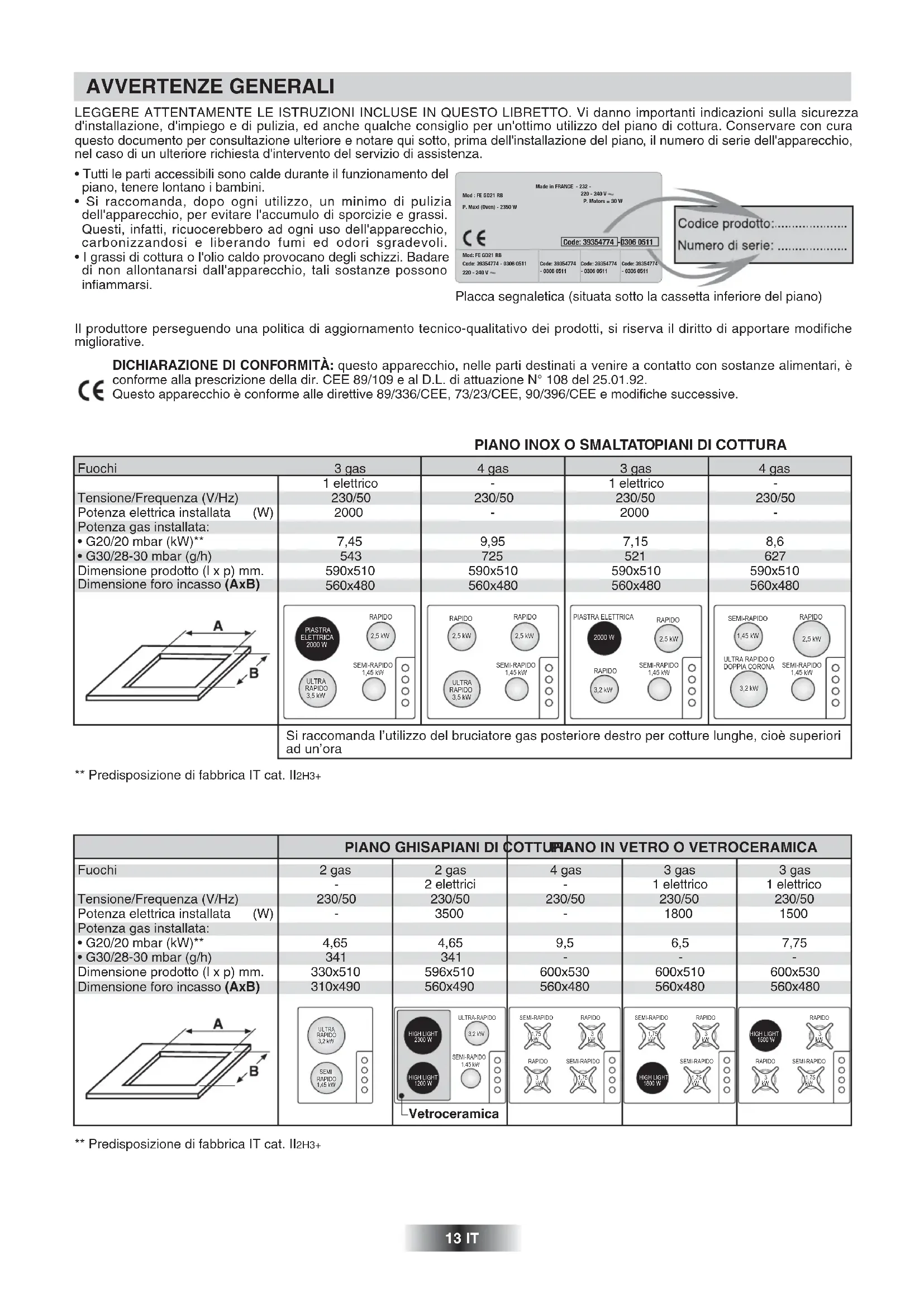 CERTIFICATO DI GARANZIA CONVENZIONALE: cosa fare? Il Suo prodotto è garantito, alle condizioni e nei termini riportati sul certificato inserito nel prodotto ed in base alle previsioni del decreto legislativo 24/02, nonché del decreto legislativo 6 settembre 2005, n. 206, per un periodo di 24 mesi decorrenti dalla data di consegna del bene. Così come riportato nei testi dei Decreti Legislativi citati, il certificato di garanzia dovrà essere da Lei conservato, debitamente compilato, per essere mostrato al Servizio Assistenza Tecnica Autorizzato, in caso di necessità, unitamente ad un documento fiscalmente valido rilasciato dal rivenditore al momento dell’acquisto (bolla di consegna, fattura, scontrino fiscale, altro) sul quale siano indicati il nominativo del rivenditore, la data di consegna, gli estremi identificativi del prodotto ed il prezzo di cessione Resta pure inteso che, salvo prova contraria, poiché si presume che i difetti di conformità che si manifestano entro sei mesi dalla consegna del bene esistessero già a tale data, a meno che tale ipotesi sia incompatibile con la natura del bene o con la natura del difetto di conformità, il Servizio di Assistenza Tecnica Autorizzato Gias, verificato il diritto all’intervento, lo effettuerà senza addebitare il diritto fisso di intervento a domicilio, la manodopera ed i ricambi. Per contro, nel successivo periodo di diciotto mesi di vigenza della garanzia, sarà invece onere del consumatore che intenda fruire dei rimedi accordati dalla garanzia stessa provare l’esistenza del difetto di conformità del bene sin dal momento della consegna; nel caso in cui il consumatore non fosse in grado di fornire detta prova, non potranno essere applicate le condizioni di garanzia previste e pertanto il Servizio di Assistenza Tecnica Autorizzato Gias effettuerà l’intervento addebitando al consumatore tutti i costi relativi. ESTENSIONE DELLA GARANZIA FINO A 5 ANNI : come? Le ricordiamo inoltre che sullo stesso certificato di garanzia convenzionale Lei troverà le informazioni ed i documenti necessari per prolungare la garanzia dell’apparecchio sino a 5 anni e così, in caso di guasto, non pagare il diritto fisso di intervento a domicilio, la manodopera ed i ricambi. Per qualsiasi informazione necessitasse, La preghiamo rivolgersi al numero telefonico del Servizio Clienti 0392086811. ANOMALIE E MALFUNZIONAMENTI: a chi rivolgersi ? Per qualsiasi necessità il centro assistenza autorizzato è a Sua completa disposizione per fornirLe i chiarimenti necessari. UN SOLO NUMERO TELEFONICO PER OTTENERE ASSISTENZA. Qualora il problema dovesse persistere, componendo il “Numero Utile” sotto indicato, sarà messo in contatto direttamente con il Servizio Assistenza Tecnica Autorizzato che opera nella Sua zona di residenza. Attenzione, la chiamata è a pagamento; il costo verrà comunicato, tramite messaggio vocale, dal Servizio clienti dell’operatore telefonico utilizzato. Dettagli sono presenti sul sito internet www.rosieres.fr MATRICOLA DEL PRODOTTO. Dove si trova? E’ indispensabile che comunichi al Servizio Assistenza Tecnica Autorizzato la sigla del prodotto ed il numero di matricola (16 caratteri che iniziano con la cifra 3) che troverà sul certificato di garanzia oppure sulla targa matricola del prodotto (applicata sotto al prodotto). In questo modo Lei potrà contribuire ad evitare trasferte inutili del tecnico, risparmiando oltretutto i relativi costi.INSTRUCCIONES GENERALES 19 ES LEA ATENTAMENTE ESTAS INSTRUCCIONES, PARA PODER SACAR EL MÁXIMO PARTIDO DE SU PLACA DE COCCIÓN. Le aconsejamos que guarde estas instrucciones de instalación y utilización a fin de poderlas consultar posteriormente y que, antes de instalar la placa de cocción, anote en el espacio que hay más abajo el número de serie del aparato, por si tuviera que solicitar una eventual intervención del servicio de asistencia técnica. Made in FRANCE - 232 -220 - 240 V P. Motors = 30 WMod : FE GD21 RBP. Maxi (Oven) - 2350 W Code: 39354774 -0306 0511 Mod: FE GD21 RBCode: 39354774 - 0306 0511220 - 240 VCode: 39354774- 0306 0511Code: 39354774- 0306 0511Code: 39354774- 0306 0511