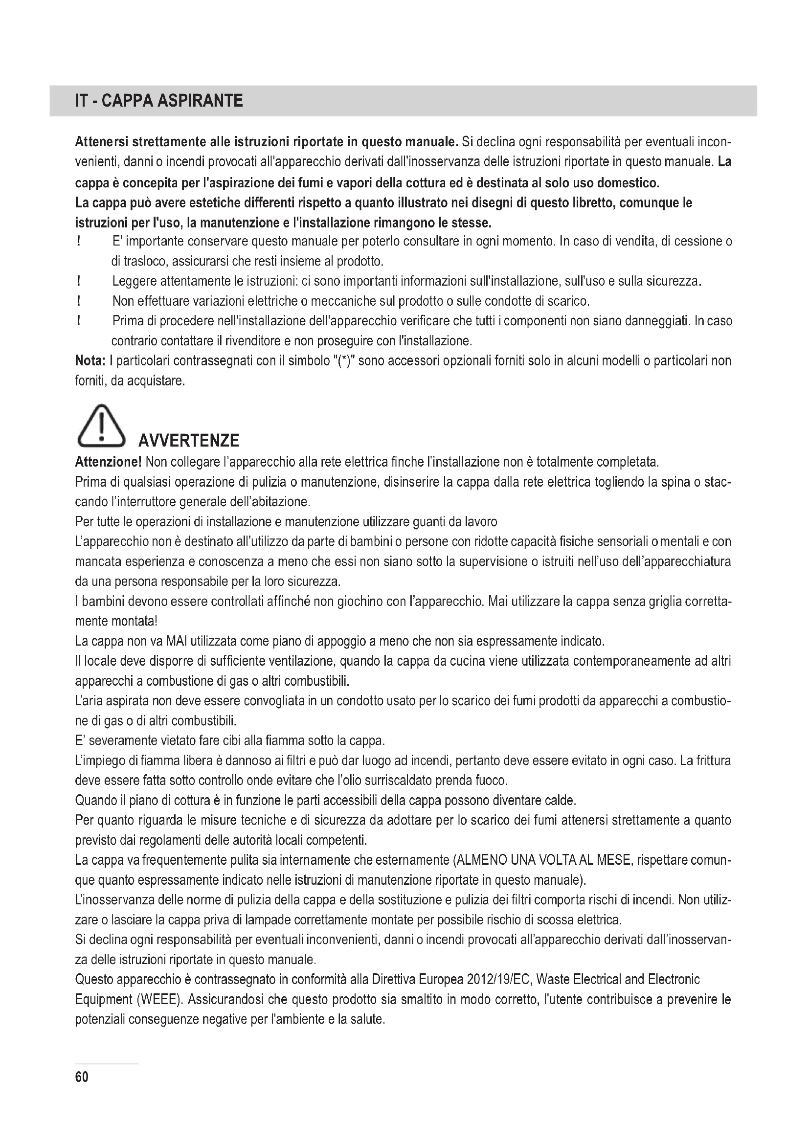 Attenersi strettamente alle istruzioni riportate in questo manuale. Si declina ogni responsabilità per eventuali incon- venienti, danni o incendi provocati all'apparecchio derivati dall'inosservanza delle istruzioni riportate in questo manuale. La cappa è concepita per l'aspirazione dei fumi e vapori della cottura ed è destinata al solo uso domestico. La cappa può avere estetiche differenti rispetto a quanto illustrato nei disegni di questo libretto, comunque le istruzioni per l'uso, la manutenzione e l'installazione rimangono le stesse. ! E' importante conservare questo manuale per poterlo consultare in ogni momento. In caso di vendita, di cessione o di trasloco, assicurarsi che resti insieme al prodotto. ! Leggere attentamente le istruzioni: ci sono importanti informazioni sull'installazione, sull'uso e sulla sicurezza. ! Non effettuare variazioni elettriche o meccaniche sul prodotto o sulle condotte di scarico. ! Prima di procedere nell'installazione dell'apparecchio vericare che tutti i componenti non siano danneggiati. In caso contrario contattare il rivenditore e non proseguire con l'installazione. Nota: I particolari contrassegnati con il simbolo "(*)" sono accessori opzionali forniti solo in alcuni modelli o particolari non forniti, da acquistare. AVVERTENZE Attenzione! Non collegare l’apparecchio alla rete elettrica nche l’installazione non è totalmente completata. Prima di qualsiasi operazione di pulizia o manutenzione, disinserire la cappa dalla rete elettrica togliendo la spina o stac- cando l’interruttore generale dell’abitazione. Per tutte le operazioni di installazione e manutenzione utilizzare guanti da lavoro L’apparecchio non è destinato all’utilizzo da parte di bambini o persone con ridotte capacità siche sensoriali o mentali e con mancata esperienza e conoscenza a meno che essi non siano sotto la supervisione o istruiti nell’uso dell’apparecchiatura da una persona responsabile per la loro sicurezza. I bambini devono essere controllati afnché non giochino con l’apparecchio. Mai utilizzare la cappa senza griglia corretta- mente montata! La cappa non va MAI utilizzata come piano di appoggio a meno che non sia espressamente indicato. Il locale deve disporre di sufciente ventilazione, quando la cappa da cucina viene utilizzata contemporaneamente ad altri apparecchi a combustione di gas o altri combustibili. L’aria aspirata non deve essere convogliata in un condotto usato per lo scarico dei fumi prodotti da apparecchi a combustio- ne di gas o di altri combustibili. E’ severamente vietato fare cibi alla amma sotto la cappa. L’impiego di amma libera è dannoso ai ltri e può dar luogo ad incendi, pertanto deve essere evitato in ogni caso. La frittura deve essere fatta sotto controllo onde evitare che l’olio surriscaldato prenda fuoco. Quando il piano di cottura è in funzione le parti accessibili della cappa possono diventare calde. Per quanto riguarda le misure tecniche e di sicurezza da adottare per lo scarico dei fumi attenersi strettamente a quanto previsto dai regolamenti delle autorità locali competenti. La cappa va frequentemente pulita sia internamente che esternamente (ALMENO UNA VOLTA AL MESE, rispettare comun- que quanto espressamente indicato nelle istruzioni di manutenzione riportate in questo manuale). L’inosservanza delle norme di pulizia della cappa e della sostituzione e pulizia dei ltri comporta rischi di incendi. Non utiliz- zare o lasciare la cappa priva di lampade correttamente montate per possibile rischio di scossa elettrica. Si declina ogni responsabilità per eventuali inconvenienti, danni o incendi provocati all’apparecchio derivati dall’inosservan- za delle istruzioni riportate in questo manuale. Questo apparecchio è contrassegnato in conformità alla Direttiva Europea 2012/19/EC, Waste Electrical and Electronic Equipment (WEEE). Assicurandosi che questo prodotto sia smaltito in modo corretto, l'utente contribuisce a prevenire le potenziali conseguenze negative per l'ambiente e la salute.61 I l s i m b o l o sul prodotto o sulla documentazione di accompagnamento indica che questo prodotto non deve essere trattato come riuto domestico ma deve essere consegnato presso l'idoneo punto di raccolta per il riciclaggio di ap- parecchiature elettriche ed elettroniche. Disfarsene seguendo le normative locali per lo smaltimento dei riuti. Per ulteriori informazioni sul trattamento, recupero e riciclaggio di questo prodotto, contattare l'idoneo ufcio locale, il servizio di raccolta dei riuti domestici o il negozio presso il quale il prodotto è stato acquistato. Apparecchiatura progettata, testata e realizzata nel rispetto delle norme sulla: