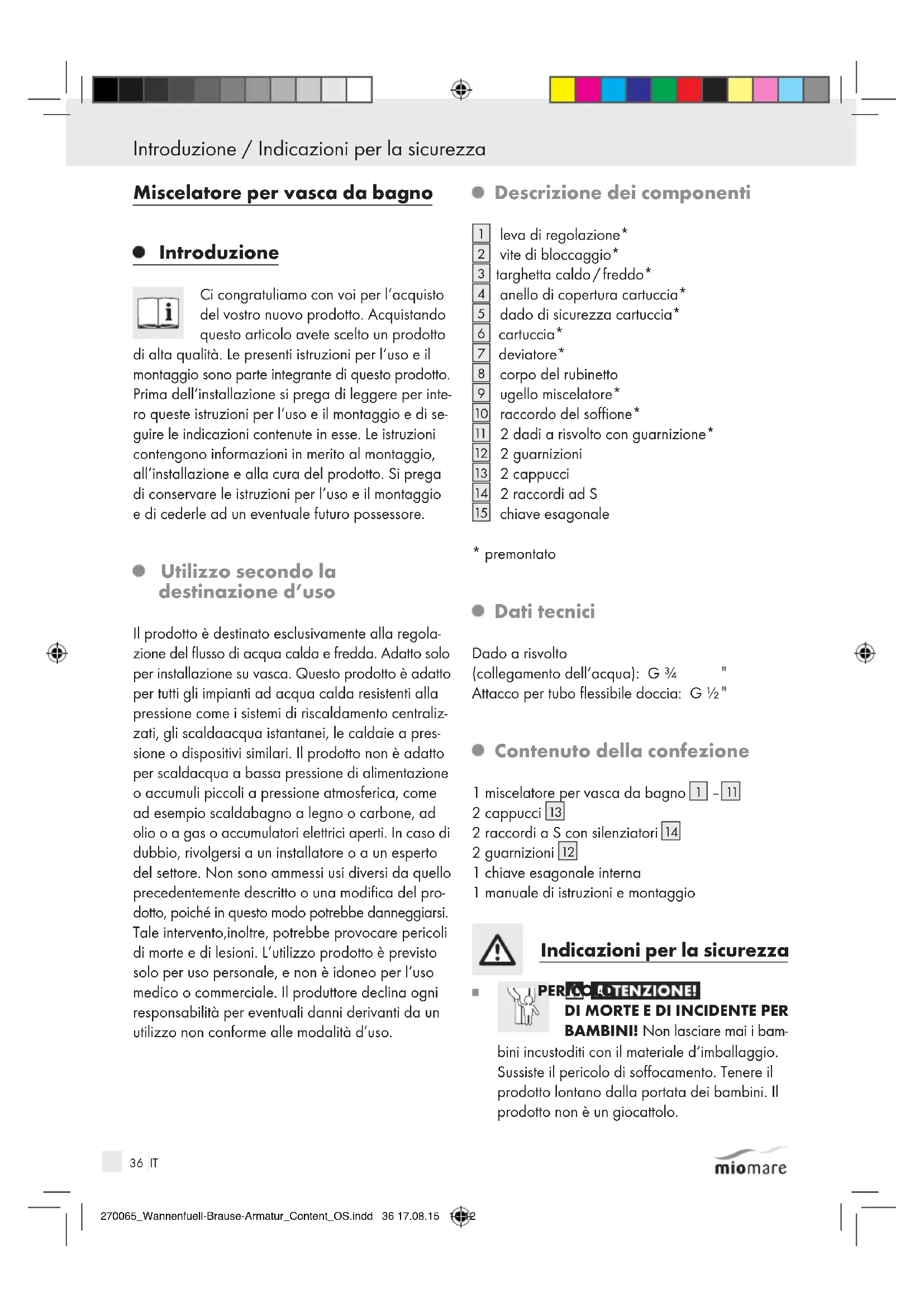 - Número gratuito IAN 270065 Para realizar cualquier consulta, tenga a mano el ticket y el número de artículo (por ej. IAN 12345) como como justificantes de compra. Denominación del producto: Grifo para bañera / ducha Número de Eisl Sanitär: NI023DISE-LIDL2 Indice 270065_Wannenfuell-Brause-Armatur_Content_OS.indd 34 17.08.15 16:1235 IT Garantía y servicio técnico Indice Introduzione Utilizzo secondo la destinazione d’uso ......................................................................................... Pagina 36 Descrizione dei componenti ........................................................................................................... Pagina 36 Dati tecnici ....................................................................................................................................... Pagina 36 Contenuto della confezione ........................................................................................................... Pagina 36 Indicazioni per la sicurezza ......................................................................................... Pagina 36 Montaggio Collegamento del miscelatore ....................................................................................................... Pagina 37 Collegamento degli accessori (flessibile doccia e doccetta) ....................................................... Pagina 37 Uso Messa in funzione ........................................................................................................................... Pagina 38 Manutenzione e pulizia Cura e pulizia del miscelatore ....................................................................................................... Pagina 38 Sostituzione della cartuccia ............................................................................................................ Pagina 38 Smaltimento .............................................................................................................................. Pagina 39 Informazioni Potabilità dell‘acqua di rubinetto ................................................................................................... Pagina 39 Garanzia e assistenza ...................................................................................................... Pagina 39 270065_Wannenfuell-Brause-Armatur_Content_OS.indd 35 17.08.15 16:1236 IT Miscelatore per vasca da bagno Introduzione Ci congratuliamo con voi per l‘acquisto del vostro nuovo prodotto. Acquistando questo articolo avete scelto un prodotto di alta qualità. Le presenti istruzioni per l‘uso e il montaggio sono parte integrante di questo prodotto. Prima dell‘installazione si prega di leggere per inte- ro queste istruzioni per l‘uso e il montaggio e di se- guire le indicazioni contenute in esse. Le istruzioni contengono informazioni in merito al montaggio, all‘installazione e alla cura del prodotto. Si prega di conservare le istruzioni per l‘uso e il montaggio e di cederle ad un eventuale futuro possessore. Utilizzo secondo la destinazione d’uso Il prodotto è destinato esclusivamente alla regola- zione del flusso di acqua calda e fredda. Adatto solo per installazione su vasca. Questo prodotto è adatto per tutti gli impianti ad acqua calda resistenti alla pressione come i sistemi di riscaldamento centraliz- zati, gli scaldaacqua istantanei, le caldaie a pres- sione o dispositivi similari. Il prodotto non è adatto per scaldacqua a bassa pressione di alimentazione o accumuli piccoli a pressione atmosferica, come ad esempio scaldabagno a legno o carbone, ad olio o a gas o accumulatori elettrici aperti. In caso di dubbio, rivolgersi a un installatore o a un esperto del settore. Non sono ammessi usi diversi da quello precedentemente descritto o una modifica del pro- dotto, poiché in questo modo potrebbe danneggiarsi. Tale intervento,inoltre, potrebbe provocare pericoli di morte e di lesioni. L‘utilizzo prodotto è previsto solo per uso personale, e non è idoneo per l‘uso medico o commerciale. Il produttore declina ogni responsabilità per eventuali danni derivanti da un utilizzo non conforme alle modalità d’uso. Descrizione dei componenti