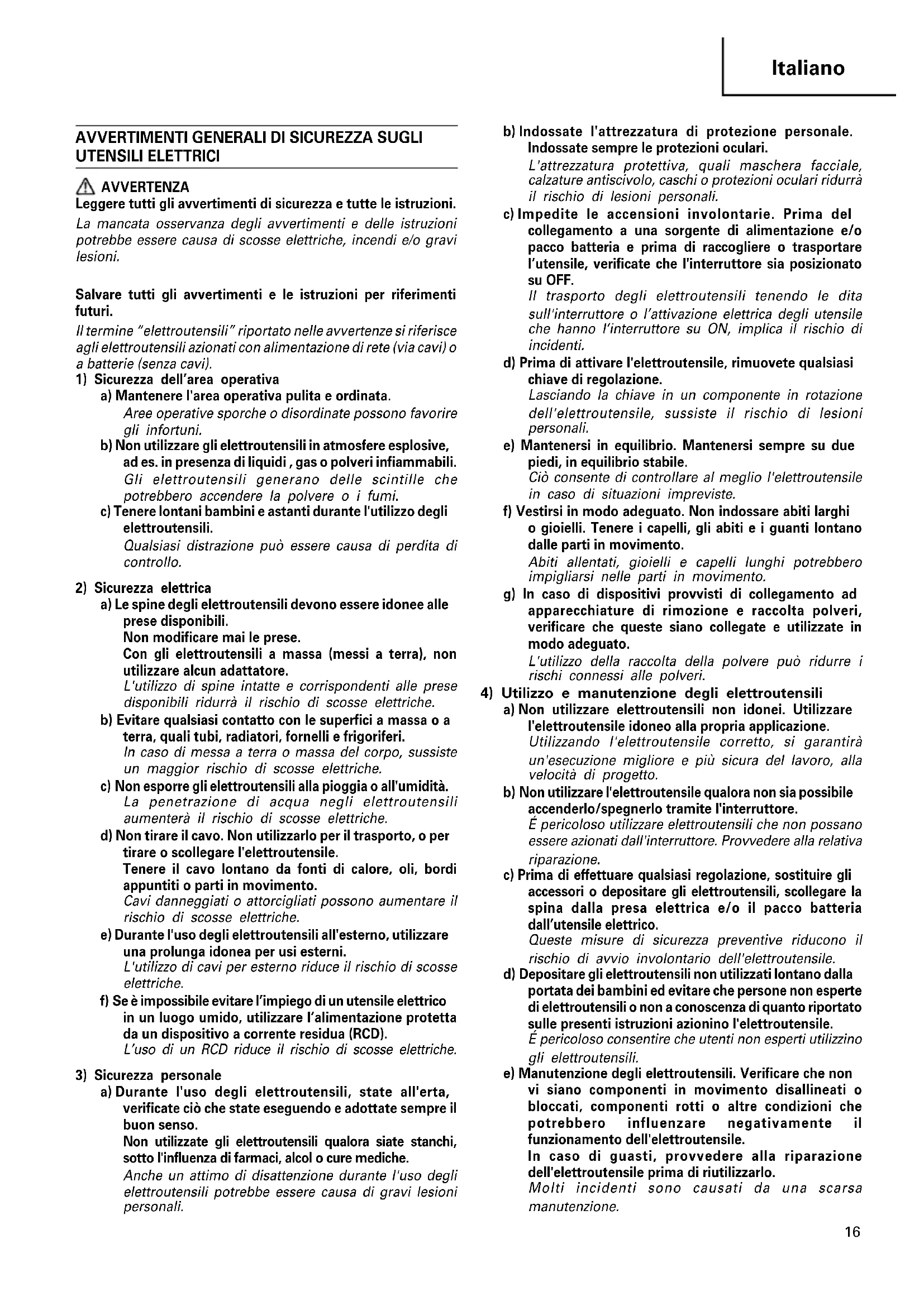 UTENSILI ELETTRICI AVVERTENZA Leggere tutti gli avvertimenti di sicurezza e tutte le istruzioni. La mancata osservanza degli avvertimenti e delle istruzioni potrebbe essere causa di scosse elettriche, incendi e/o gravi lesioni. Salvare tutti gli avvertimenti e le istruzioni per riferimenti futuri. Il termine “elettroutensili” riportato nelle avvertenze si riferisce agli elettroutensili azionati con alimentazione di rete (via cavi) o a batterie (senza cavi).