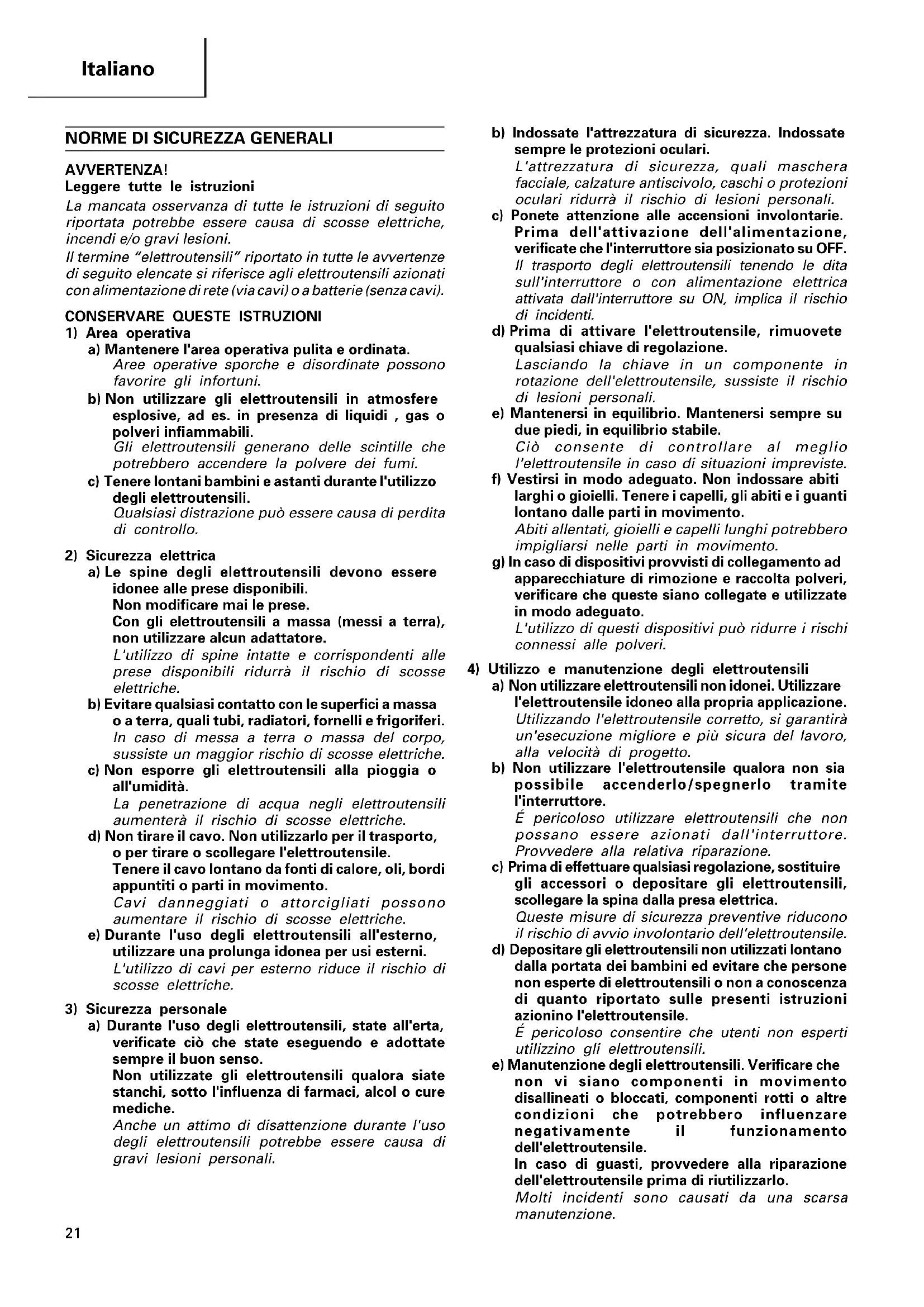 a) Non utilizzare elettroutensili non idonei. Utilizzare l'elettroutensile idoneo alla propria applicazione. Utilizzando l'elettroutensile corretto, si garantirà un'esecuzione migliore e più sicura del lavoro, alla velocità di progetto. b) Non utilizzare l'elettroutensile qualora non sia possibile accenderlo/spegnerlo tramite l'interruttore. É pericoloso utilizzare elettroutensili che non possano essere azionati dall'interruttore. Provvedere alla relativa riparazione. c) Prima di effettuare qualsiasi regolazione, sostituire gli accessori o depositare gli elettroutensili, scollegare la spina dalla presa elettrica. Queste misure di sicurezza preventive riducono il rischio di avvio involontario dell'elettroutensile. d) Depositare gli elettroutensili non utilizzati lontano dalla portata dei bambini ed evitare che persone non esperte di elettroutensili o non a conoscenza di quanto riportato sulle presenti istruzioni azionino l'elettroutensile. É pericoloso consentire che utenti non esperti utilizzino gli elettroutensili. e) Manutenzione degli elettroutensili. Verificare che non vi siano componenti in movimento disallineati o bloccati, componenti rotti o altre condizioni che potrebbero influenzare negativamente il funzionamento dell'elettroutensile. In caso di guasti, provvedere alla riparazione dell'elettroutensile prima di riutilizzarlo. Molti incidenti sono causati da una scarsa manutenzione. 04Ita_DH45SA_WE_6L 6/28/07, 12:2321Italiano