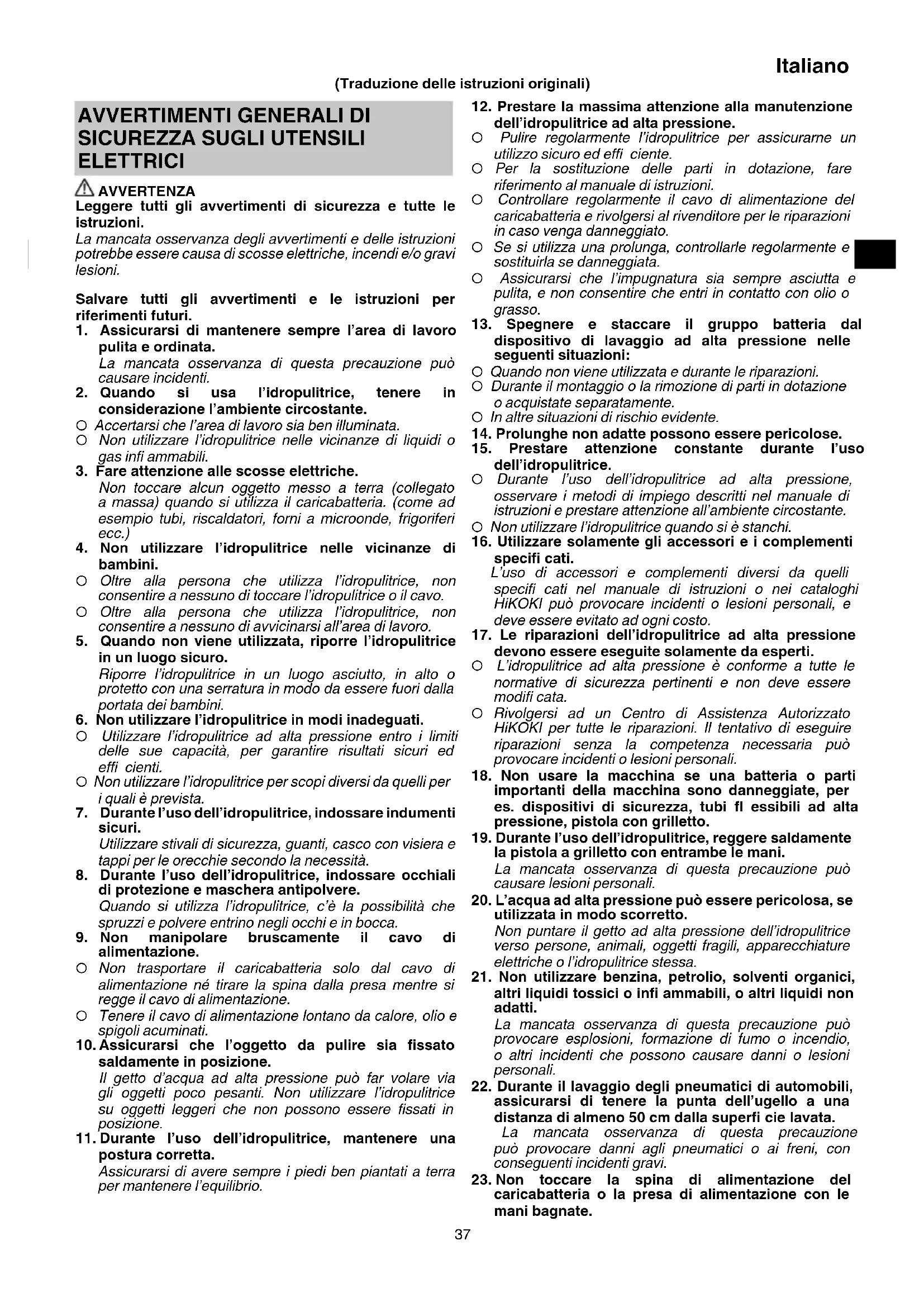 devono essere eseguite solamente da esperti. ○ L’idropulitrice ad alta pressione è conforme a tutte le normative di sicurezza pertinenti e non deve essere modifi cata. ○ Rivolgersi ad un Centro di Assistenza Autorizzato HiKOKI per tutte le riparazioni. Il tentativo di eseguire riparazioni senza la competenza necessaria può provocare incidenti o lesioni personali.