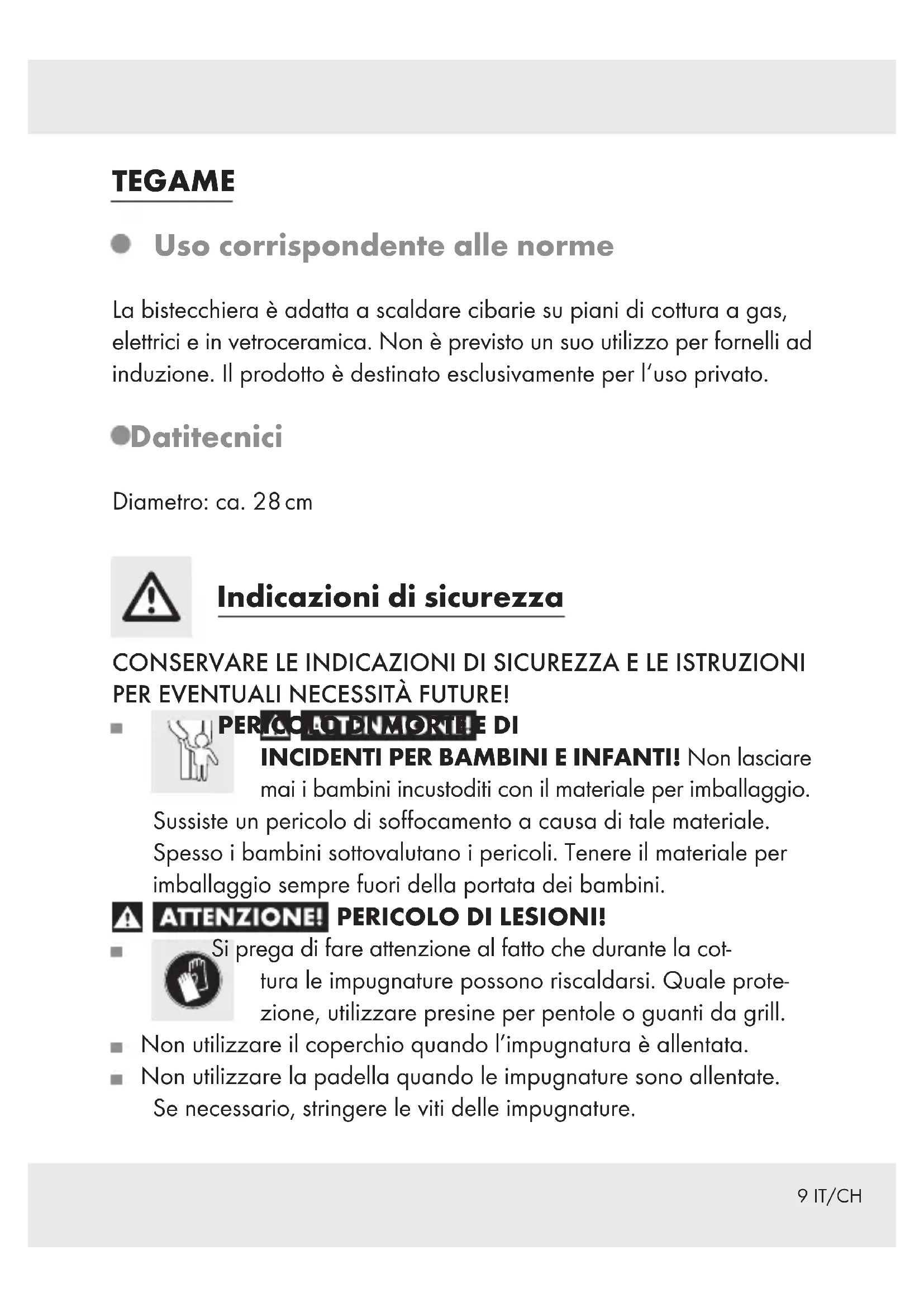 INCIDENTI PER BAMBINI E INFANTI! Non lasciare mai i bambini incustoditi con il materiale per imballaggio. Sussiste un pericolo di soffocamento a causa di tale materiale. Spesso i bambini sottovalutano i pericoli. Tenere il materiale per imballaggio sempre fuori della portata dei bambini. PERICOLO DI LESIONI! Si prega di fare attenzione al fatto che durante la cot- tura le impugnature possono riscaldarsi. Quale prote- zione, utilizzare presine per pentole o guanti da grill. Non utilizzare il coperchio quando l’impugnatura è allentata. Non utilizzare la padella quando le impugnature sono allentate. Se necessario, stringere le viti delle impugnature. 270365_DE_AT.indd 9 7/22/2015 2:19:15 PM10 IT/CH PERICOLO DI DANNI A COSE! Durante la cottura è estremamente importante non perdere di vista pentole e padelle nelle quali viene riscaldato del grasso. Infatti il grasso si può velocemente surriscaldare e prendere fuoco. Qualora il grasso dovesse prendere fuoco, non spegnere mai il fuoco con acqua! Soffocare le fiamme con il coperchio di una pentola o con una spessa coperta di lana. Per non danneggiare il rivestimento antiaderenza, utilizzare sola- mente utensili per cucina in plastica resistenti al calore o in legno. Non tagliare il cibo arrostito direttamente nella bistecchiera. Non porre carne bagnata nel grasso caldo. Il grasso che sprizza su una piastra da cucina incandescente può facilmente generare un incendio. Scegliere una piastra riscaldante che corrisponda al diametro della base della bistecchiera, e ciò al fine di evitare la perdita di calore. L’articolo è previsto per tenere caldi alimenti nel forno (massimo di 150 °C per 1 ora). Pulisca il prodotto dopo l‘uso. Consigliamo di effettuare il lavaggio a mano con acqua calda e detersivo perché la pulizia nella lavastoviglie può portare allo sco- lorimento delle parti in alluminio. ATTENZIONE! Il coperchio di vetro è fragile / non resistente agli urti. Durante il risciacquo a mano, pulire la pentola con acqua calda e detergente comunemente reperibile in commercio. Evitare l’utilizzo di oggetti affilati e appuntiti per non danneggiare il materiale. Per la pulizia non utilizzare abrasivi aggressivi. Non tirare o spingere il tegame su fornelli alogeni o in vetroceramica. In caso di mancata osservanza, si può giungere a danneggiamenti dovuti a graffi. 270365_DE_AT.indd 10 7/22/2015 2:19:16 PM11 IT/CH APPROVATO PER ALIMENTI! Le caratteristiche del sapore e dell‘odore non vengono pregiudicate mediante questo prodotto. Utilizzo Prima di utilizzare la pentola per la prima volta si prega di rimuovere dall’articolo eventuali adesivi, e successivamente risciacquarlo con acqua calda. Prima di utilizzare la padella per la prima volta, fare bollire dell’acqua per due o tre volte nella padella per rimuovere completamente eventuali residui di produzione. Ingrassare leggermente la bistecchiera. Non surriscaldare una padella vuota o contenente alimenti fritti, in quanto ciò potrebbe annullare l’effetto antiaderente e danneg- giare il rivestimento. Riscaldare il cibo utilizzando una cottura a calore medio / alto, e successivamente portare a termine la cottura a calore basso. Smaltimento L’imballaggio è composto da materiali ecologici, che possono essere smaltiti presso i siti di riciclaggio locali. Potete informarvi sulle possibilità di smaltimento del prodotto utilizzato all‘amministrazione comunale o cittadina. 270365_DE_AT.indd 11 7/22/2015 2:19:16 PM1 IAN 270365 OWIM GmbH & Co. KG Stiftsbergstraße 1 D-74167 Neckarsulm Model: HG00067 Version: 09/2015 IAN 270365 270365_DE_AT.indd 12 7/22/2015 2:19:16 PM