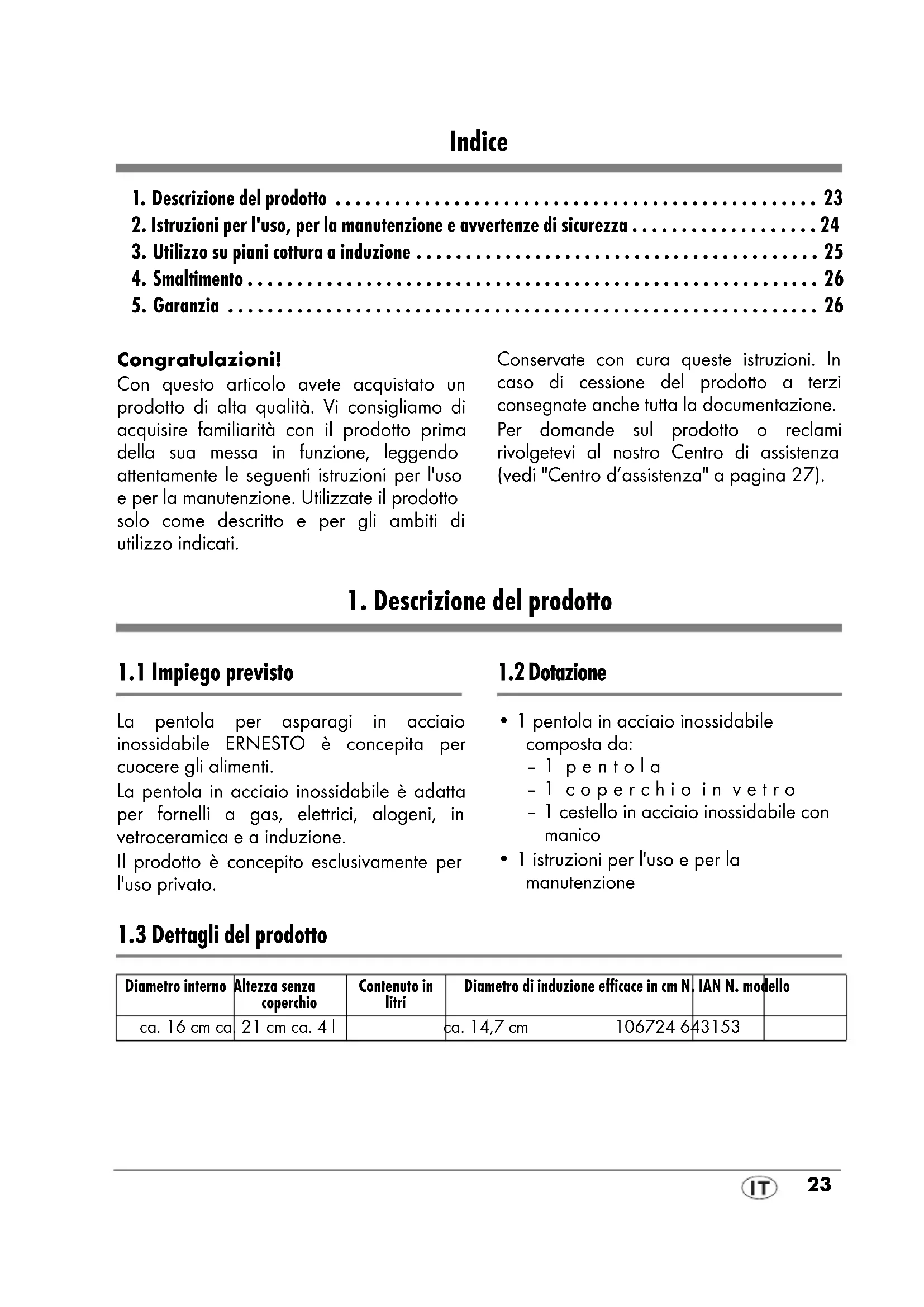 3. Utilizzo su piani cottura a induzione . . . . . . . . . . . . . . . . . . . . . . . . . . . . . . . . . . . . . . . . . 25 4. Smaltimento . . . . . . . . . . . . . . . . . . . . . . . . . . . . . . . . . . . . . . . . . . . . . . . . . . . . . . . . . . 26 5. Garanzia . . . . . . . . . . . . . . . . . . . . . . . . . . . . . . . . . . . . . . . . . . . . . . . . . . . . . . . . . . . . 26 Congratulazioni! Con questo articolo avete acquistato un prodotto di alta qualità. Vi consigliamo di acquisire familiarità con il prodotto prima della sua messa in funzione, leggendo attentamente le seguenti istruzioni per l'uso e per la manutenzione. Utilizzate il prodotto solo come descritto e per gli ambiti di utilizzo indicati. Conservate con cura queste istruzioni. In caso di cessione del prodotto a terzi consegnate anche tutta la documentazione. Per domande sul prodotto o reclami rivolgetevi al nostro Centro di assistenza (vedi "Centro d’assistenza" a pagina27).