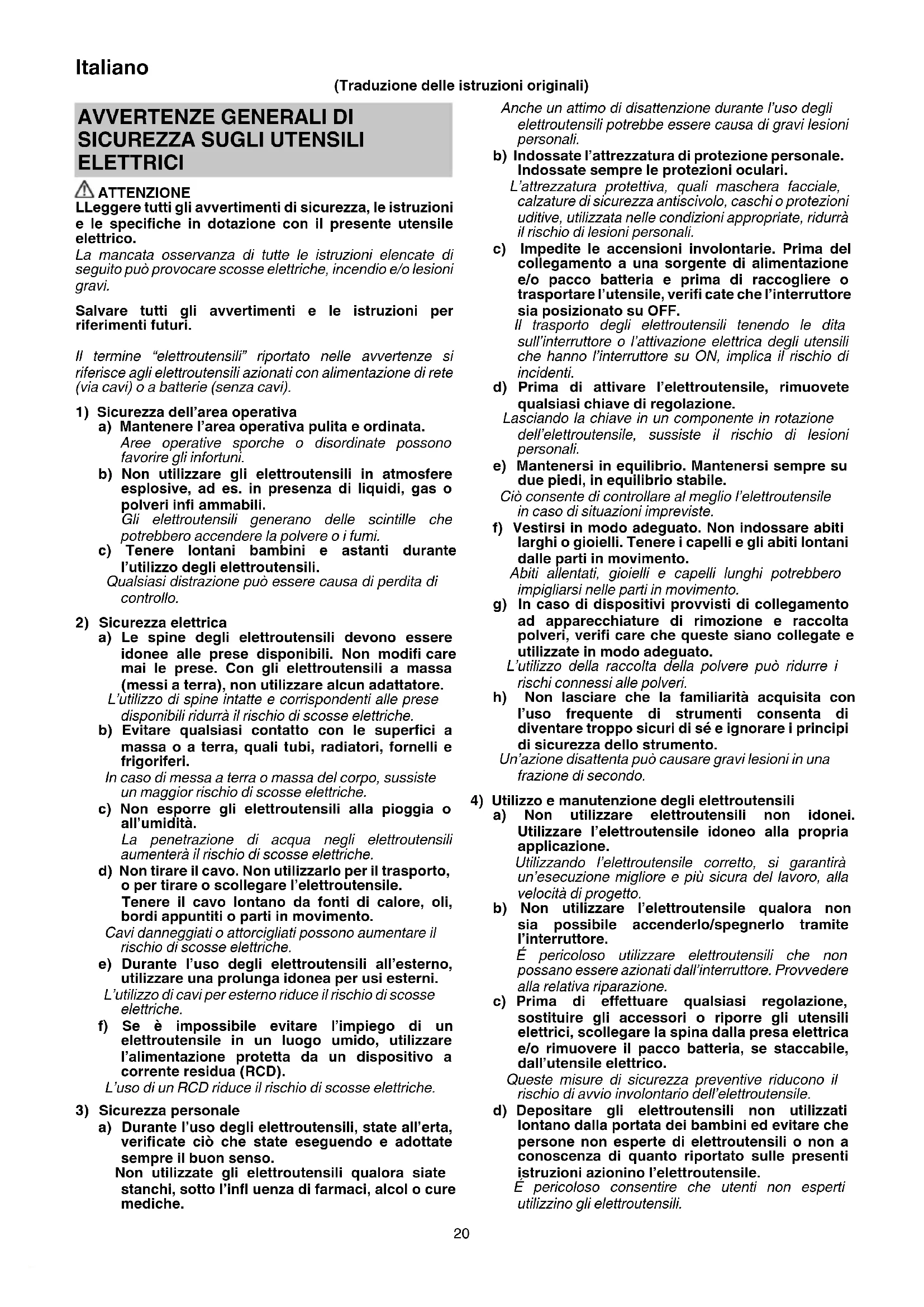 a) Mantenere l’area operativa pulita e ordinata. Aree operative sporche o disordinate possono favorire gli infortuni. b) Non utilizzare gli elettroutensili in atmosfere esplosive, ad es. in presenza di liquidi, gas o polveri infi ammabili. Gli elettroutensili generano delle scintille che potrebbero accendere la polvere o i fumi. c) Tenere lontani bambini e astanti durante l’utilizzo degli elettroutensili. Qualsiasi distrazione può essere causa di perdita di controllo.