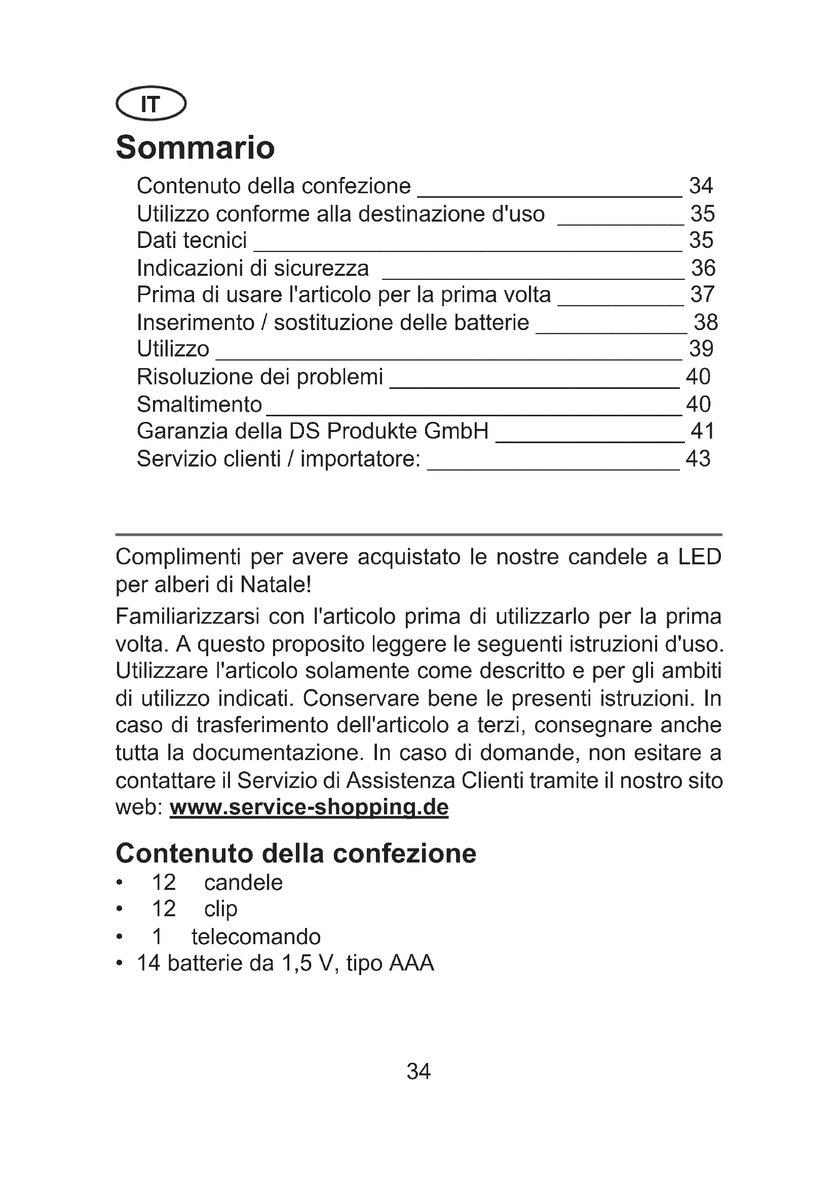 www.service-shopping.de Tél. : +49 38851 314650 *) *) Appel payant. Tous droits réservés.34 Sommario Contenuto della confezione _____________________ 34 Utilizzo conforme alla destinazione d'uso __________ 35 Dati tecnici __________________________________ 35 Indicazioni di sicurezza ________________________ 36 Prima di usare l'articolo per la prima volta __________ 37 Inserimento / sostituzione delle batterie ____________ 38 Utilizzo _____________________________________ 39 Risoluzione dei problemi _______________________ 40 Smaltimento _________________________________ 40 Garanzia della DS Produkte GmbH _______________ 41 Servizio clienti / importatore: ____________________ 43