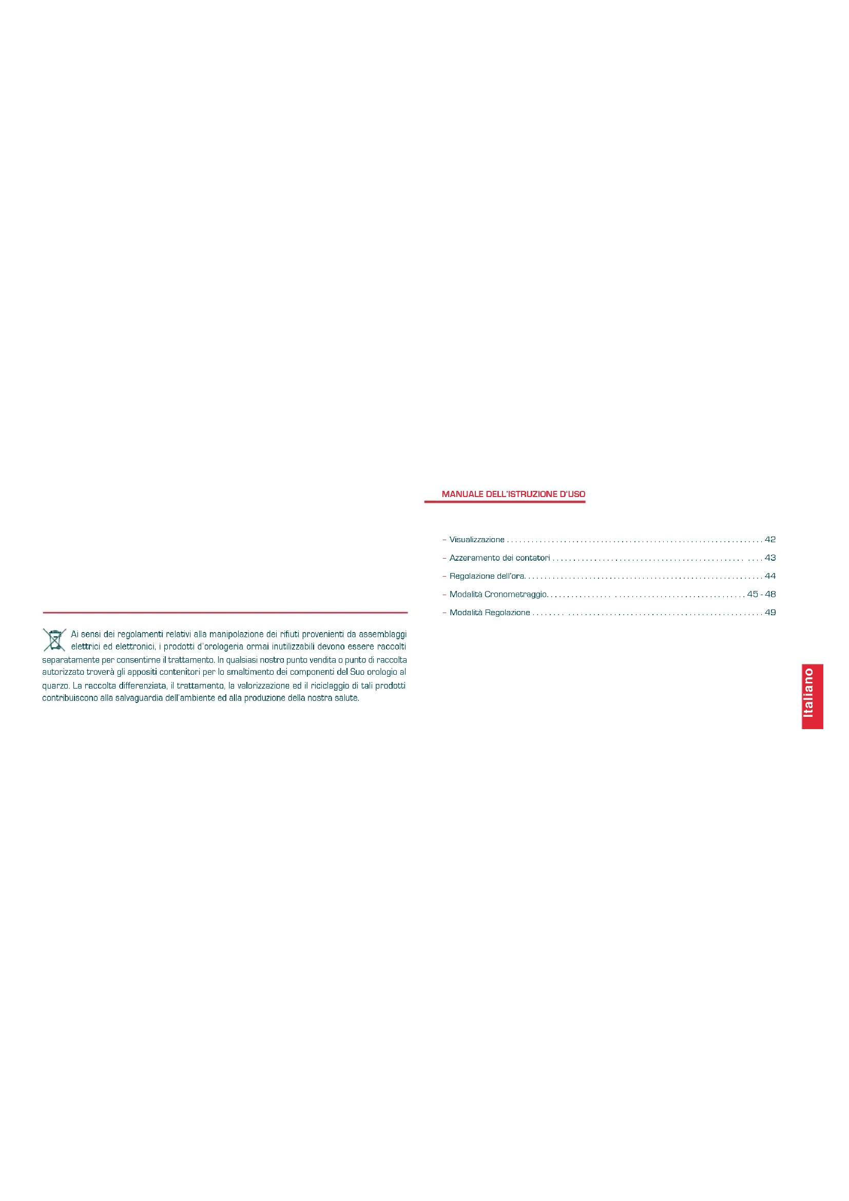 - - 48 – Modalità Regolazione Italiano Ai sensi dei regolamenti relativi alla manipolazione dei rifiuti provenienti da assemblaggi elettrici ed elettronici, i prodotti d’orologeria ormai inutilizzabili devono essere raccolti separatamente per consentirne il trattamento. In qualsiasi nostro punto vendita o punto di raccolta autorizzato troverà gli appositi contenitori per lo smaltimento dei componenti del Suo orologio al quarzo. La raccolta differenziata, il trattamento, la valorizzazione ed il riciclaggio di tali prodotti contribuiscono alla salvaguardia dell’ambiente ed alla produzione della nostra salute.AZZERAMENTO DEI CONTATORI p. 49