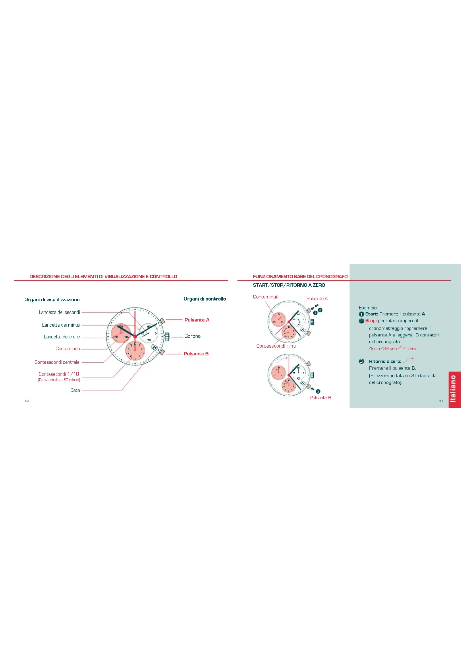 Esempio: Una o varie lancette del cronografo non si trovano nella posizione di ritorno a zero corretta e vanno regolate (ad es. in seguito ad una sostituzione della batteria). Estrarre la corona in posizione III (le 3 lancette del cronografo si azzerano, ritornando nella rispettiva posizione zero, corretta o meno). Premere simultaneamente per almeno 2 secondi i pulsanti A e B (la lancetta del contasecondi centrale ruota di 360º à la modalità di correzione è attivata). Ricollocare la corona in posizione I Fine della regolazione delle lancette del cronografo (possibile in qualsiasi momento).