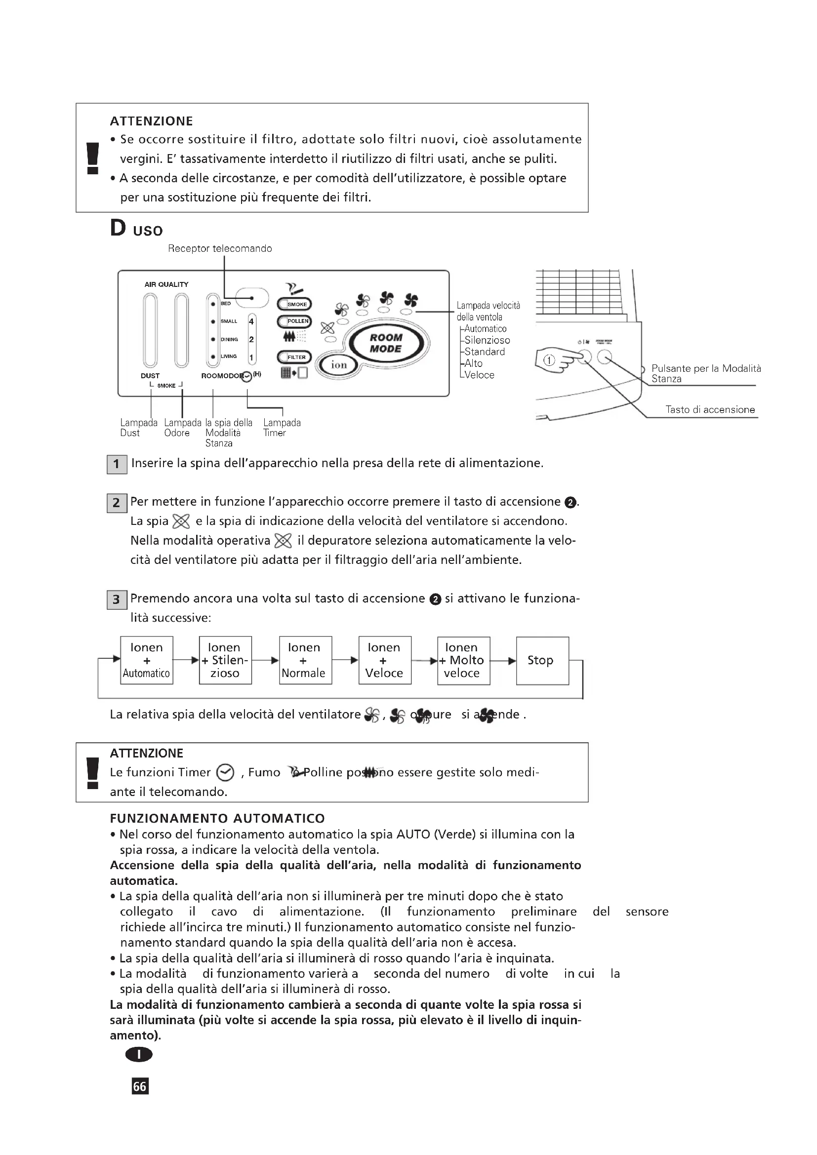 Receptor telecomando Lampada Dust Lampada Odore la spia della Modalità Stanza Lampada Timer Lampada velocità della ventola Automatico Silenzioso Standard Alto Veloce Pulsante per la Modalità Stanza Tasto di accensione(e.g.) ModalitàSalottoVelocitàdelleventole 2 ModalitàcameradalettoVelocitàdelleventole Ioni+Veloce Ioni+Veloce SMOKEPOLLENFILTERAIR QUALITY BED SMALLDININGLIVING DUST ROOMODORSMOKE