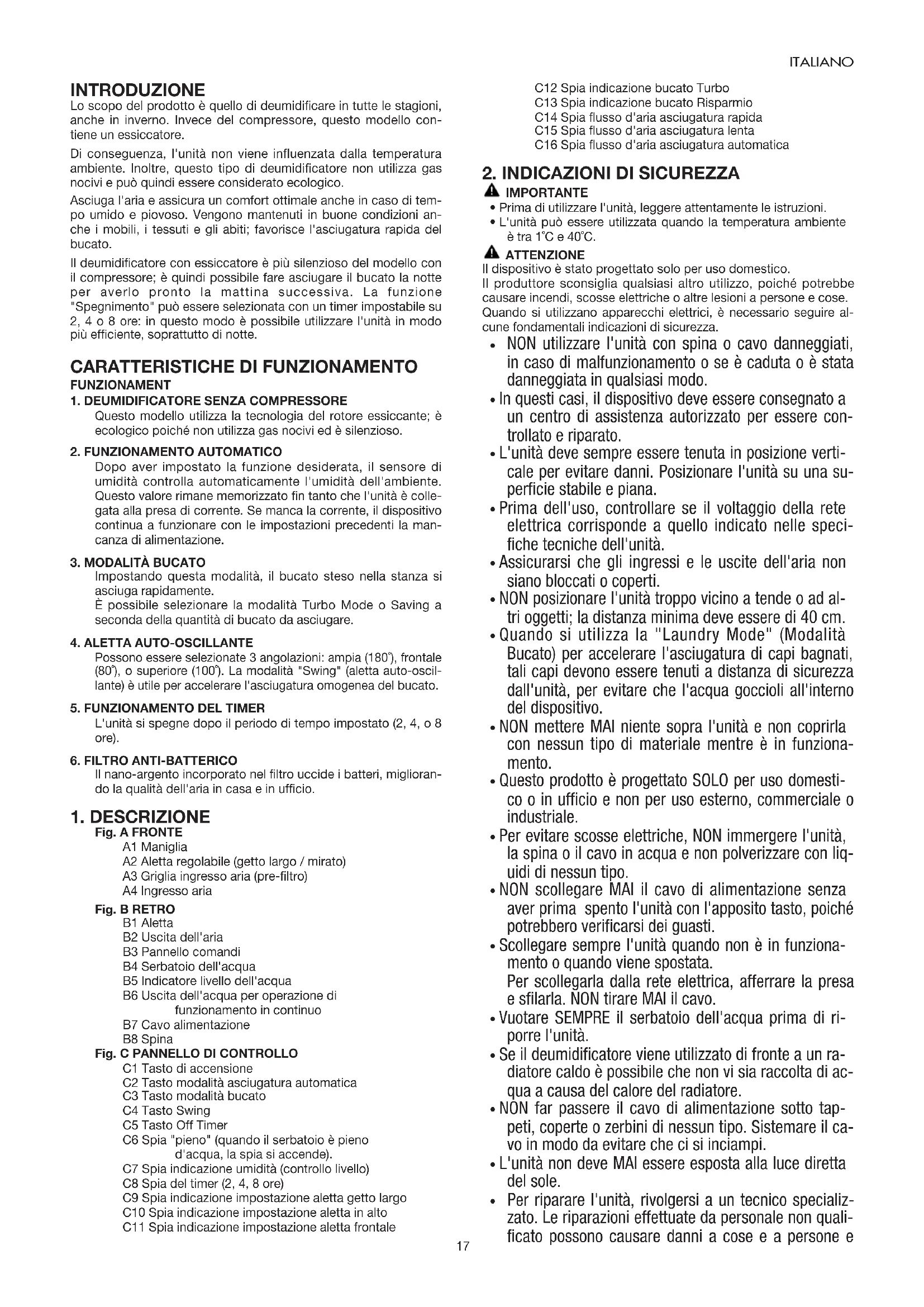 Fig. A FRONTE A1 Maniglia A2 Aletta regolabile (getto largo / mirato) A3 Griglia ingresso aria (pre-filtro) A4 Ingresso aria Fig. B RETRO B1 Aletta B2 Uscita dell'aria B3 Pannello comandi B4 Serbatoio dell'acqua B5 Indicatore livello dell'acqua B6 Uscita dell'acqua per operazione di funzionamento in continuo B7 Cavo alimentazione B8 Spina Fig. C PANNELLO DI CONTROLLO C1 Tasto di accensione C2 Tasto modalità asciugatura automatica C3 Tasto modalità bucato C4 Tasto Swing C5 Tasto Off Timer C6 Spia "pieno" (quando il serbatoio è pieno d'acqua, la spia si accende). C7 Spia indicazione umidità (controllo livello) C8 Spia del timer (2, 4, 8 ore) C9 Spia indicazione impostazione aletta getto largo C10 Spia indicazione impostazione aletta in alto C11 Spia indicazione impostazione aletta frontale C12 Spia indicazione bucato Turbo C13 Spia indicazione bucato Risparmio C14 Spia flusso d'aria asciugatura rapida C15 Spia flusso d'aria asciugatura lenta C16 Spia flusso d'aria asciugatura automatica