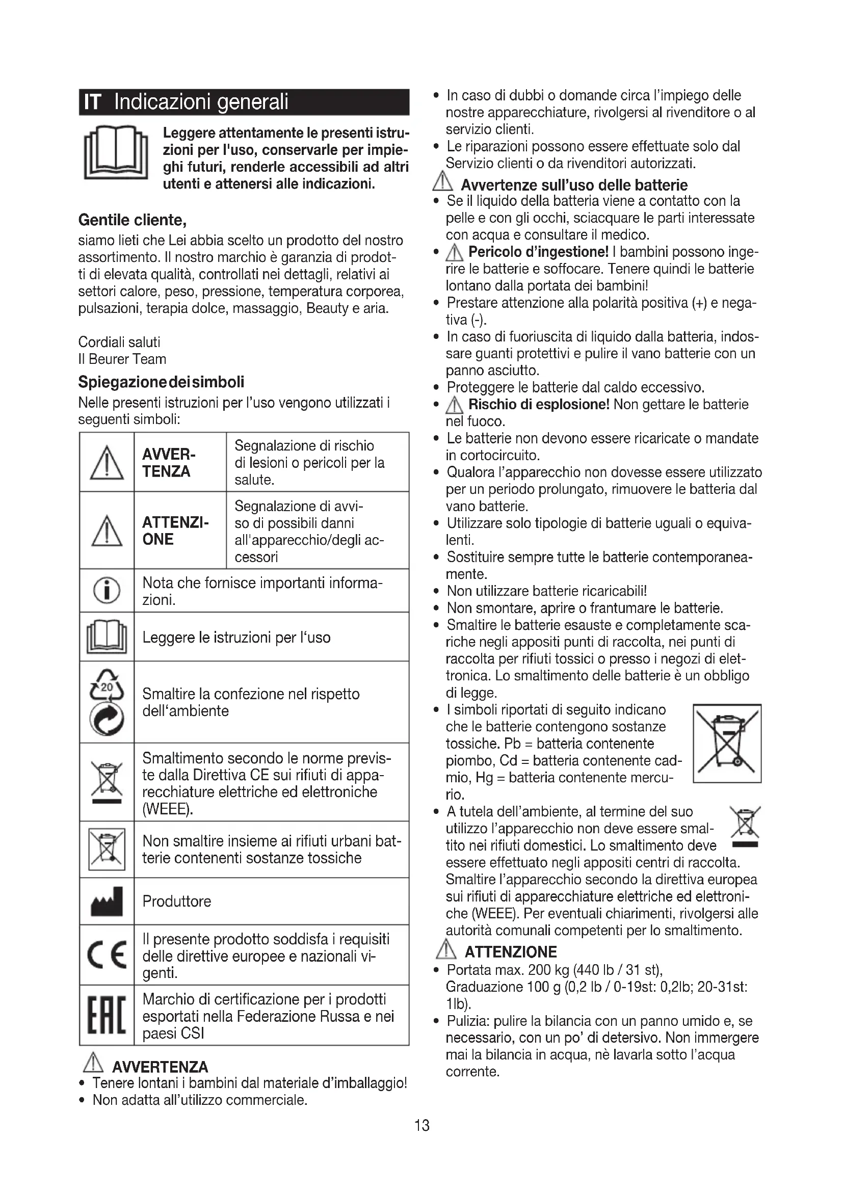 sivamente a scopo personale, in ambito domestico. Vale il diritto tedesco. Nel caso in cui il prodotto, durante il periodo di garan- zia, si dimostrasse incompleto o presentasse difetti di funzionamento in linea con le seguenti disposizioni, Beurer provvederà a sostituire o riparare gratuitamente il prodotto in base alle presenti condizioni di garanzia. Per segnalare un caso di garanzia, l‘acquirente de- ve rivolgersi innanzitutto al proprio rivenditore lo- cale: vedere l‘elenco „Service International“ in cui sono riportati gli indirizzi dei centri di assistenza. L‘acquirente riceverà quindi informazioni più dettagli- ate sulla gestione del caso di garanzia, ad esempio dove deve inviare il prodotto e quali documenti sono necessari. L‘attivazione della garanzia viene presa in considerazi- one solo se l‘acquirente può presentare – una copia della fattura/prova d‘acquisto e – il prodotto originale a Beurer o a un partner Beurer autorizzato. Sono espressamente esclusi dalla presente garanzia – l‘usura dovuta al normale utilizzo o al consumo del prodotto; – gli accessori forniti assieme a questo prodotto che, in caso di utilizzo conforme, si consumano o si esauriscono (ad es. batterie, batterie ricaricabili, manicotti, guarnizioni, elettrodi, lampadine, acces- sori e accessori per inalatore); – i prodotti che sono stati utilizzati, puliti, conserva- ti o sottoposti a manutenzione in modo improprio e/o senza rispettare le disposizioni riportate nelle istruzioni per l‘uso, nonché i prodotti che sono stati aperti, riparati o smontati e rimontati dall‘acquirente o da un centro di assistenza non autorizzato da Beurer; – i danni occorsi nel trasporto dal produttore al clien- te o tra il centro di assistenza e il cliente; – i prodotti acquistati come articoli di seconda scel- ta o usati; – i danni conseguenti che dipendono da un difetto del prodotto (in questo caso possono tuttavia esis- tere diritti derivanti dalla responsabilità per i pro- dotti o da altre disposizioni di legge obbligatorie in materia di responsabilità). Le riparazioni o la sostituzione completa non prolun- gano in alcun caso il periodo di garanzia. Possibili errori e variazioni TR Genel açıklamalar Lütfen bu kullanım kılavuzunu dikkatle okuyun, ileride kullanmak üzere sakla- yın, diğer kullanıcıların erişebilmesini sağlayın ve içindeki yönergelere uyun. Sayın müşterimiz, Ürünlerimizden birini seçtiğiniz için teşekkür ederiz. Isı, ağırlık, kan basıncı, vücut sıcaklığı, nabız, yumuşak terapi, masaj, güzellik ve hava konularında değerli ve titizlikle test edilmiş kaliteli ürünlerimiz, dünyanın her tarafında tercih edilmektedir. Yeni cihazınızı iyi günlerde kullanmanızı dileriz. Beurer Ekibiniz İşaretlerin açıklaması Kullanım kılavuzunda aşağıdaki simgeler kullanılmıştır: UYARI Yaralanma tehlikelerine veya sağlığınızla ilgili tehli- kelere yönelik uyarı. DİKKAT Cihazda/aksesuarlarda meydana gelebilecek ha- sarlara yönelik güvenlik uyarısı. Önemli bilgilere yönelik not. Kullanım kılavuzunu okuyun15 Ambalaj çevreye zarar vermeyecek şekilde bertaraf edilmelidir Elektrikli ve elektronik atık cihazlarla il- gili AB direktifine (WEEE - Waste Elec- trical and Electronic Equipment) uygun şekilde bertaraf edilmelidir Zararlı madde içeren pilleri evsel atıklarla birlikte bertaraf etmeyin Üretici Bu ürün geçerli Avrupa Birliği yönerge- lerinin ve ulusal yönergelerin gereklerini yerine getirmektedir. Rusya ve Bağımsız Devletler Topluluğu ülkelerine ihraç edilecek ürünler için ser