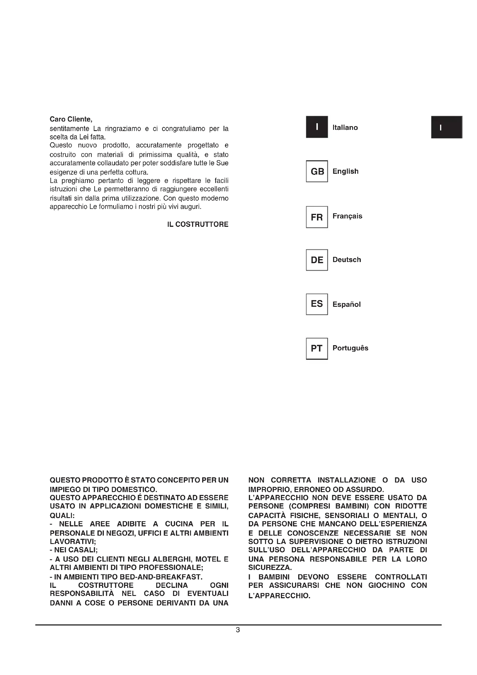 L’APPARECCHIO. Caro Cliente, sentitamente La ringraziamo e ci congratuliamo per la scelta da Lei fatta. Questo nuovo prodotto, accuratamente progettato e costruito con materiali di primissima qualità, e stato accuratamente collaudato per poter soddisfare tutte le Sue esigenze di una perfetta cottura. La preghiamo pertanto di leggere e rispettare le facili istruzioni che Le permetteranno di raggiungere eccellenti risultati sin dalla prima utilizzazione. Con questo moderno apparecchio Le formuliamo i nostri più vivi auguri. IL COSTRUTTORE Italiano