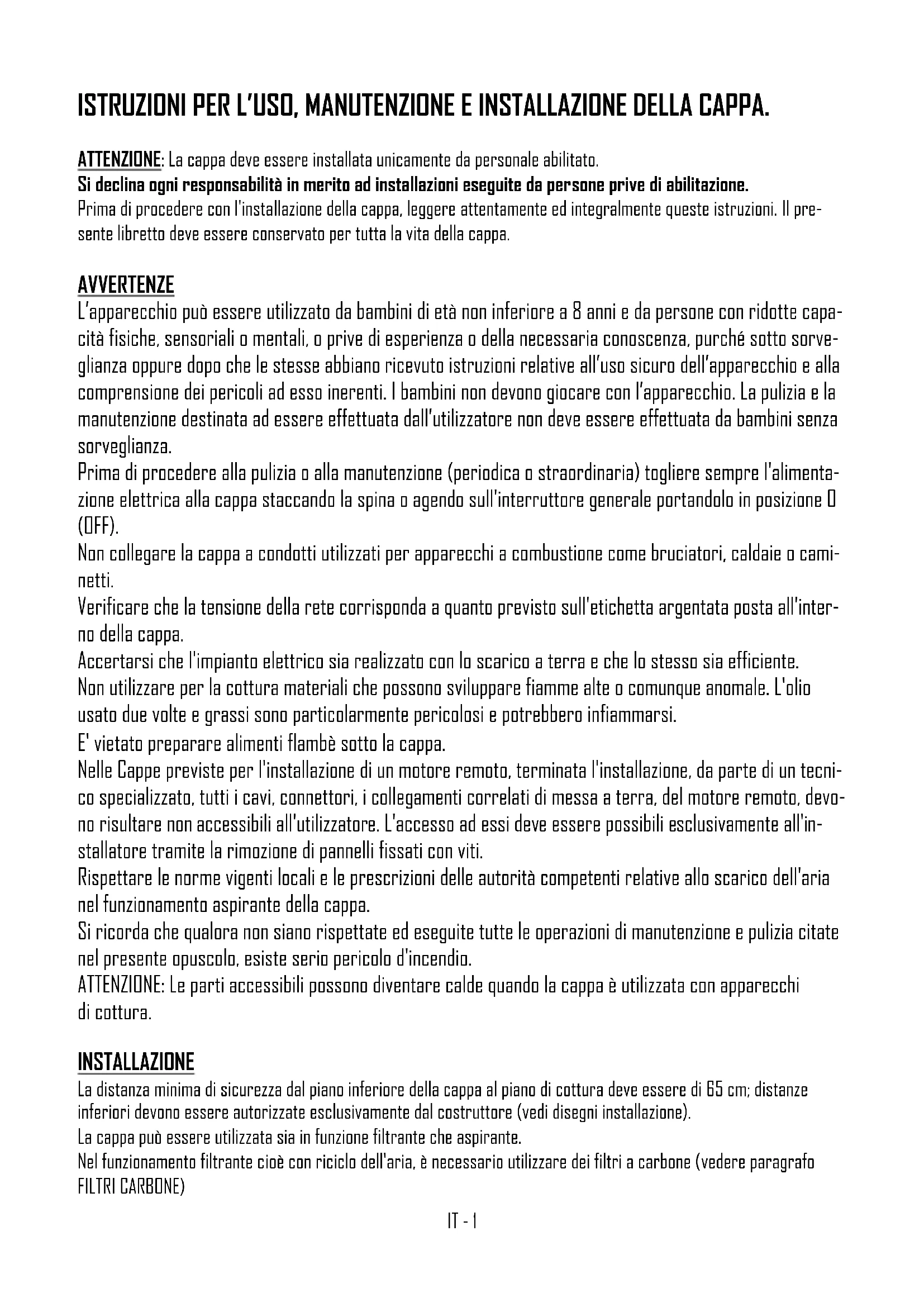 Este produto é conforme à Directiva EU 2002/96/EC. O simbolo do lixo com a barra contido no aparelho indica que o produto, ao terminar a própria vida ùtil , deve ser eliminado separadamente dos lixos domésticos, e deve ser levado a un centro de recolha diferenciada para aparelhagens eléctricas e electrónicas ou entregue ao revendedor onde for comprada uma nova aparelhagem equivalente. O utente è responsável pela entrega do aparelhoàs estruturas apropriadas de recolha no fim da sua vida útil. A recolha apropriada diferenciada para o posterior encaminhamento do aparelho inutilizado à reciclagem, ao tratamento e à eliminação compatìvel com o ambiente, contribui para evitar possiveis efeitos negativos no ambiente e na saùde e facilitar a reciclagem dos materias com os quais o produto è composto. Para informações mais detalhadas inerentes aos sistemas de recolha disponìveis, procure o serviço local de eliminação de lixos, ou dirija-se à loja onde foi efectuada a compra. PTIT - 1 ISTRUZIONI PER L’USO, MANUTENZIONE E INSTALLAZIONE DELLA CAPPA. ATTENZIONE: La cappa deve essere installata unicamente da personale abilitato. Si declina ogni responsabilità in merito ad installazioni eseguite da persone prive di abilitazione. Prima di procedere con l'installazione della cappa, leggere attentamente ed integralmente queste istruzioni. Il pre- sente libretto deve essere conservato per tutta la vita della cappa. AVVERTENZE L’apparecchio può essere utilizzato da bambini di età non inferiore a 8 anni e da persone con ridotte capa- cità fisiche, sensoriali o mentali, o prive di esperienza o della necessaria conoscenza, purché sotto sorve- glianza oppure dopo che le stesse abbiano ricevuto istruzioni relative all’uso sicuro dell’apparecchio e alla comprensione dei pericoli ad esso inerenti. I bambini non devono giocare con l’apparecchio. La pulizia e la manutenzione destinata ad essere effettuata dall’utilizzatore non deve essere effettuata da bambini senza sorveglianza. Prima di procedere alla pulizia o alla manutenzione (periodica o straordinaria) togliere sempre l'alimenta- zione elettrica alla cappa staccando la spina o agendo sull'interruttore generale portandolo in posizione 0 (OFF). Non collegare la cappa a condotti utilizzati per apparecchi a combustione come bruciatori, caldaie o cami- netti. Verificare che la tensione della rete corrisponda a quanto previsto sull'etichetta argentata posta all'inter- no della cappa. Accertarsi che l'impianto elettrico sia realizzato con lo scarico a terra e che lo stesso sia efficiente. Non utilizzare per la cottura materiali che possono sviluppare fiamme alte o comunque anomale. L'olio usato due volte e grassi sono particolarmente pericolosi e potrebbero infiammarsi. E' vietato preparare alimenti flambè sotto la cappa. Nelle Cappe previste per l'installazione di un motore remoto, terminata l'installazione, da parte di un tecni- co specializzato, tutti i cavi, connettori, i collegamenti correlati di messa a terra, del motore remoto, devo- no risultare non accessibili all'utilizzatore. L'accesso ad essi deve essere possibili esclusivamente all'in- stallatore tramite la rimozione di pannelli fissati con viti. Rispettare le norme vigenti locali e le prescrizioni delle autorità competenti relative allo scarico dell'aria nel funzionamento aspirante della cappa. Si ricorda che qualora non siano rispettate ed eseguite tutte le operazioni di manutenzione e pulizia citate nel presente opuscolo, esiste serio pericolo d'incendio. ATTENZIONE: Le parti accessibili possono diventare calde quando la cappa è utilizzata con apparecchi di cottura. INSTALLAZIONE La distanza minima di sicurezza dal piano inferiore della cappa al piano di cottura deve essere di 65 cm; distanze inferiori devono essere autorizzate esclusivamente dal costruttore (vedi disegni installazione). La cappa può essere utilizzata sia in funzione filtrante che aspirante. Nel funzionamento filtrante cioè con riciclo dell'aria, è necessario utilizzare dei filtri a carbone (vedere paragrafo